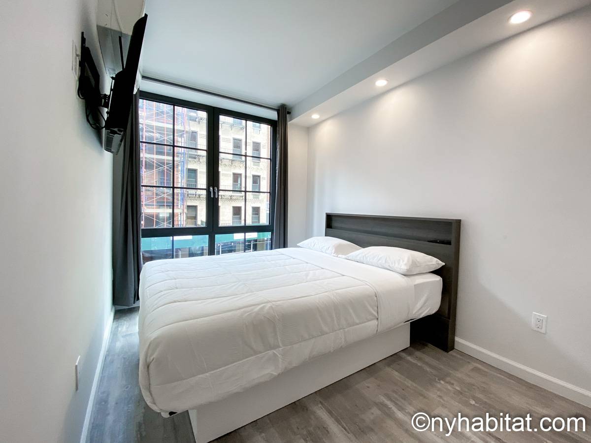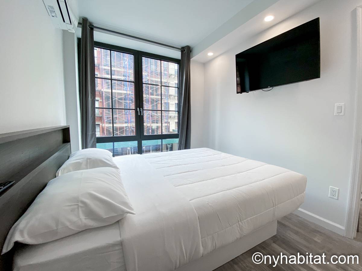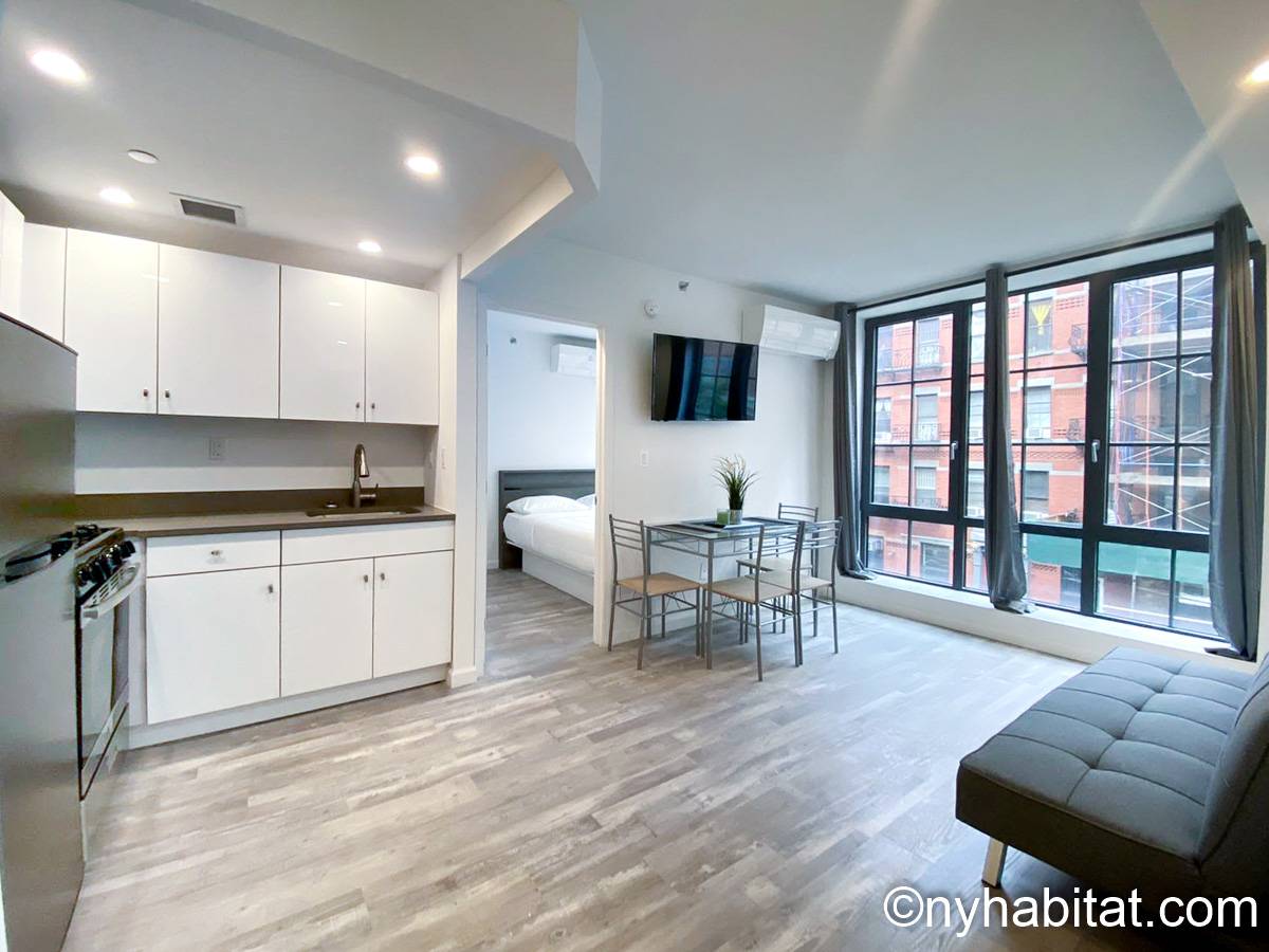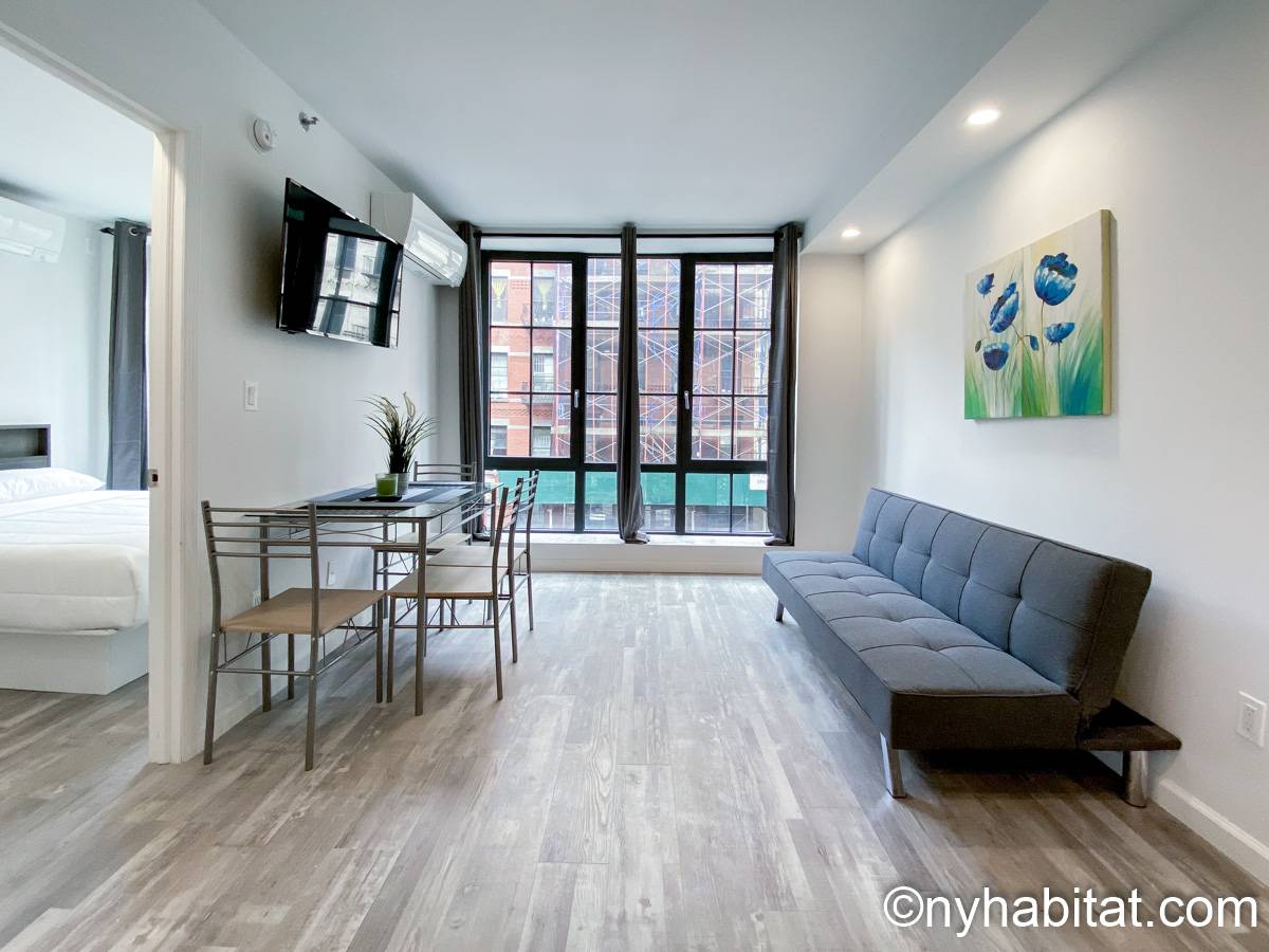 The interior photos are from a model apartment in the building. The model apartment is representative of both the quality and style of apartments offered at this location. Description, floor plan and photos are for reference purposes only. Actual apartment's dimensions, layouts and furniture may vary. On the corner of West 53rd Street and 10th Avenue, this two-bedroom furnished apartment is located in the middle of Manhattan, New York City. This is Midtown West, a neighborhood that borders the Hudson River. This furnished rental, a 600-square-foot space, sits on the third floor (equivalent to the second floor in Europe) of an elevator building. Large windows allow in nautral light, and there is a laundry room in the building and a security system.