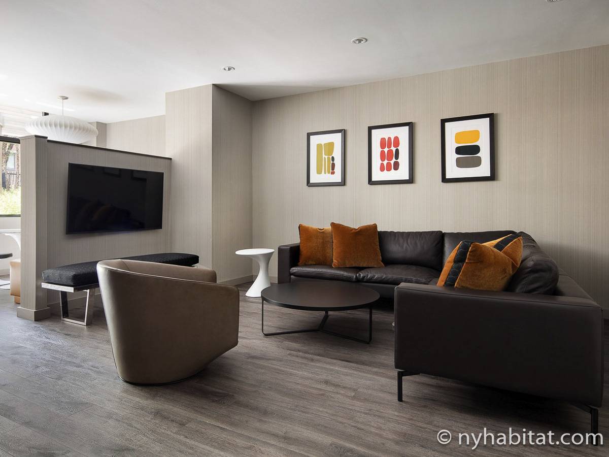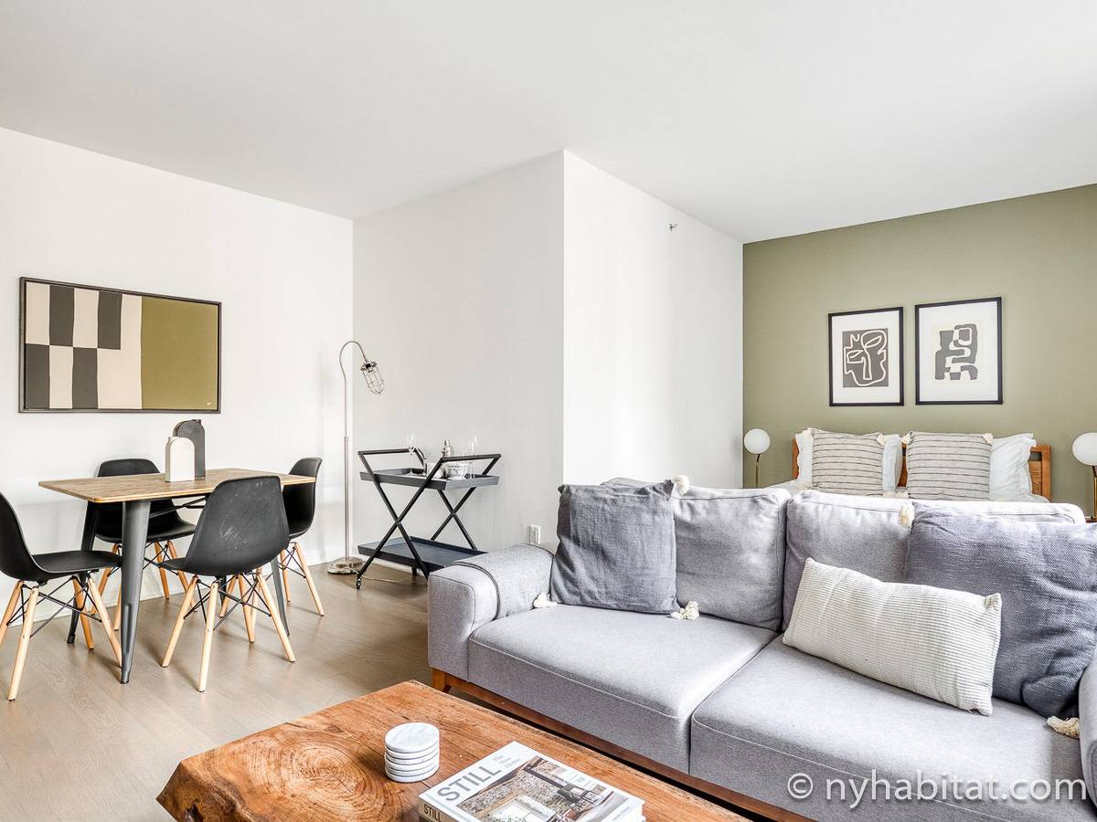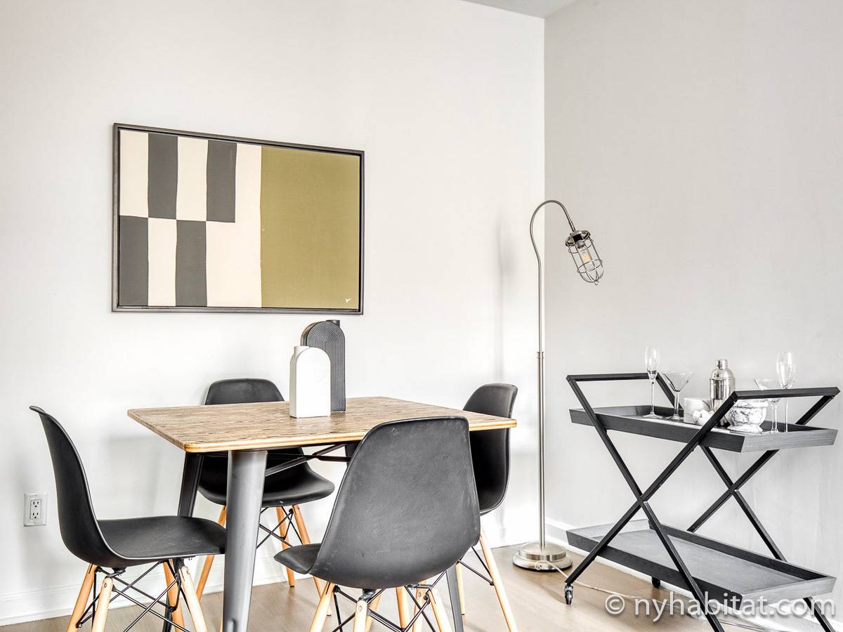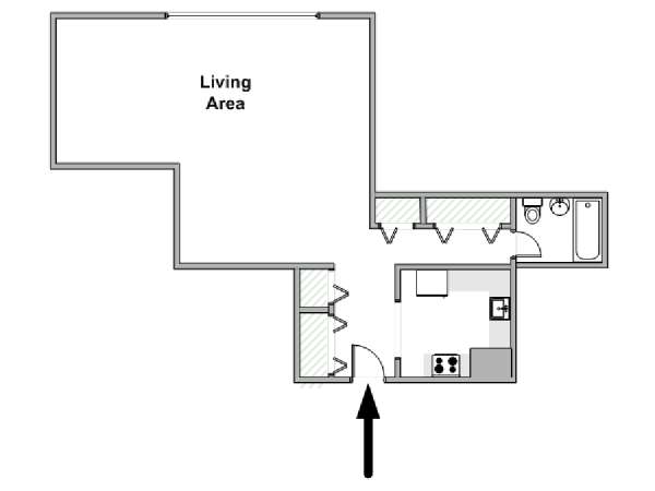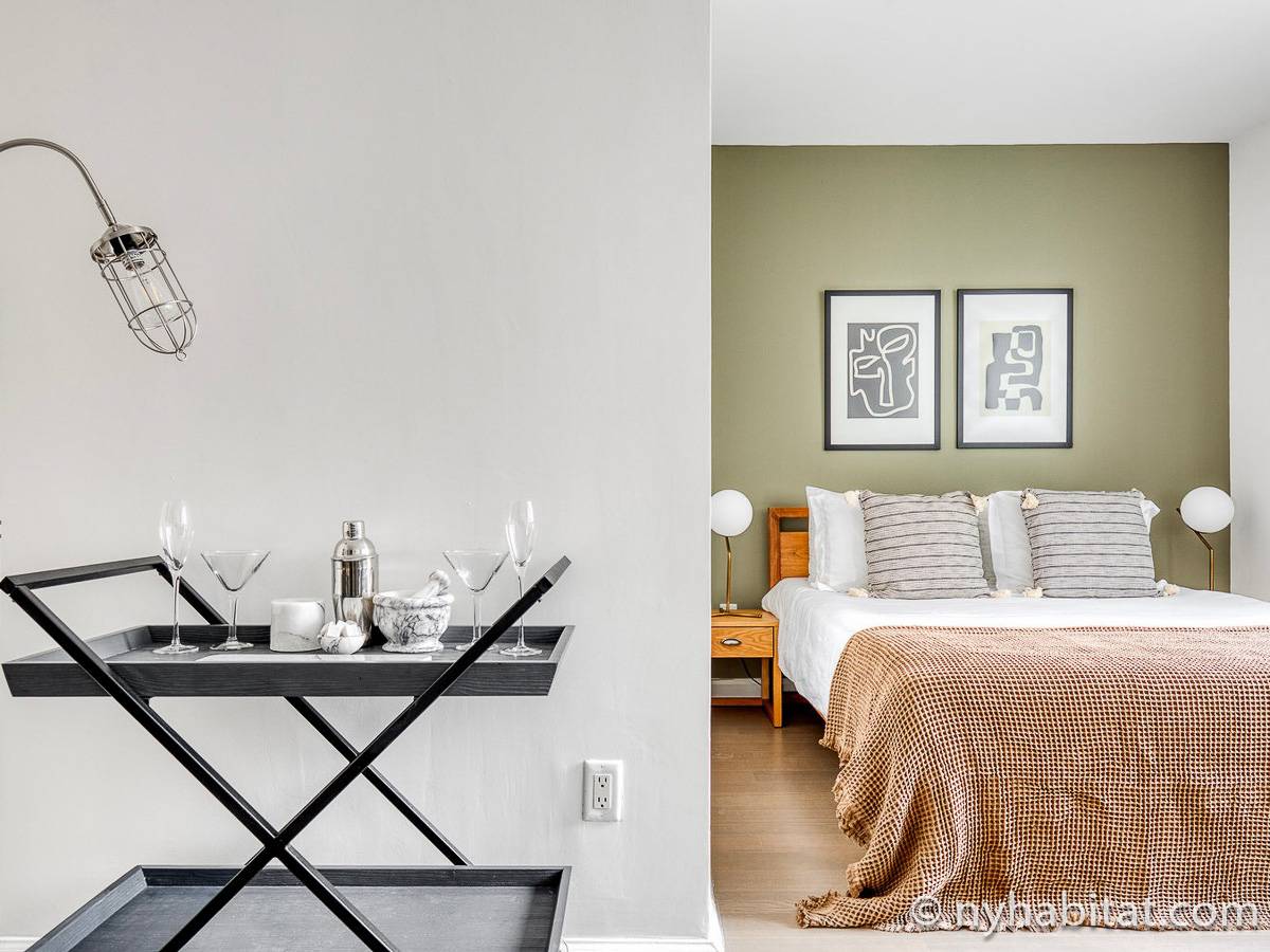 This private studio apartment available for rent will be perfect for any guest in need of long term accommodations. Hardwood floors and base moulding can be seen throughout the entire apartment. A large window in the living area covers one wall of the apartment and provides ample amounts of natural light to the space as well as great views of the neighborhood below. A widescreen television and modern furnishings complete the space. A dining area connected to the living room comfortably seats four guests and includes a mini bar. A bedroom behind the living room area includes a queen size bed and modern decor. Natural light from the window in the living room also adds natural light to the bedroom. The kitchen is separated from the living and dining space. Modern appliances and white cabinets provide lots of room for storage. Guests will have access to a private bathroom with tiled walls and a bathtub and shower combo. Additional highlights of the building include an elevator for easy access to the unit, gym facility for guests and tenants, laundry on site, and a private garden.