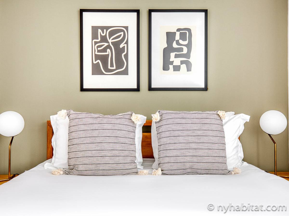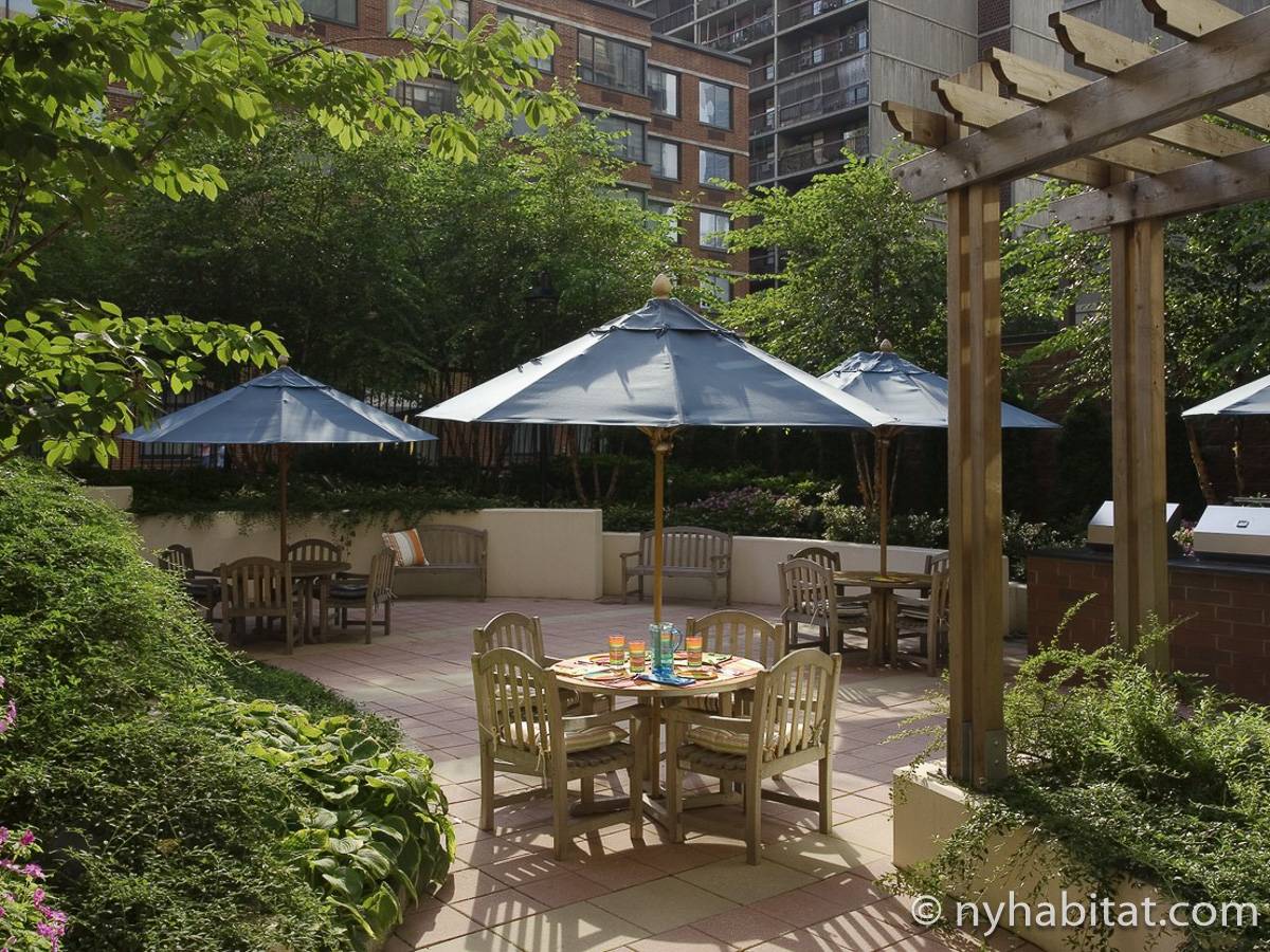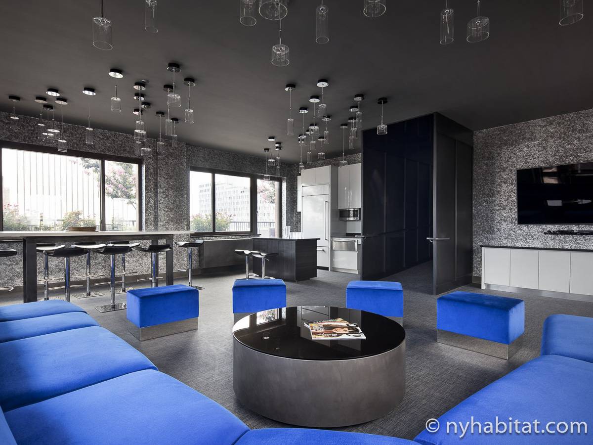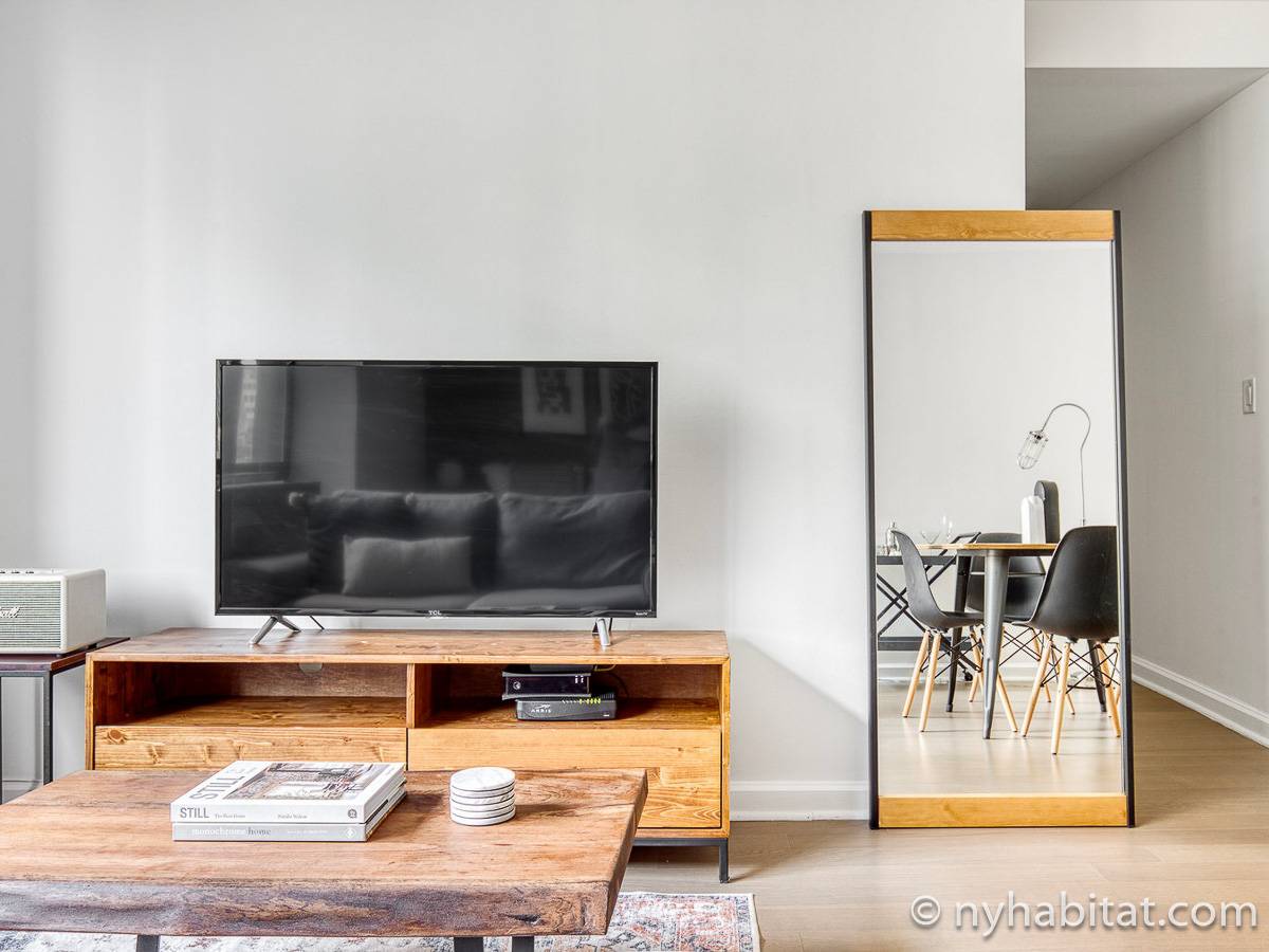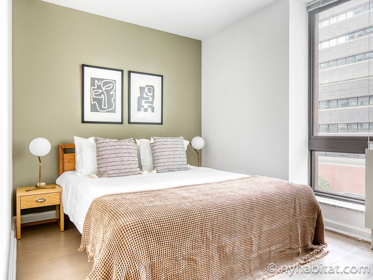 This private studio apartment available for rent will be perfect for any guest in need of long term accommodations. Hardwood floors and base moulding can be seen throughout the entire apartment. A large window in the living area covers one wall of the apartment and provides ample amounts of natural light to the space as well as great views of the neighborhood below. A widescreen television and modern furnishings complete the space. A dining area connected to the living room comfortably seats four guests and includes a mini bar. A bedroom behind the living room area includes a queen size bed and modern decor. Natural light from the window in the living room also adds natural light to the bedroom. The kitchen is separated from the living and dining space. Modern appliances and white cabinets provide lots of room for storage. Guests will have access to a private bathroom with tiled walls and a bathtub and shower combo. Additional highlights of the building include an elevator for easy access to the unit, gym facility for guests and tenants, laundry on site, and a private garden.