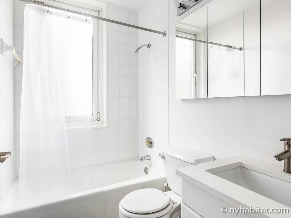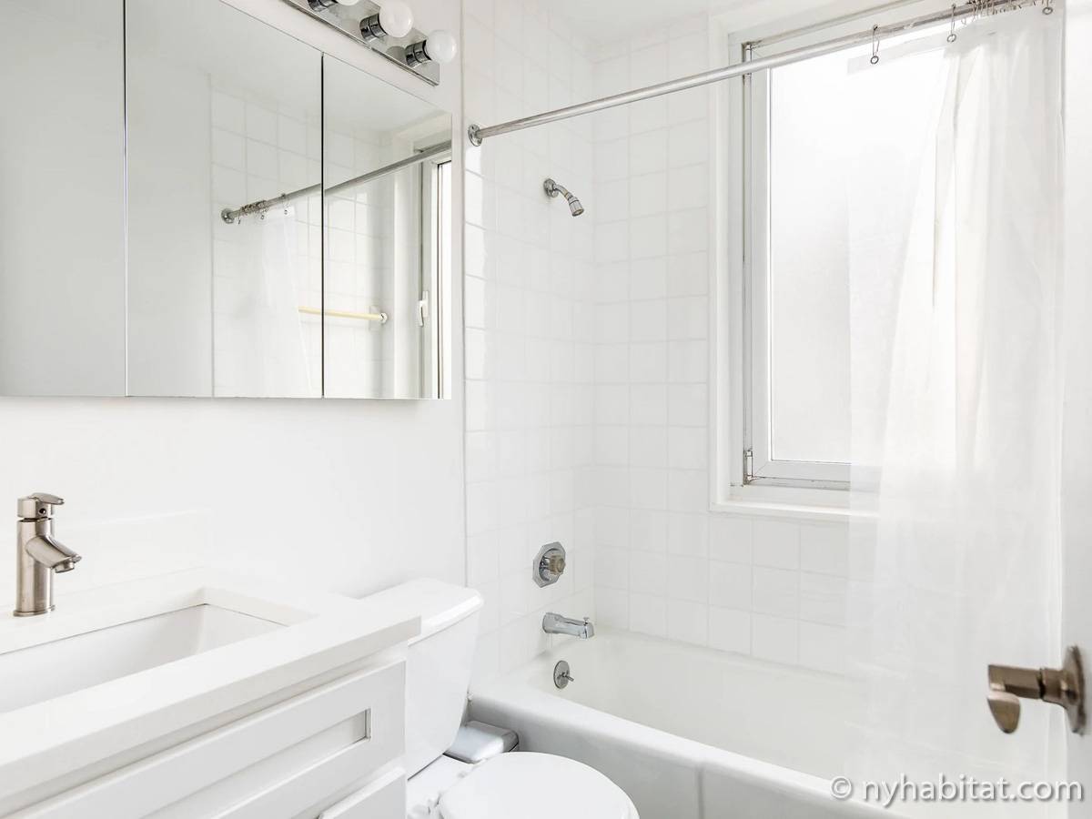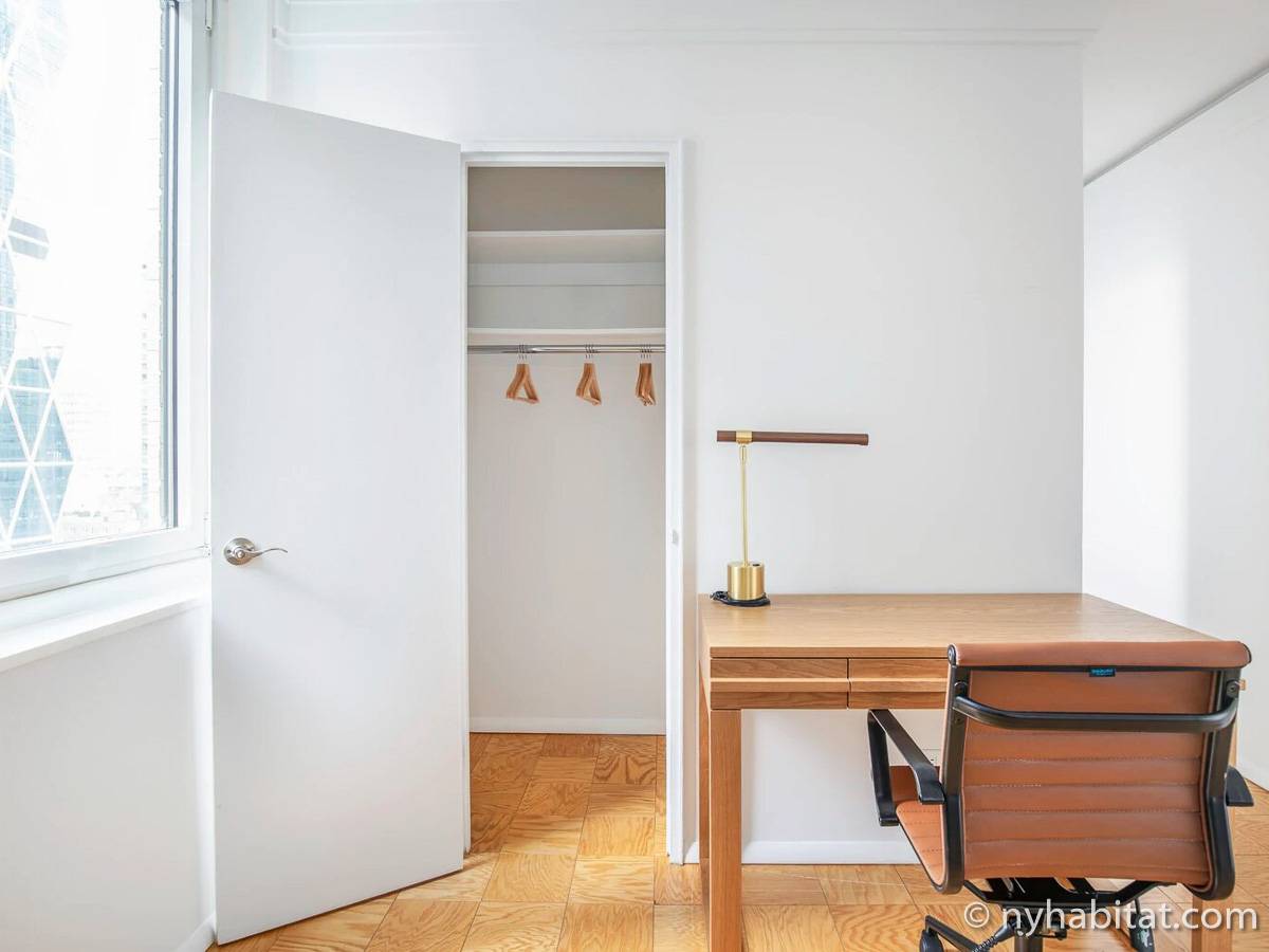 Both of the bedrooms include an AC unit, queen-sized beds with sheets, and fully sized closets! Both bedrooms carry a unique brown and gray contrast. One bedroom includes an individual desk and chair! The two bedrooms hold windows to brighten the rooms during the day. The two bathrooms have white tiles and include a shower and tub, and a window. Such exclusivity and well-furnished living areas are rare to find, especially within Hell’s Kitchen!
