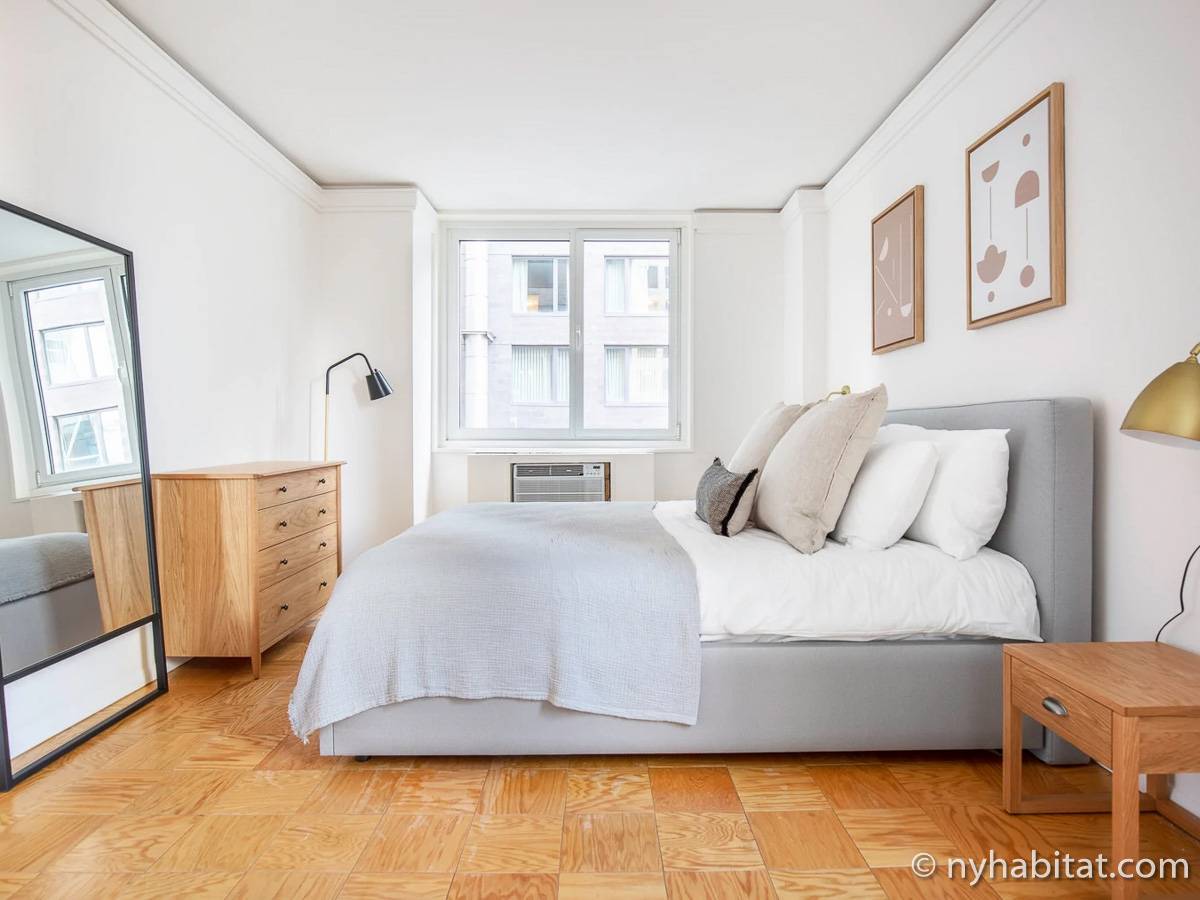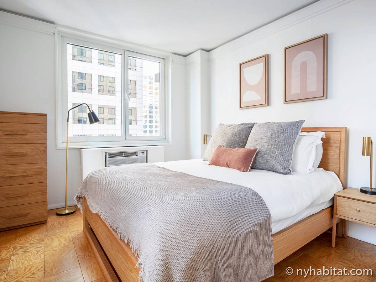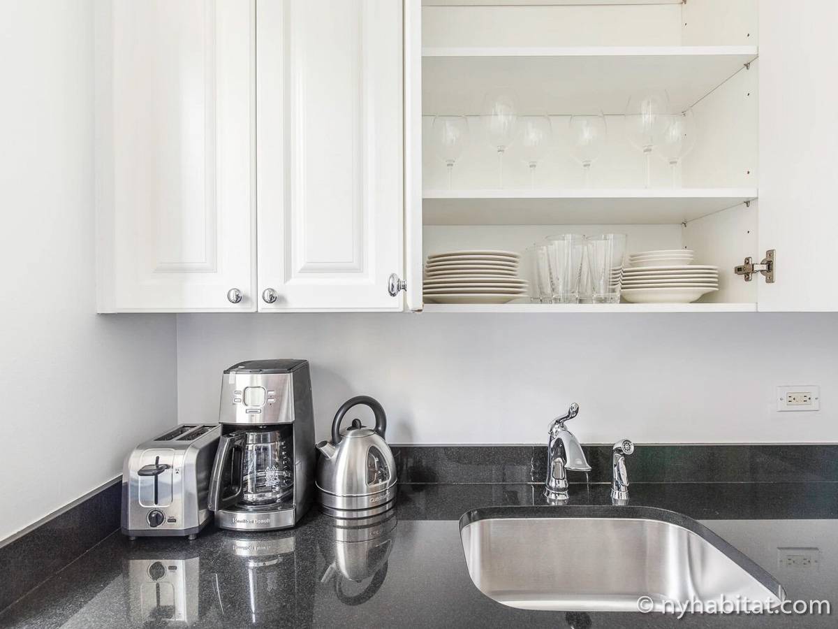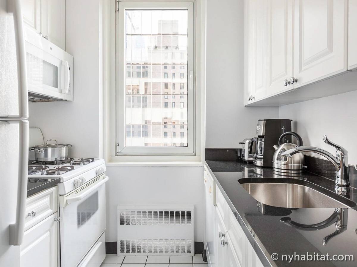 This individual apartment allows the resident to revel in exclusivity. As you walk in, the contemporary, fully furnished living room – with a brown, black and white aesthetic, includes a sofa, a dining table, a TV! The living room is accommodated with a large-scale window/ glass door, providing a good view of the city. As you open the window/door, you can step out onto the balcony, relax, and hear the sounds and life of New York City. The kitchen acquires white walls and cabinets that allow a bright aesthetic to the apartment. The black marble top counter brings a perfect contrast to this beautiful, bright kitchen. The kitchen is equipped with a dishwasher, coffee maker, toaster, fridge, freezer, microwave, and an oven.