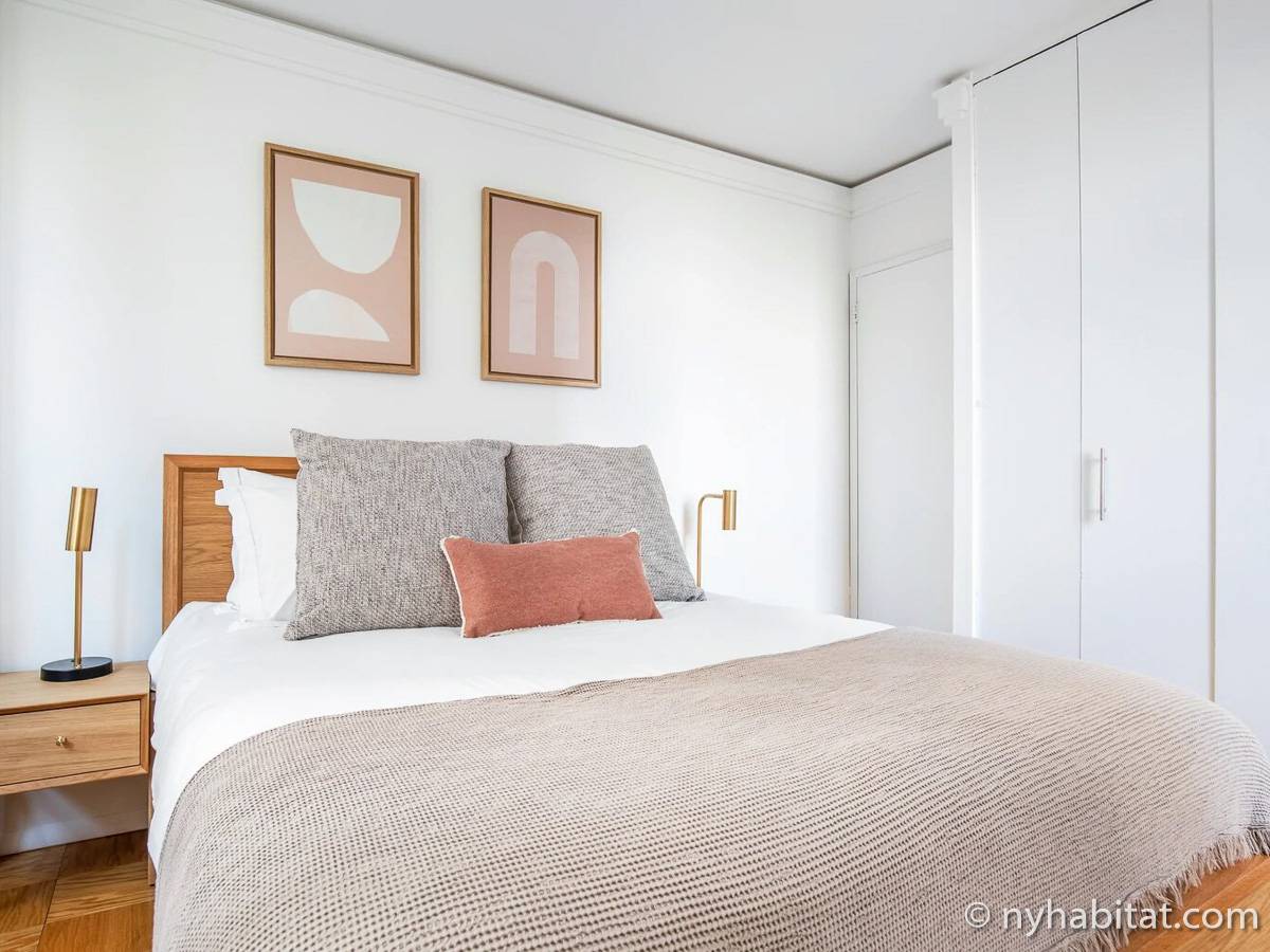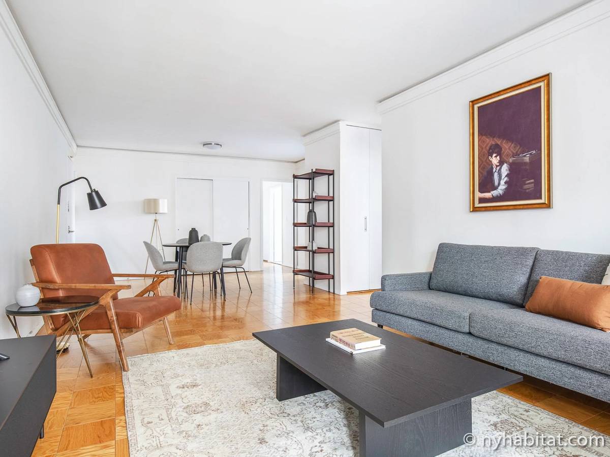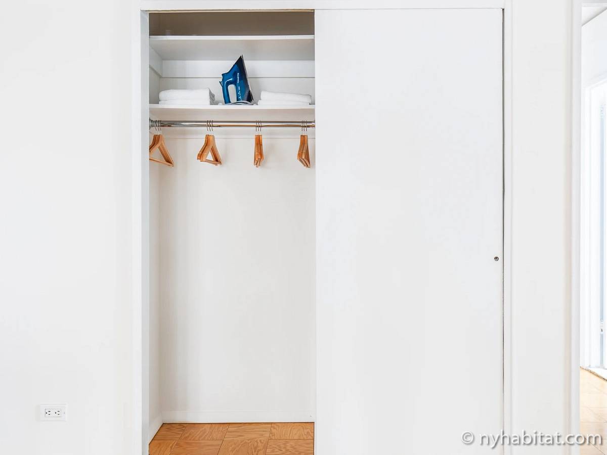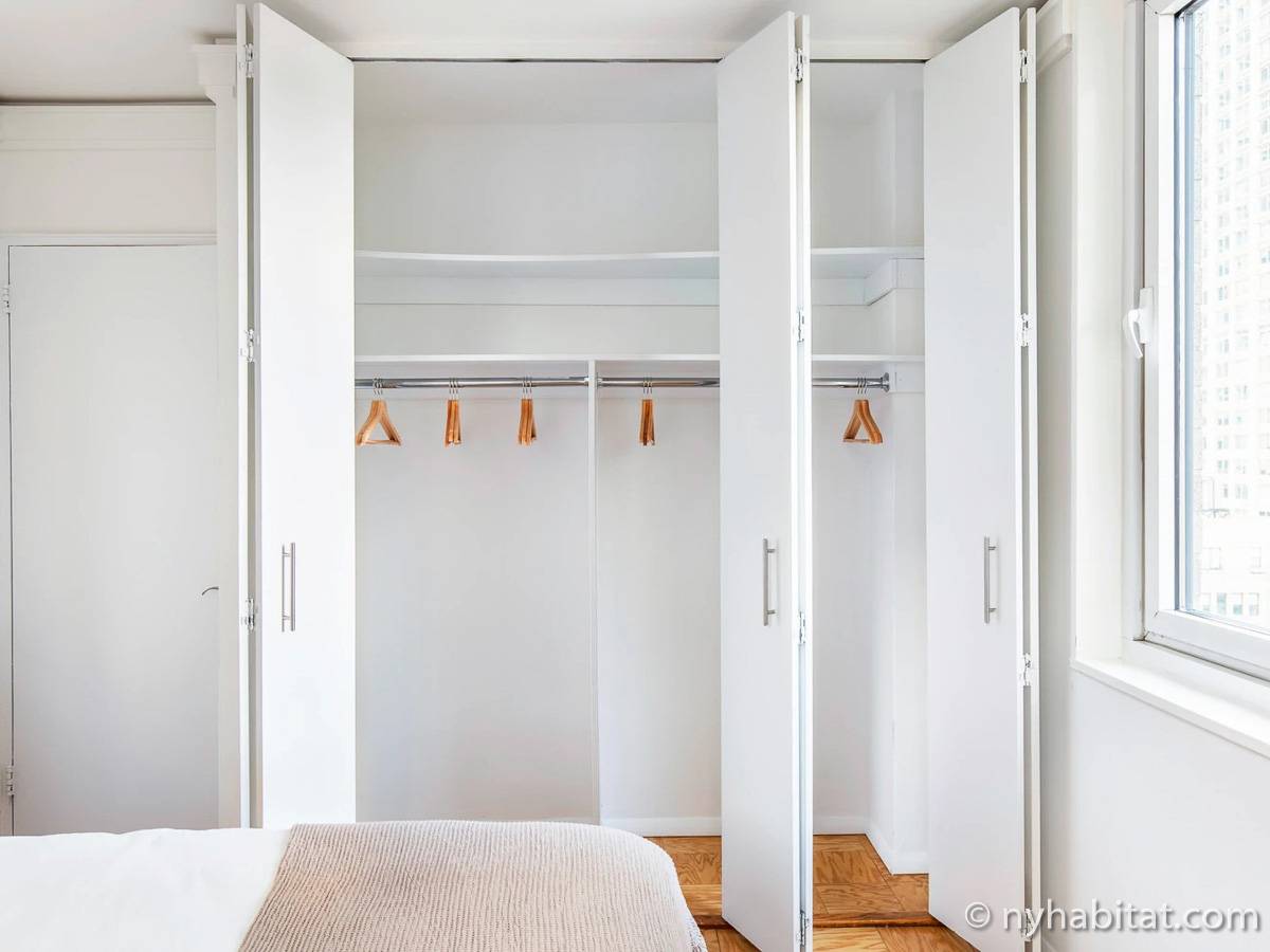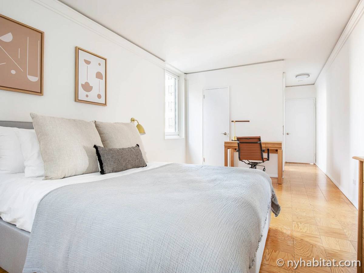 This individual apartment allows the resident to revel in exclusivity. As you walk in, the contemporary, fully furnished living room – with a brown, black and white aesthetic, includes a sofa, a dining table, a TV! The living room is accommodated with a large-scale window/ glass door, providing a good view of the city. As you open the window/door, you can step out onto the balcony, relax, and hear the sounds and life of New York City. The kitchen acquires white walls and cabinets that allow a bright aesthetic to the apartment. The black marble top counter brings a perfect contrast to this beautiful, bright kitchen. The kitchen is equipped with a dishwasher, coffee maker, toaster, fridge, freezer, microwave, and an oven.