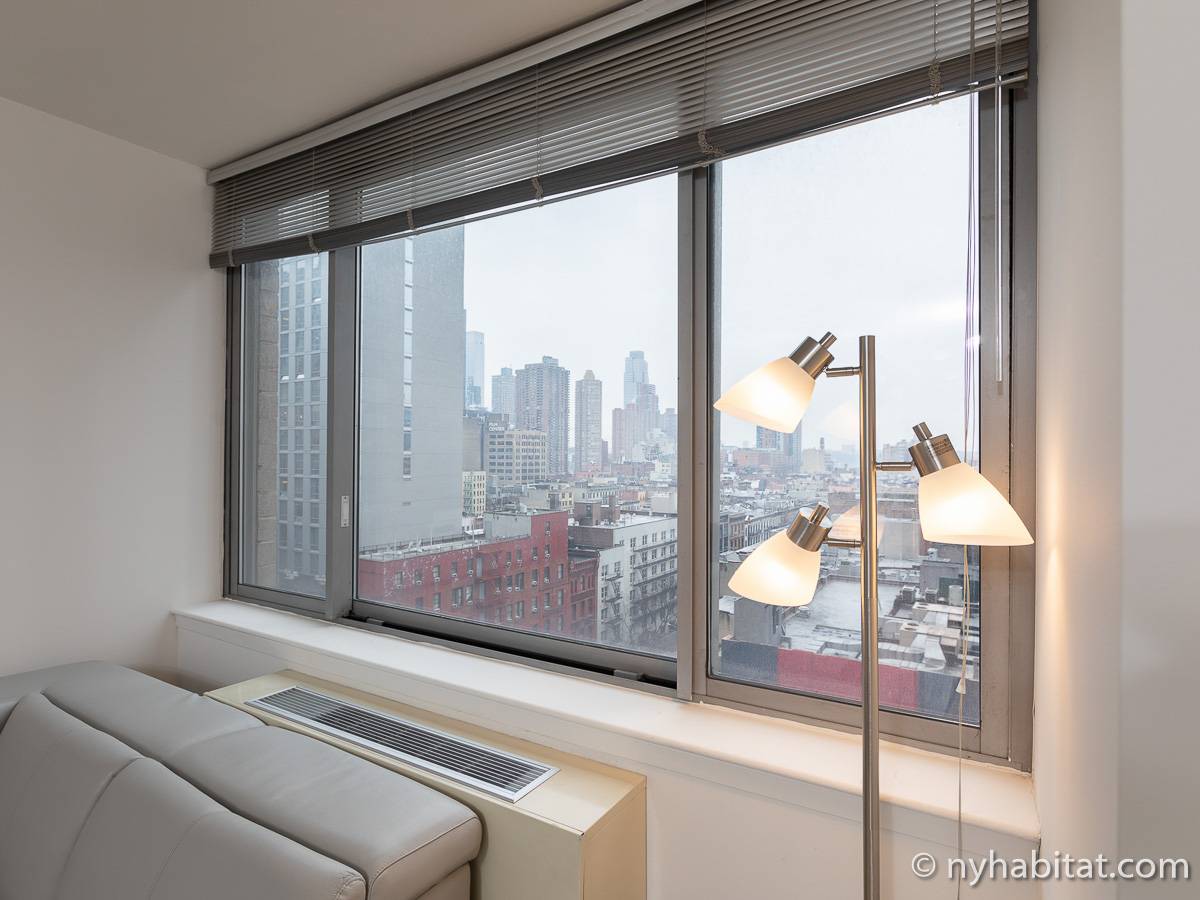 This apartment is located on the tenth floor (same as the ninth floor in Europe) of a high rise building. When you get off the elevator to your new apartment, you will walk in and immediately notice the kitchen. The open kitchen has wood cabinetry a refrigerator, freezer, coffeemaker, microwave, toaster, dishwasher, and an oven. From there you will see the dining table for four, towards the living room. The living room includes an L shaped sofa, an AC unit, and a TV. As you make your way towards the bedroom you will see the huge windows right with a beautiful and full cityscape, opposite your bed. There is a fully furnished full sized bed with sheets, an AC unit, and a TV. Finally in the bathroom there is a shower- tub, towels, and a water closet.