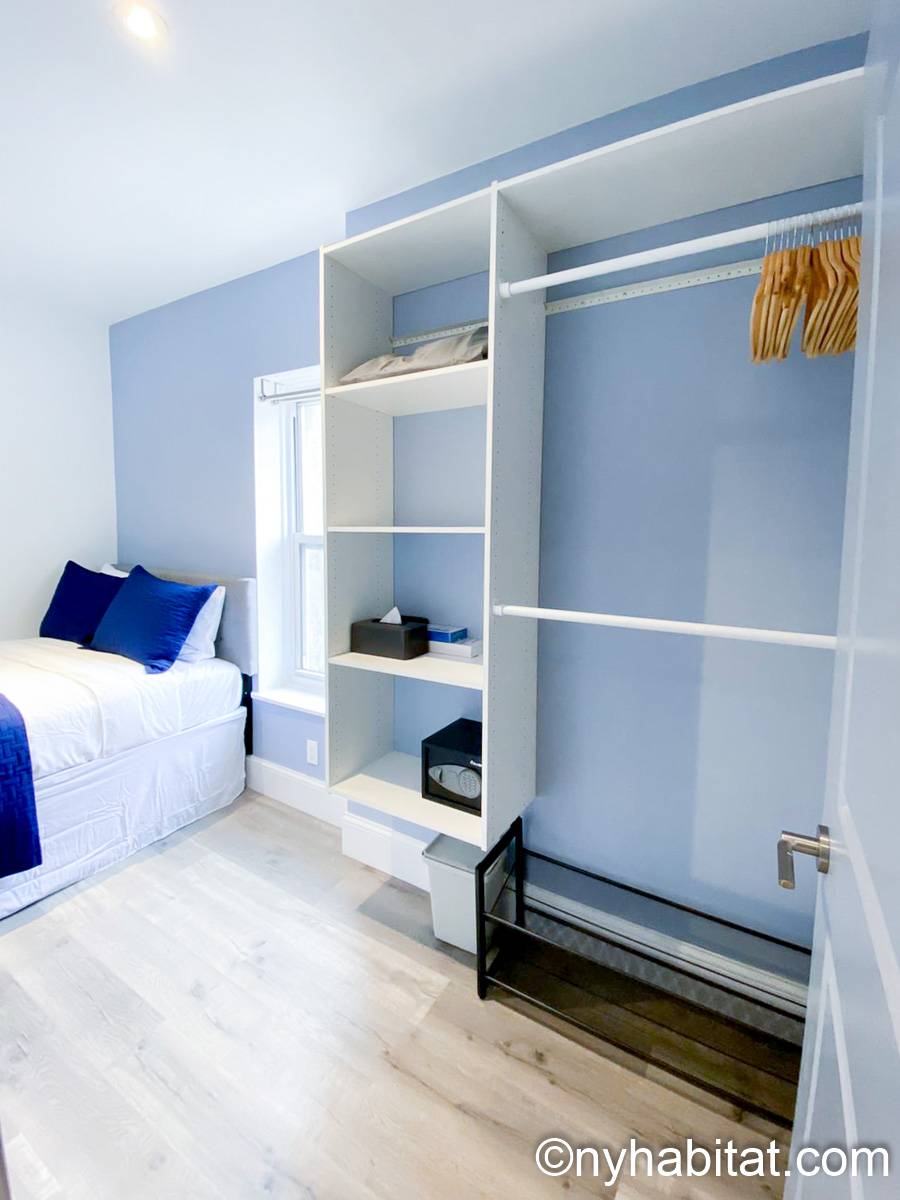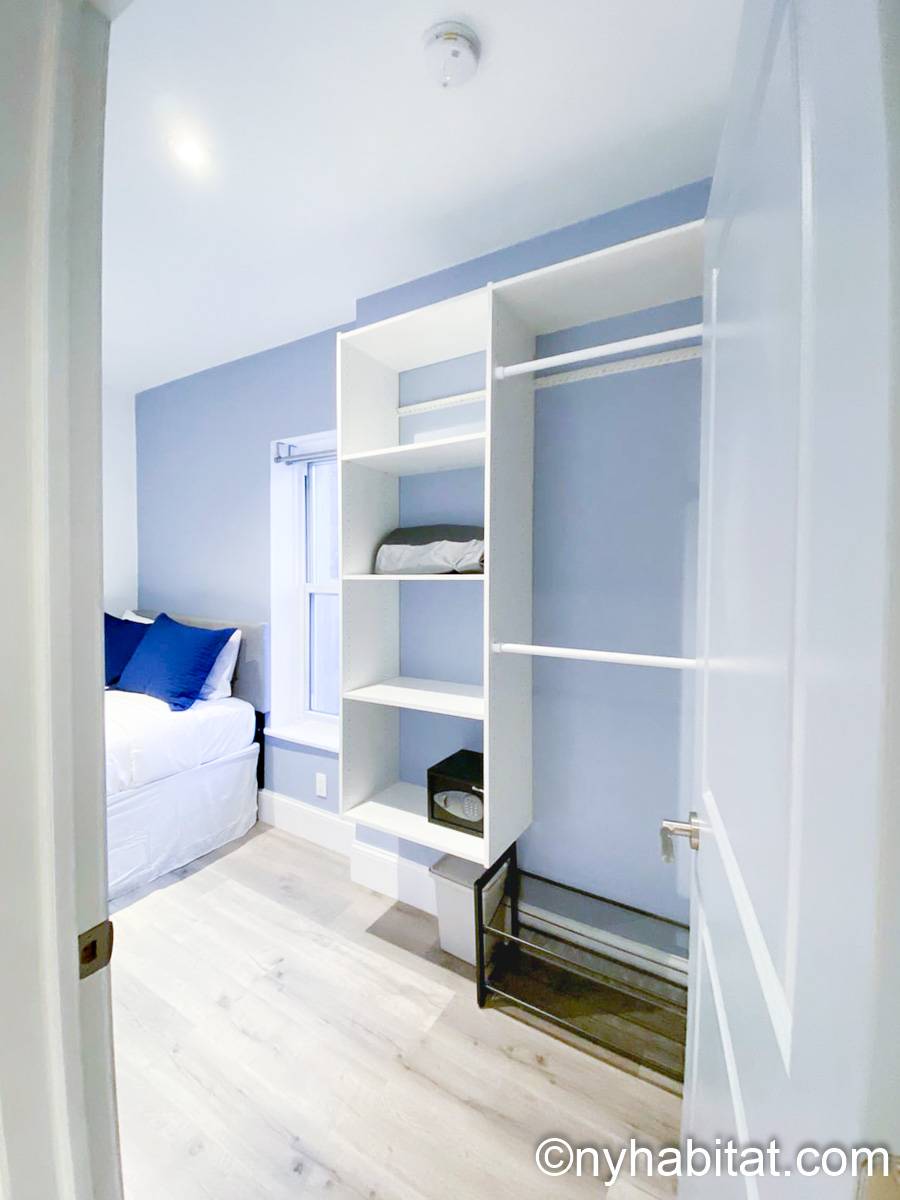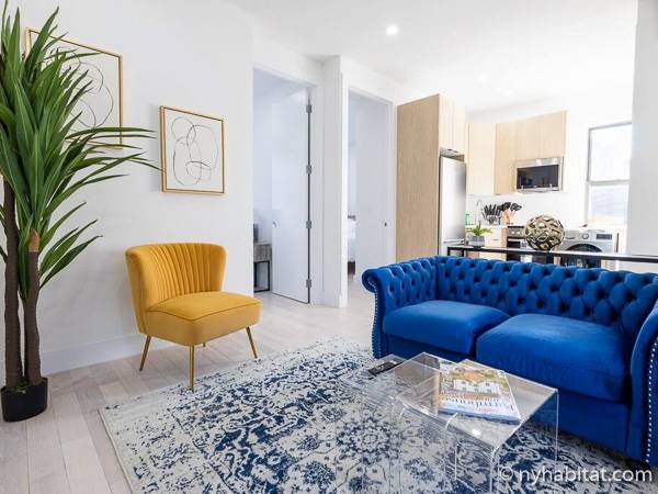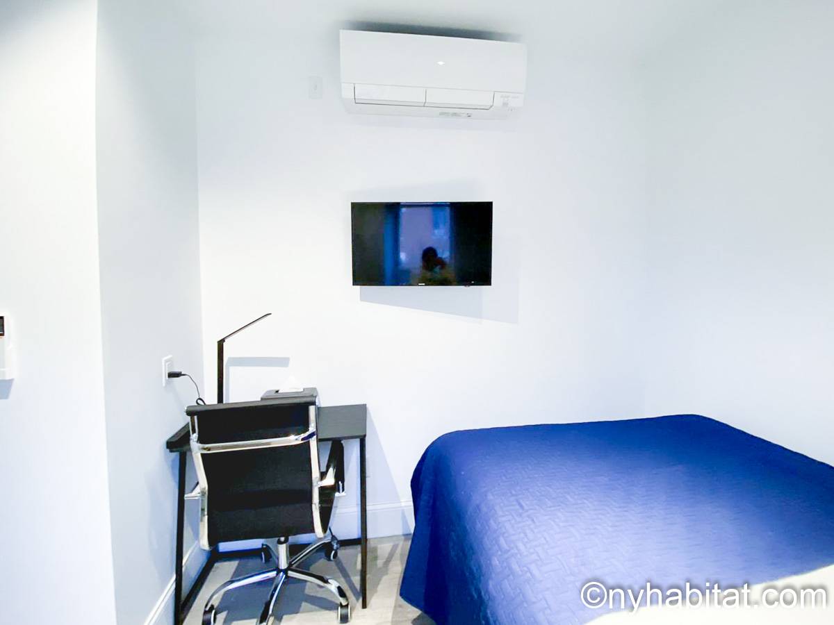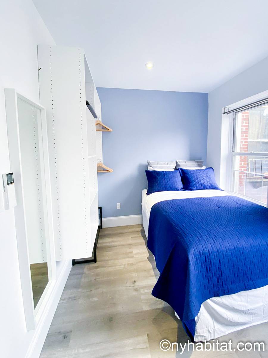 This 290-square-foot (around 27 m2) furnished apartment sits on the top floor of a 5-story building near East 5th Street and 2nd Avenue. This is East Village, Manhattan, a storied New York neighborhood. The furnished rental is a 2-bedroom space.