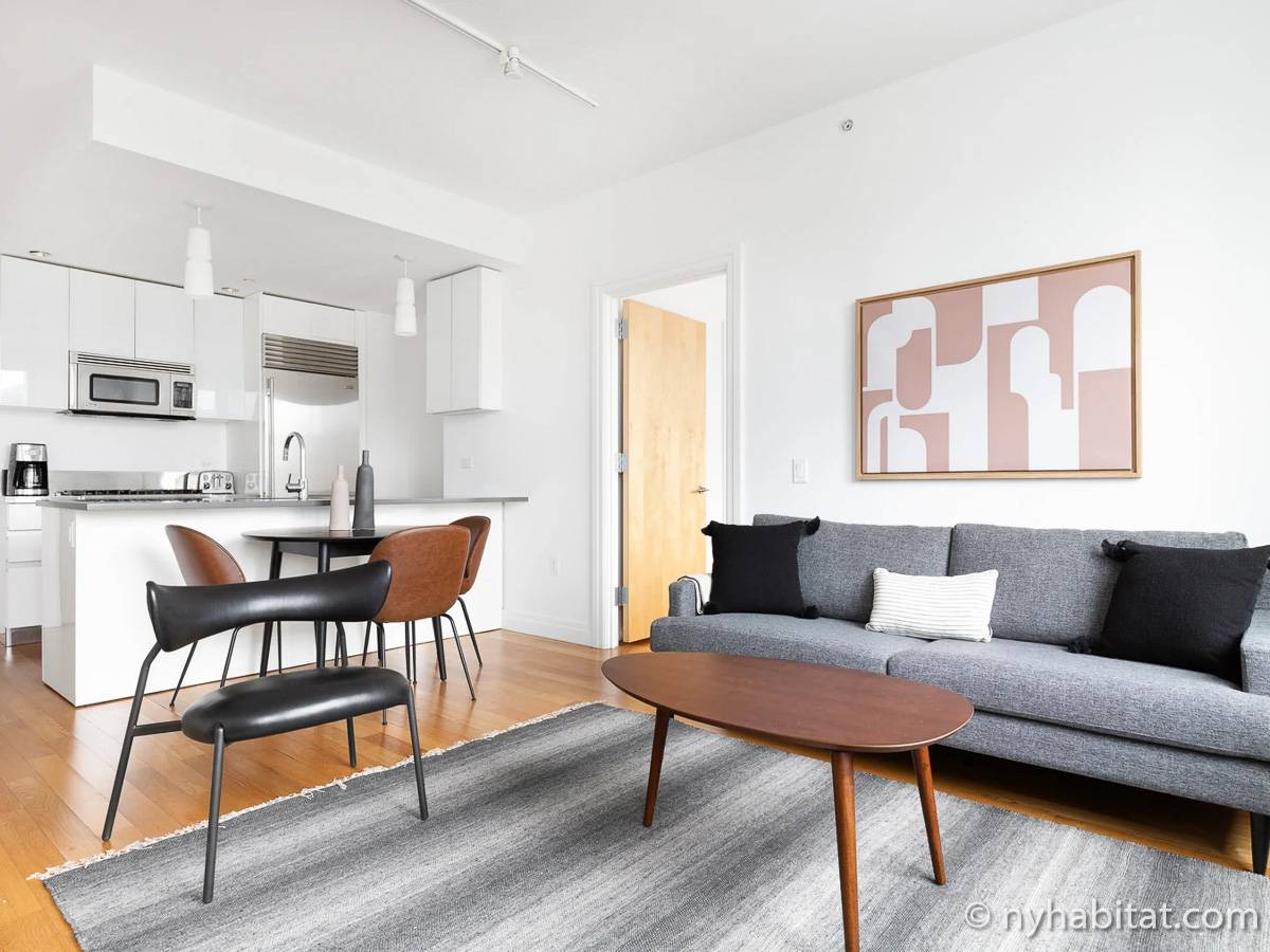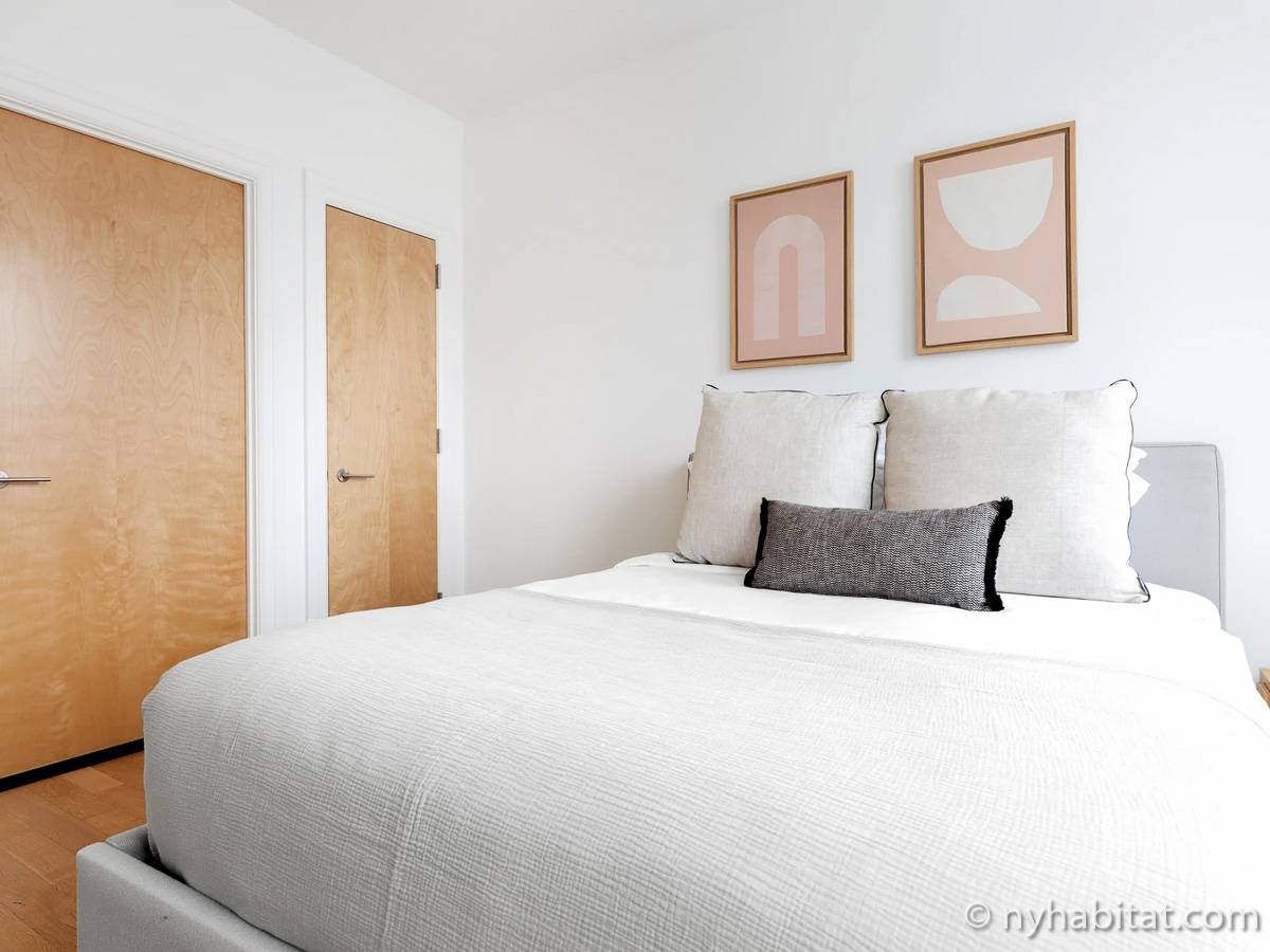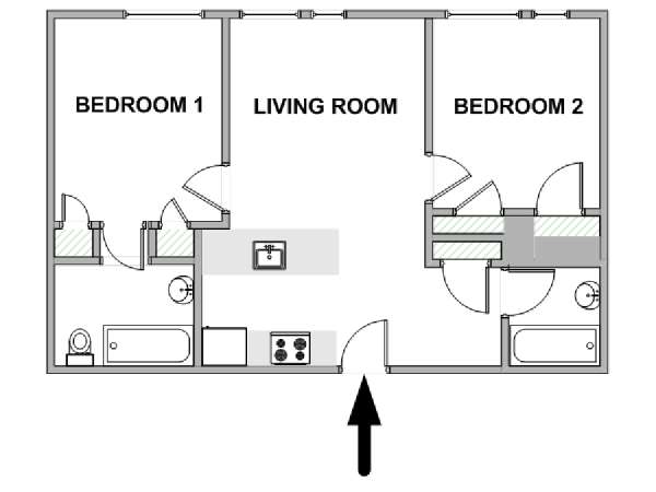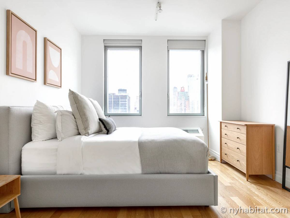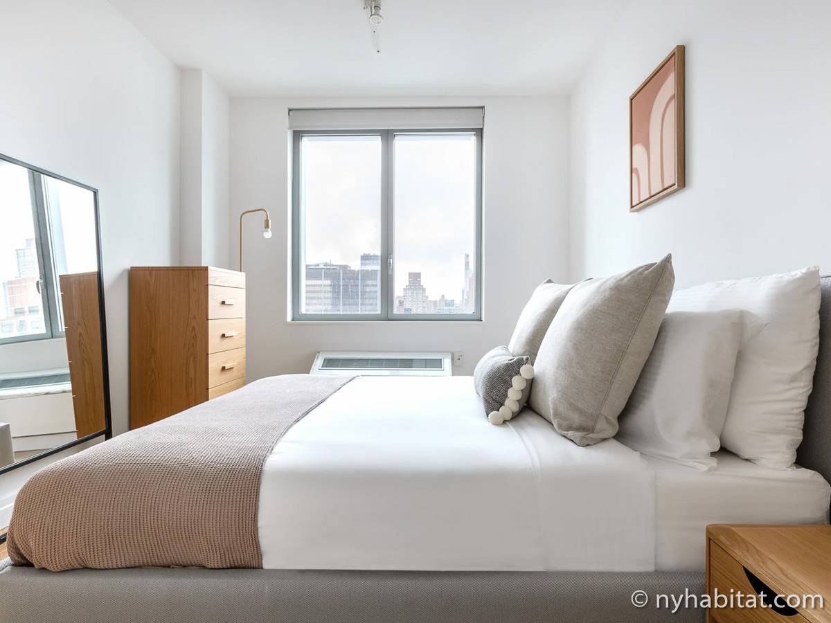 This apartment sits on the twenty-third floor, (equivalent to the twenty-second floor in Europe). Upon entering the space, you will notice a modern living room with two windows (one a double-sized window) overlooking some of Manhattan. The living room also includes a coffee table, a sofa, a TV, and air conditioning. The kitchen is adjacent to the living room which includes white cabinetry as well as a refrigerator, oven, toaster, and coffeemaker. In the first bedroom, you will find a queen-size bed along with modern furniture and closet space. In the second bedroom, there is a second queen-size bed and a nightstand, dresser, and more closet space. Finally, both bathrooms include a tub and shower head.