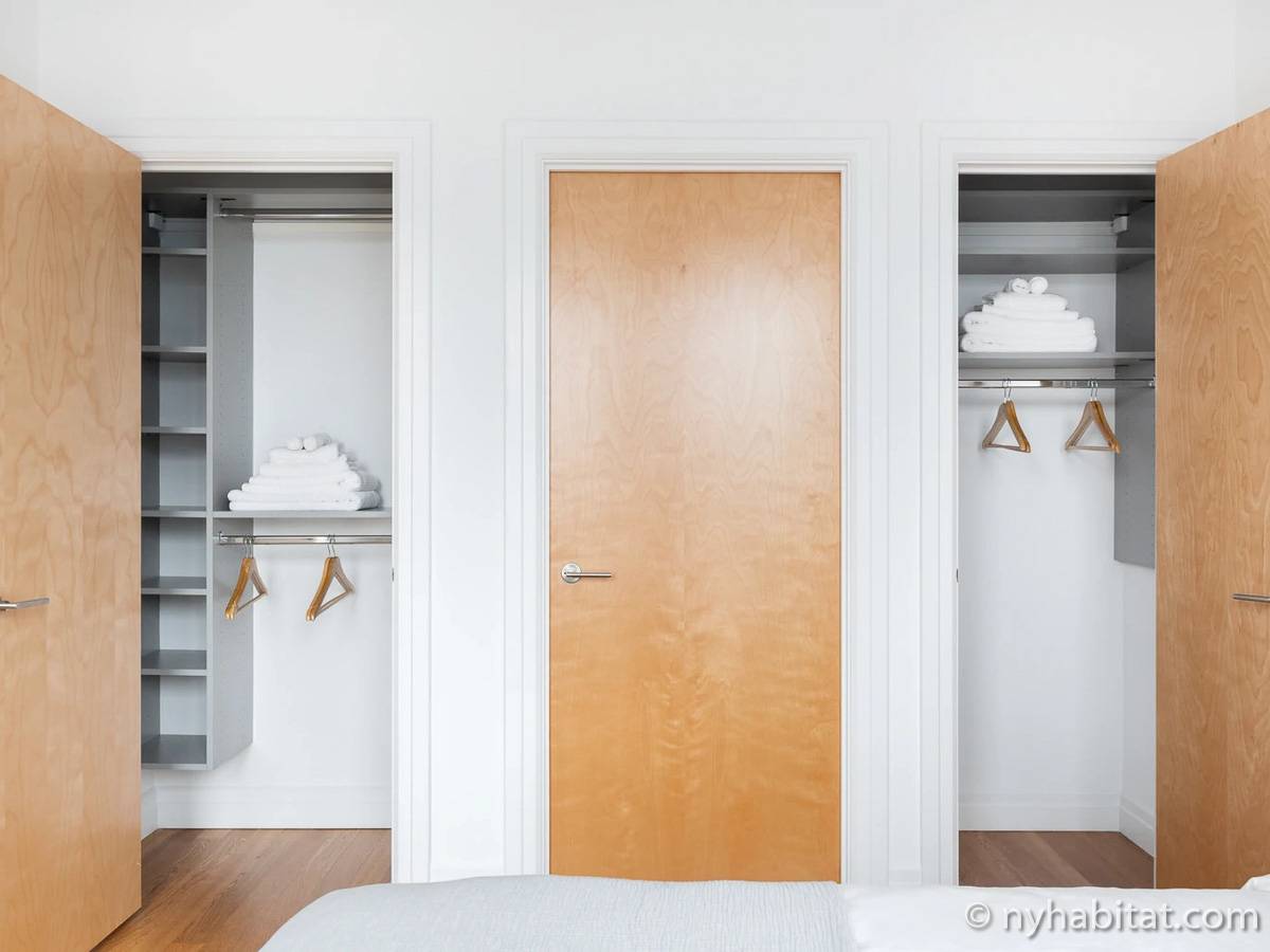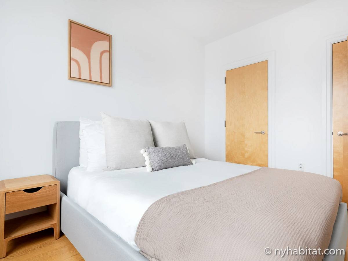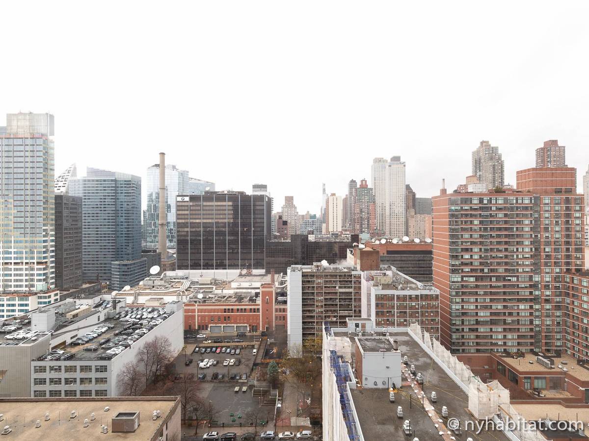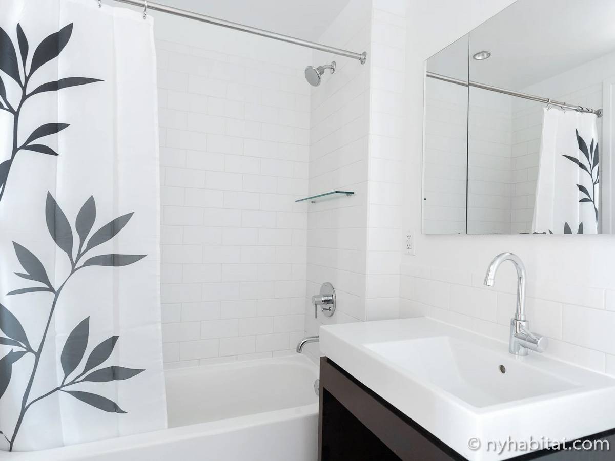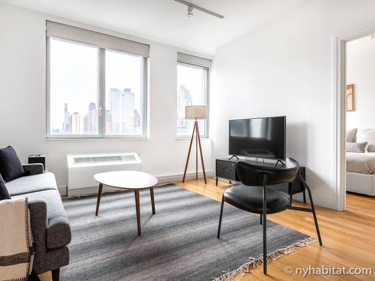 This apartment sits on the twenty-third floor, (equivalent to the twenty-second floor in Europe). Upon entering the space, you will notice a modern living room with two windows (one a double-sized window) overlooking some of Manhattan. The living room also includes a coffee table, a sofa, a TV, and air conditioning. The kitchen is adjacent to the living room which includes white cabinetry as well as a refrigerator, oven, toaster, and coffeemaker. In the first bedroom, you will find a queen-size bed along with modern furniture and closet space. In the second bedroom, there is a second queen-size bed and a nightstand, dresser, and more closet space. Finally, both bathrooms include a tub and shower head.