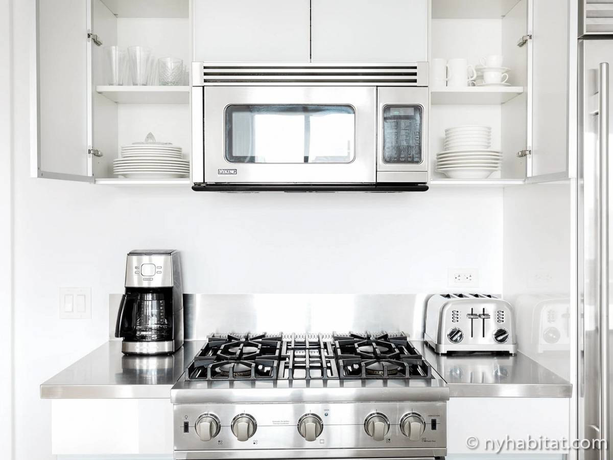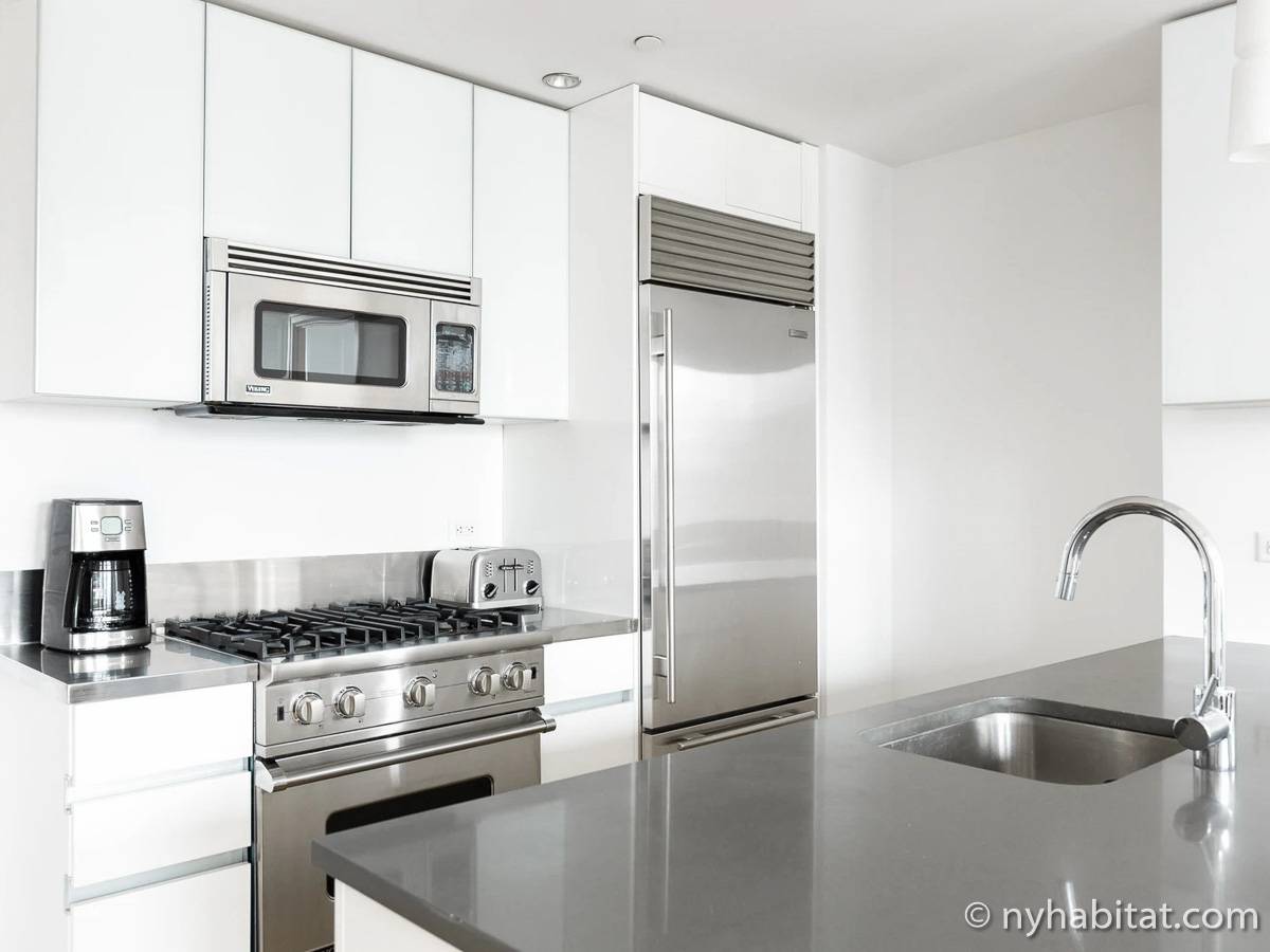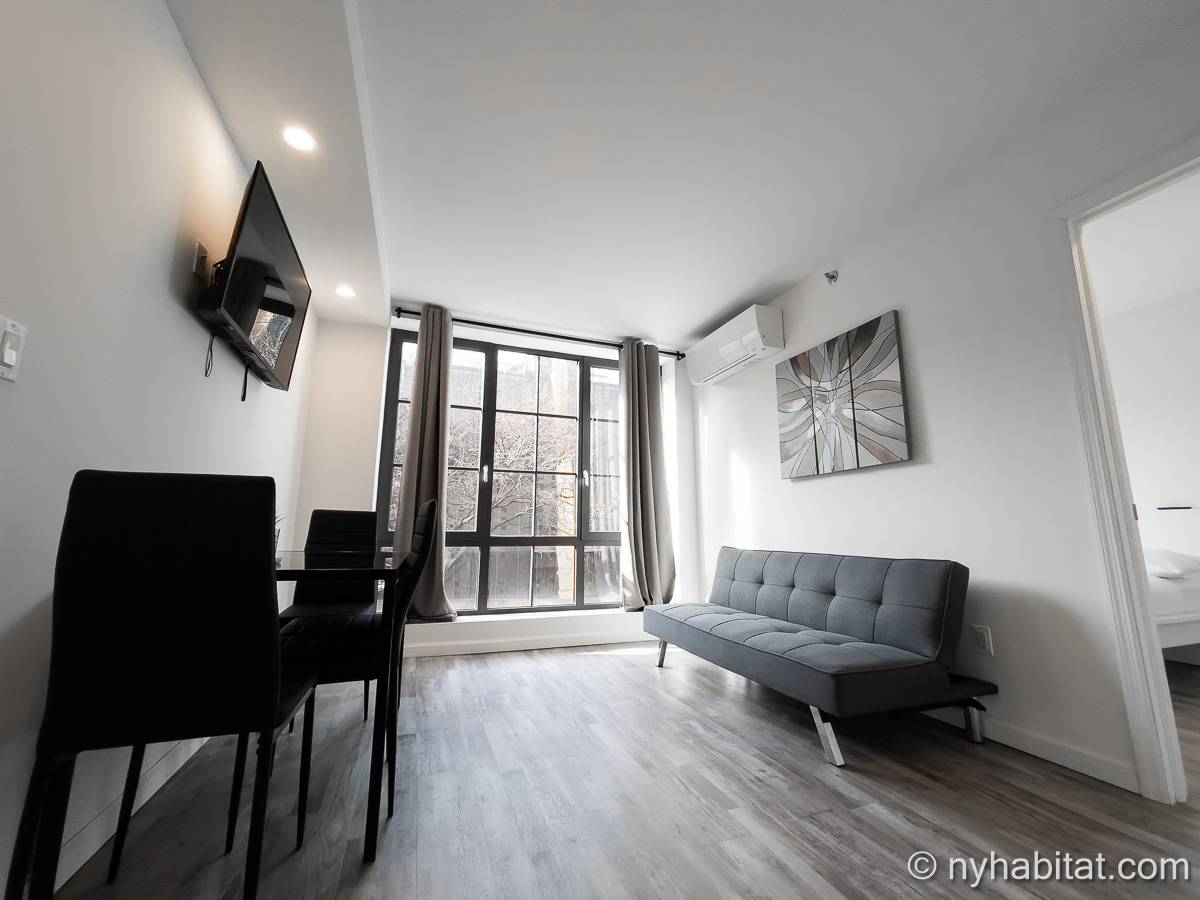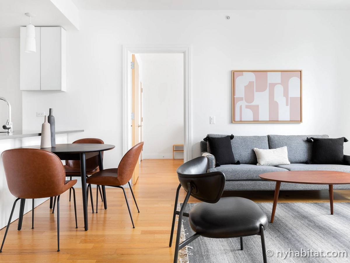 This apartment sits on the twenty-third floor, (equivalent to the twenty-second floor in Europe). Upon entering the space, you will notice a modern living room with two windows (one a double-sized window) overlooking some of Manhattan. The living room also includes a coffee table, a sofa, a TV, and air conditioning. The kitchen is adjacent to the living room which includes white cabinetry as well as a refrigerator, oven, toaster, and coffeemaker. In the first bedroom, you will find a queen-size bed along with modern furniture and closet space. In the second bedroom, there is a second queen-size bed and a nightstand, dresser, and more closet space. Finally, both bathrooms include a tub and shower head.