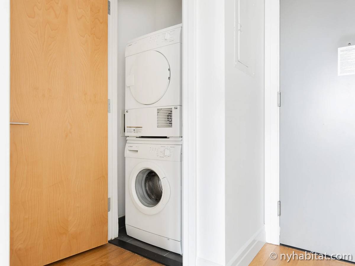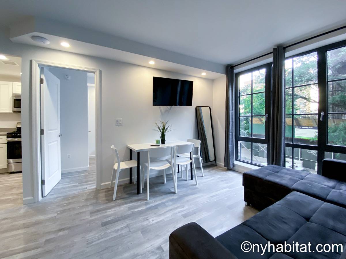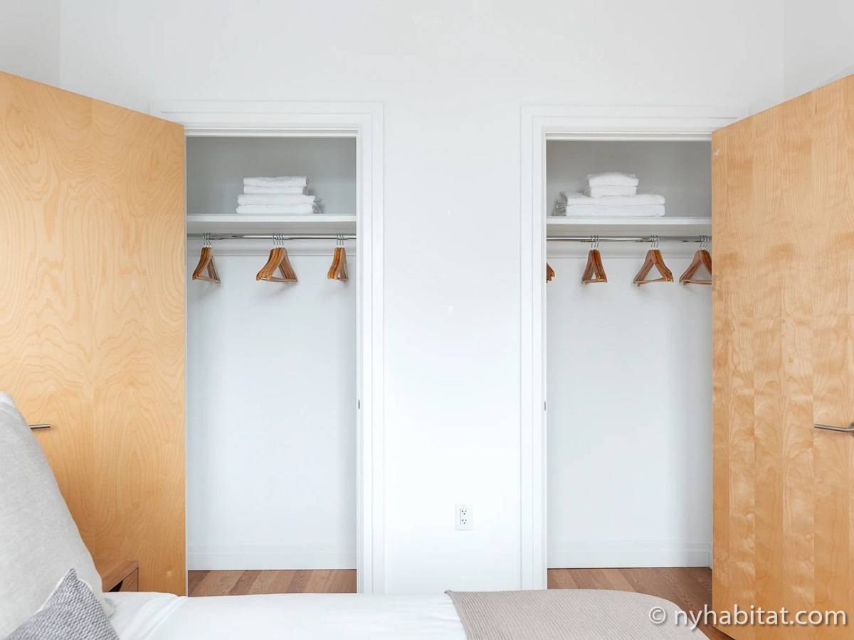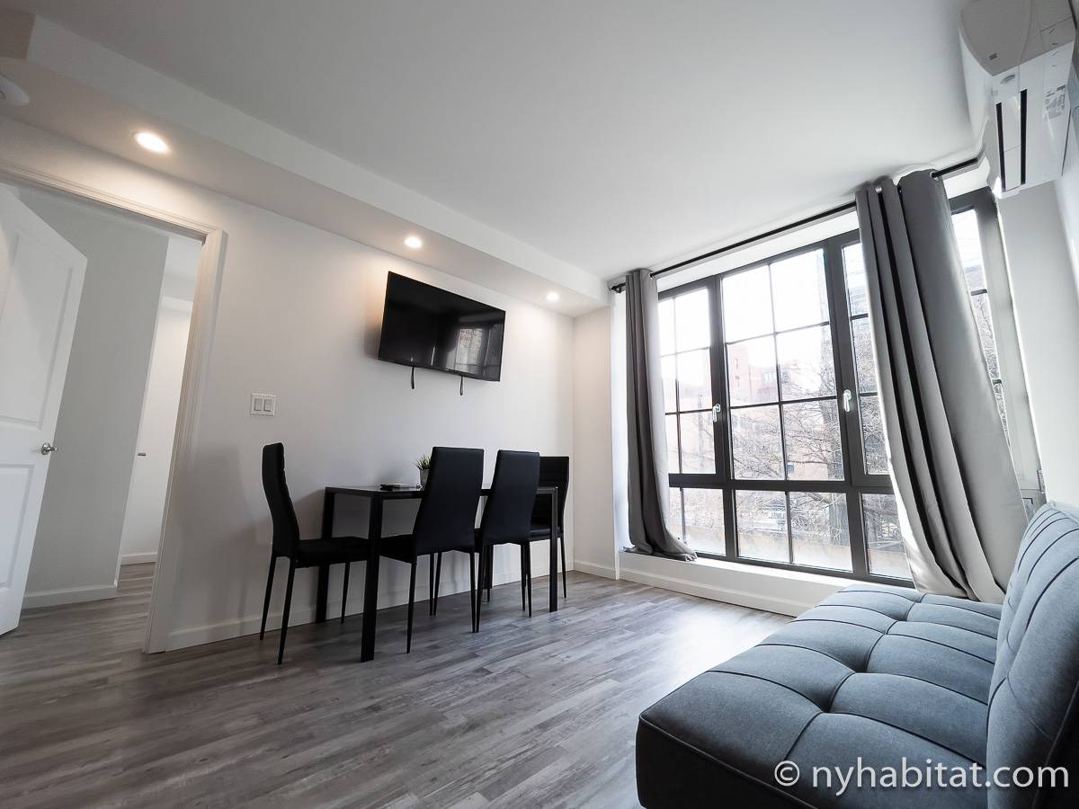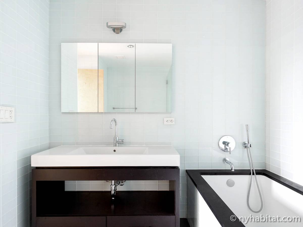 This apartment sits on the twenty-third floor, (equivalent to the twenty-second floor in Europe). Upon entering the space, you will notice a modern living room with two windows (one a double-sized window) overlooking some of Manhattan. The living room also includes a coffee table, a sofa, a TV, and air conditioning. The kitchen is adjacent to the living room which includes white cabinetry as well as a refrigerator, oven, toaster, and coffeemaker. In the first bedroom, you will find a queen-size bed along with modern furniture and closet space. In the second bedroom, there is a second queen-size bed and a nightstand, dresser, and more closet space. Finally, both bathrooms include a tub and shower head.