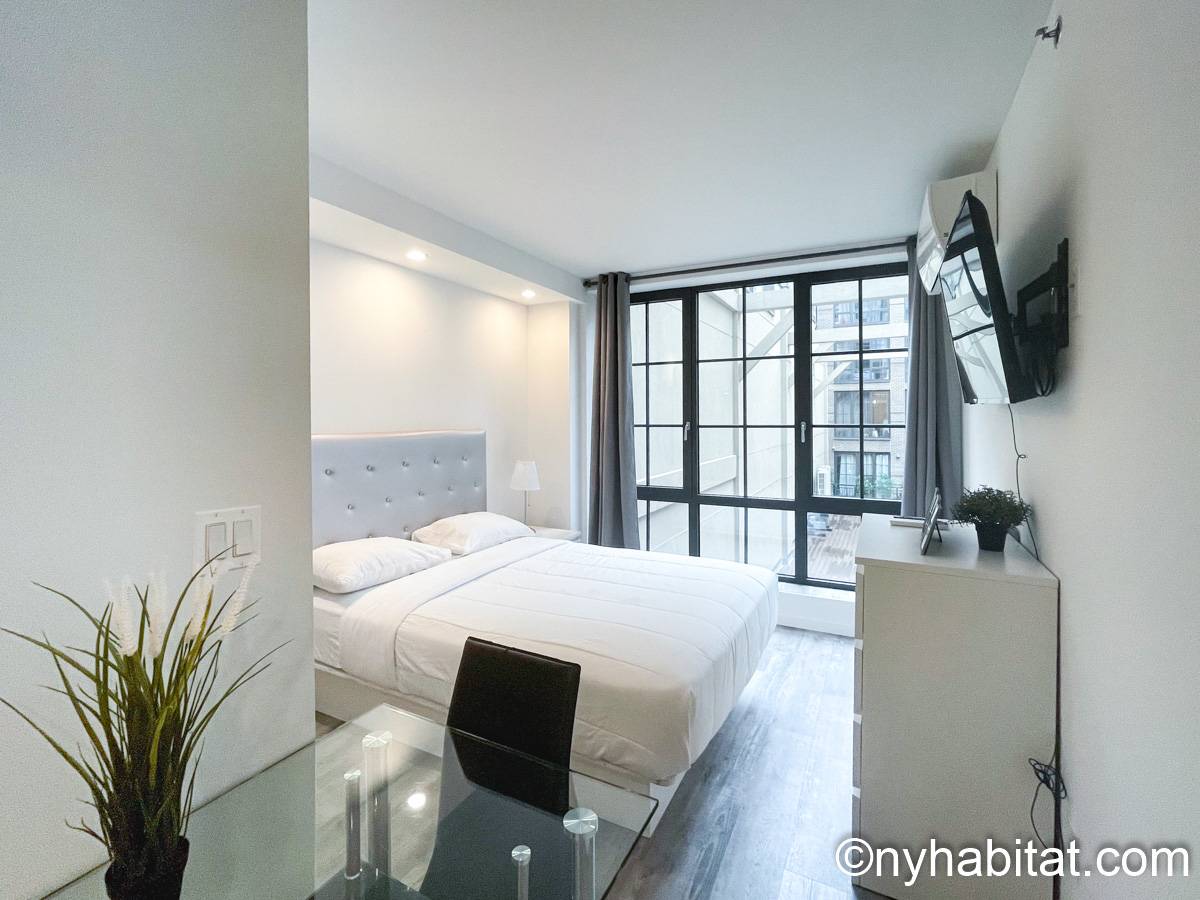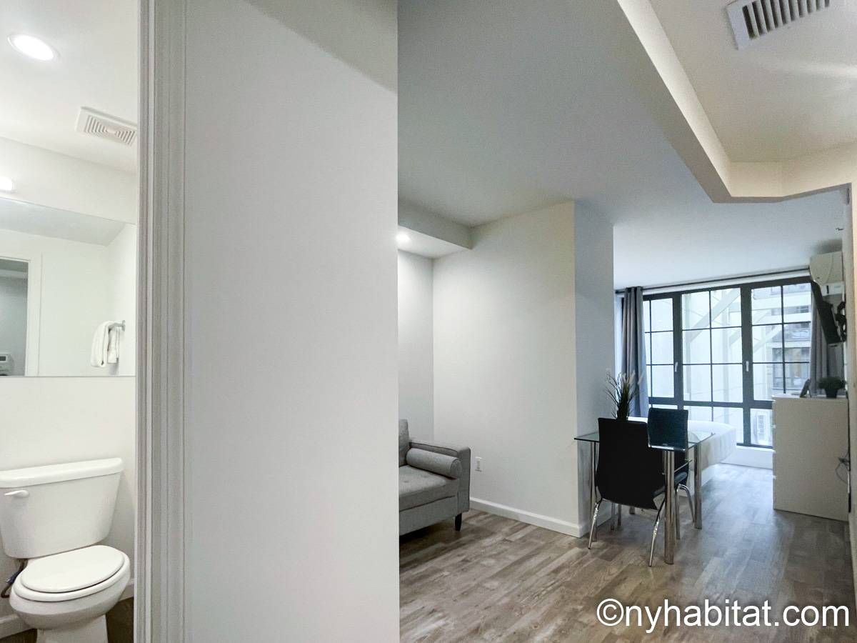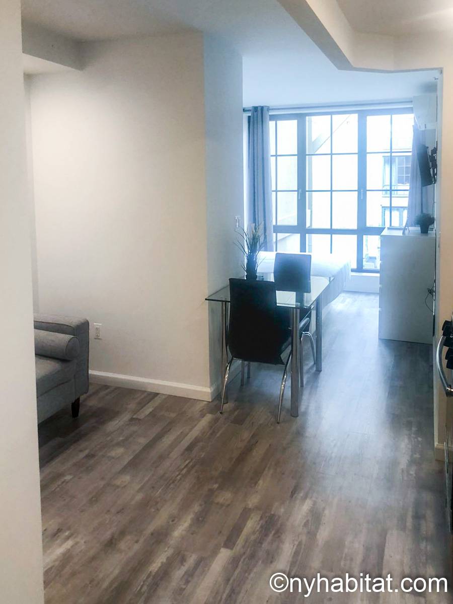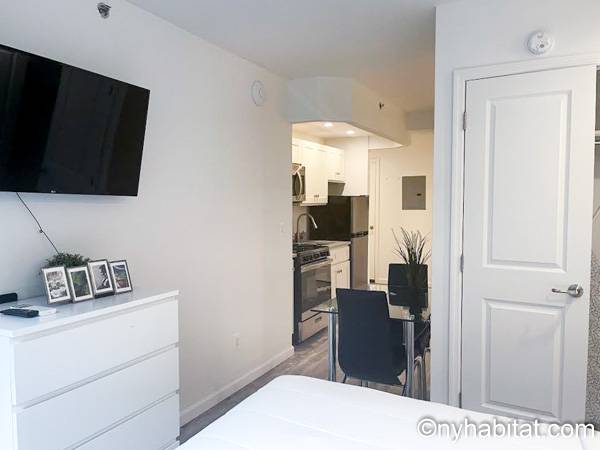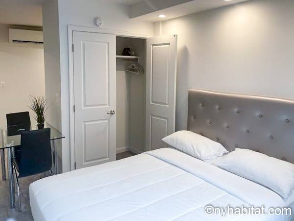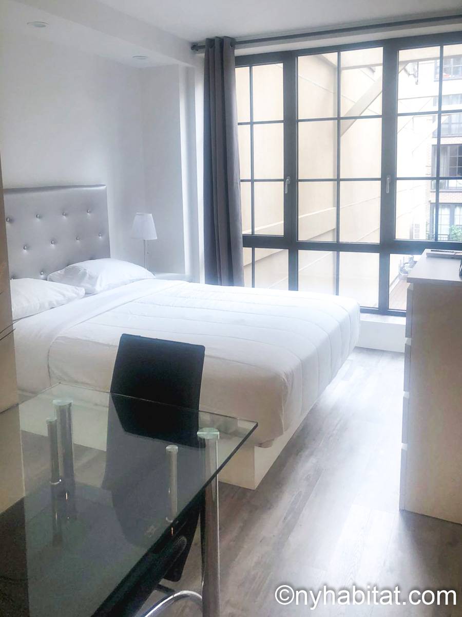This apartment is a studio is located in the Midtown West area of Manhattan, between West 53rd Street and 10th Avenue. It is on the second floor (equivalent to the first European floor) of a low-rise building. The building is monitored by a security system, and it has laundry and elevator available.