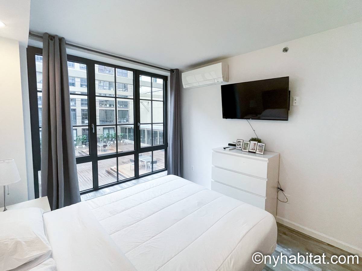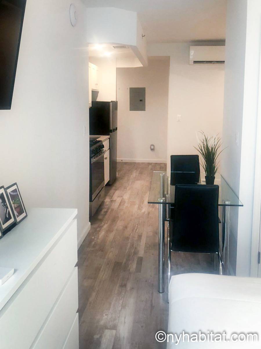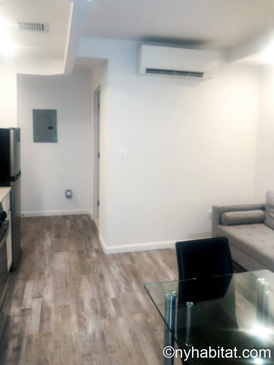 The studio has hardwood floor in all rooms and is fully furnished with contemporary furniture. It also has big windows that you can let natural light and fresh air to come inside! The open kitchen has a microwave and a coffee maker. This furnished apartment has a double bed, air conditioning, TV, a sofa, and a dining table. The bathroom has a bathtub.
