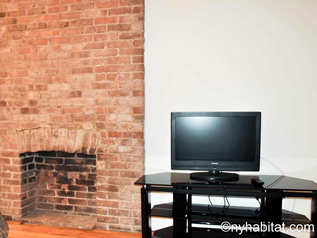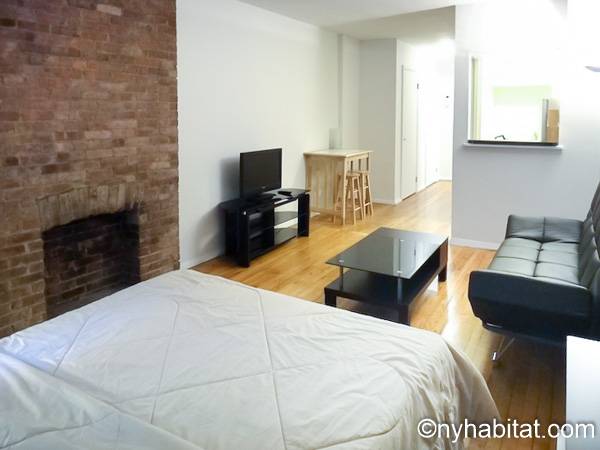 The fully furnished studio apartment features a decorative fireplace, hardwood floors and air conditioning. This rental includes a living room, an open kitchen, and one bathroom. The living room has two closets, a queen-size bed, a sofa, a dining table, a TV, and a coffee table. The bathroom has a bathtub/shower. The open kitchen features a fridge, a microwave, a coffee maker, a toaster, and an oven.