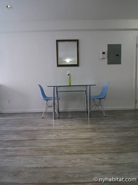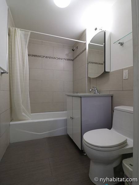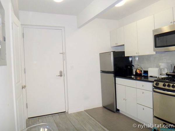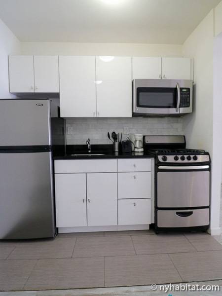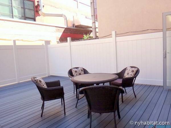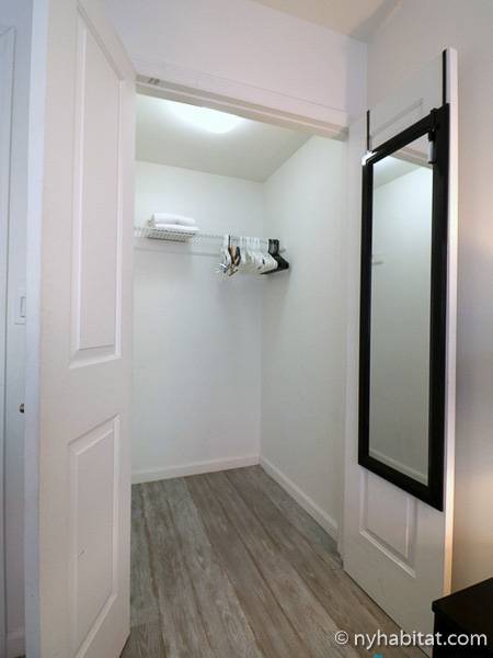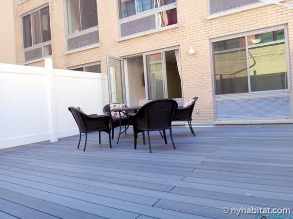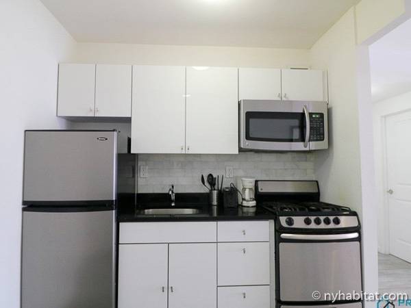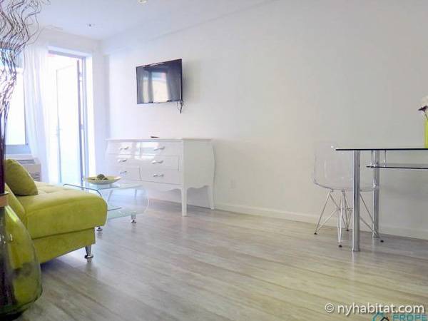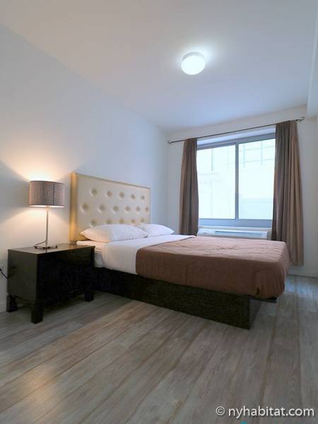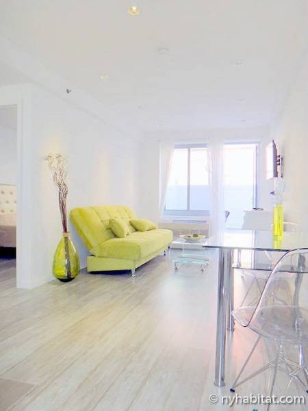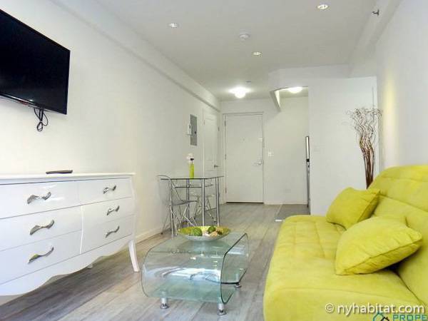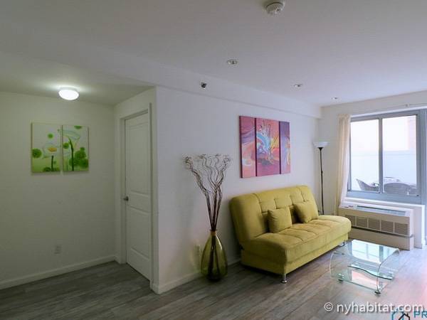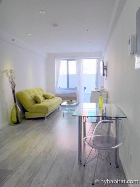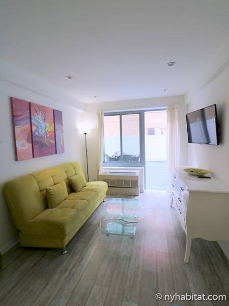 This one-bedroom, one-bathroom furnished apartment is located in the Midtown West area of Manhattan in New York City. On the corner of West 48th Street & 10th Avenue, this apartment is on the 2nd floor (equivalent to 1st floor in Europe) of its building that has an elevator, laundry facilities, security system, and a terrace.