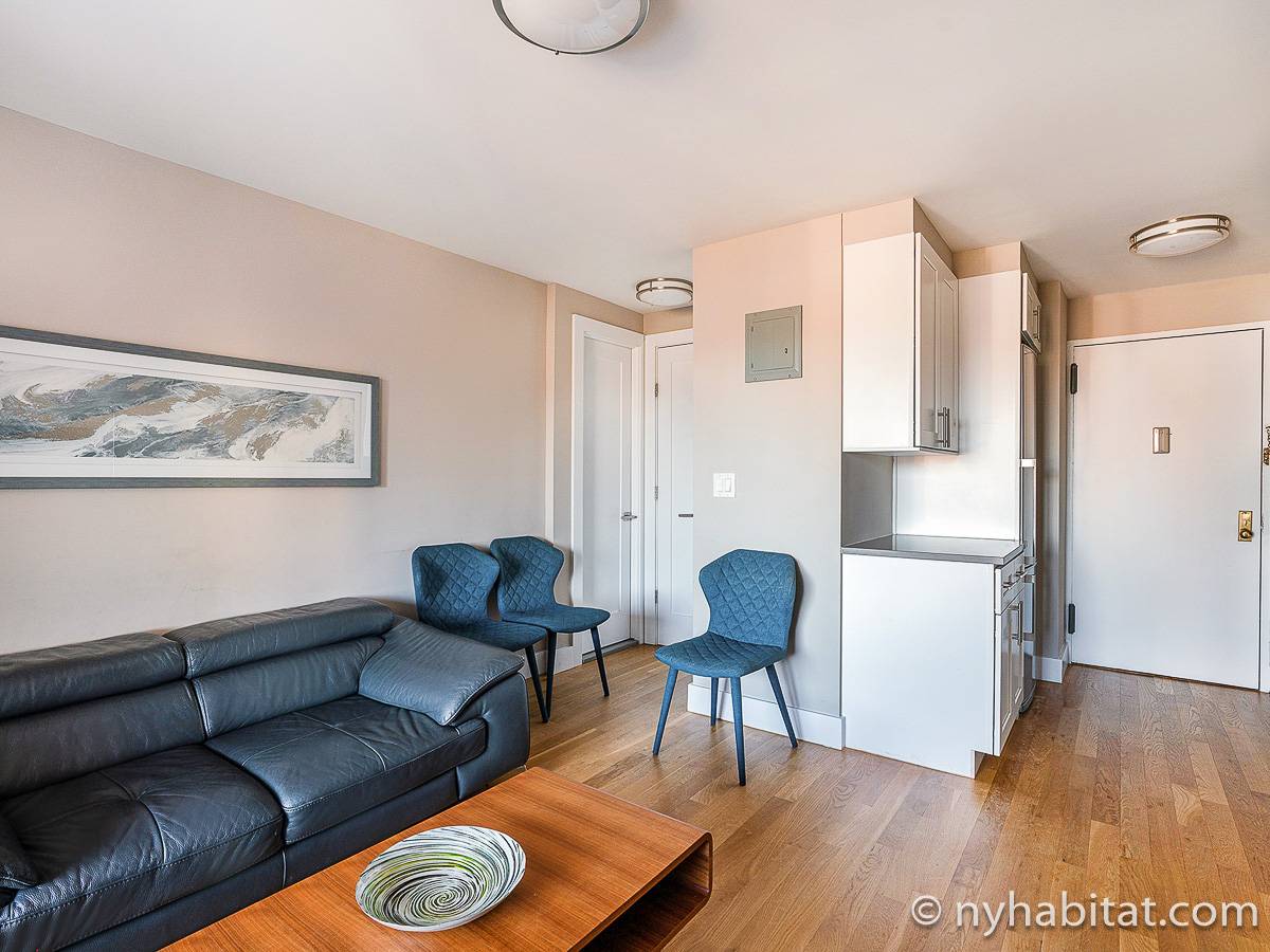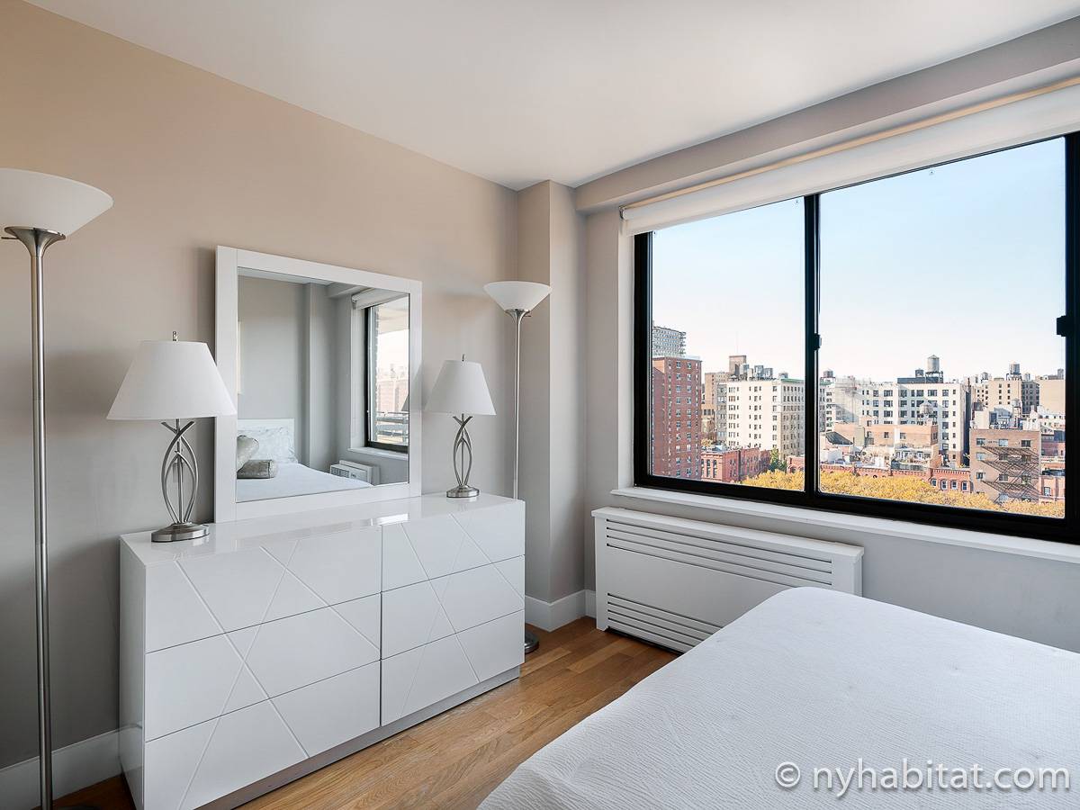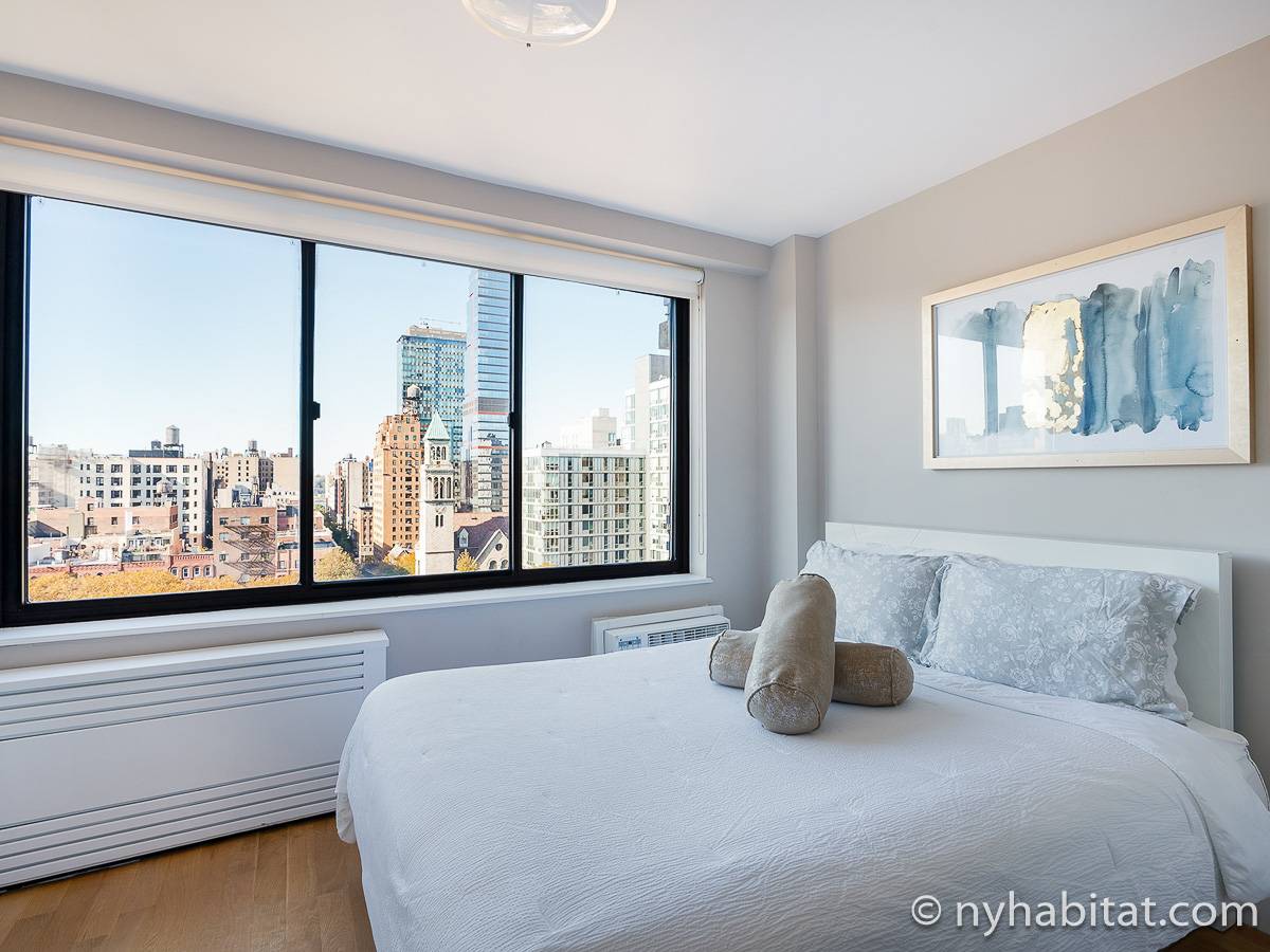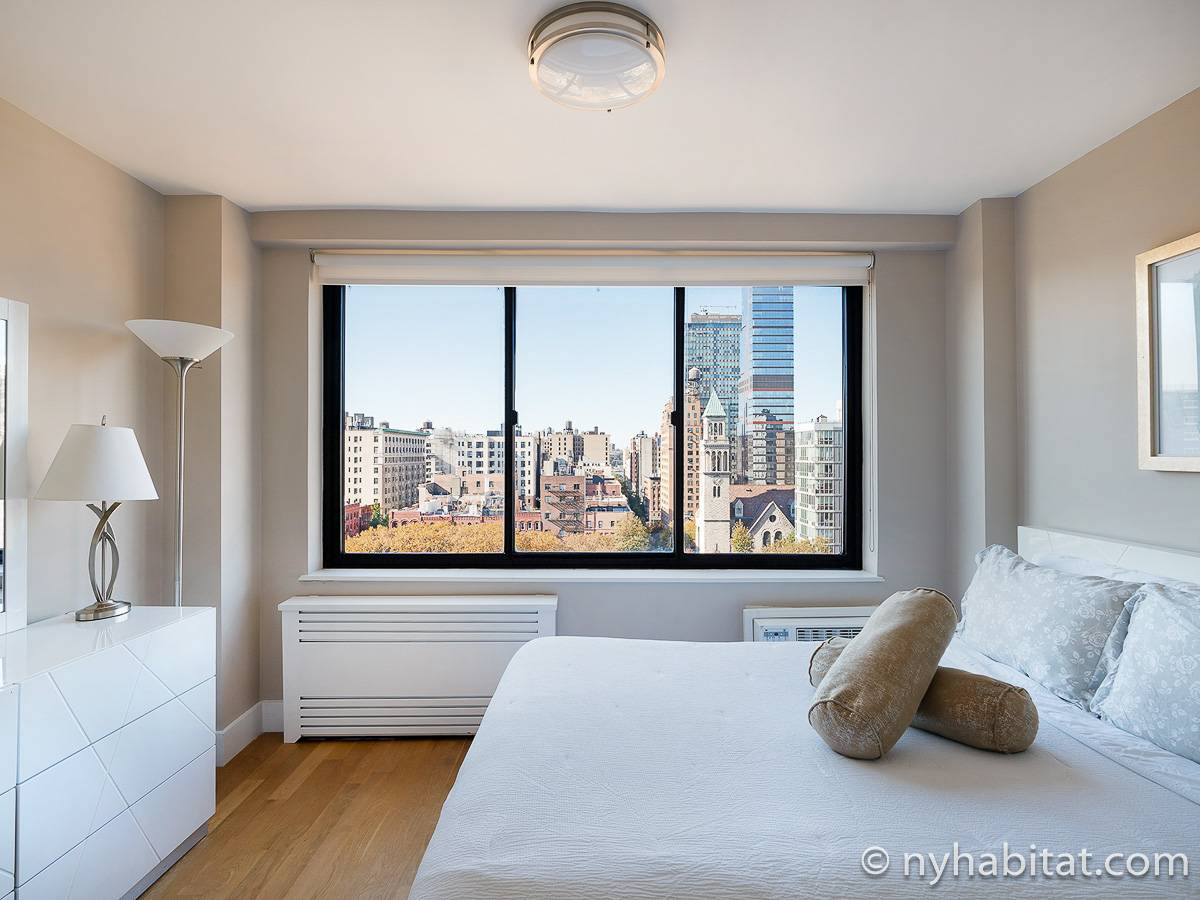 Here is a furnished apartment located in the Upper West Side, New York. This one-bedroom, one-bathroom apartment is on the 14th floor (equivalent to the 13th floor in Europe) of a doorman building with an elevator. It is located near the intersection of Columbus Avenue and 97th Street in Manhattan.