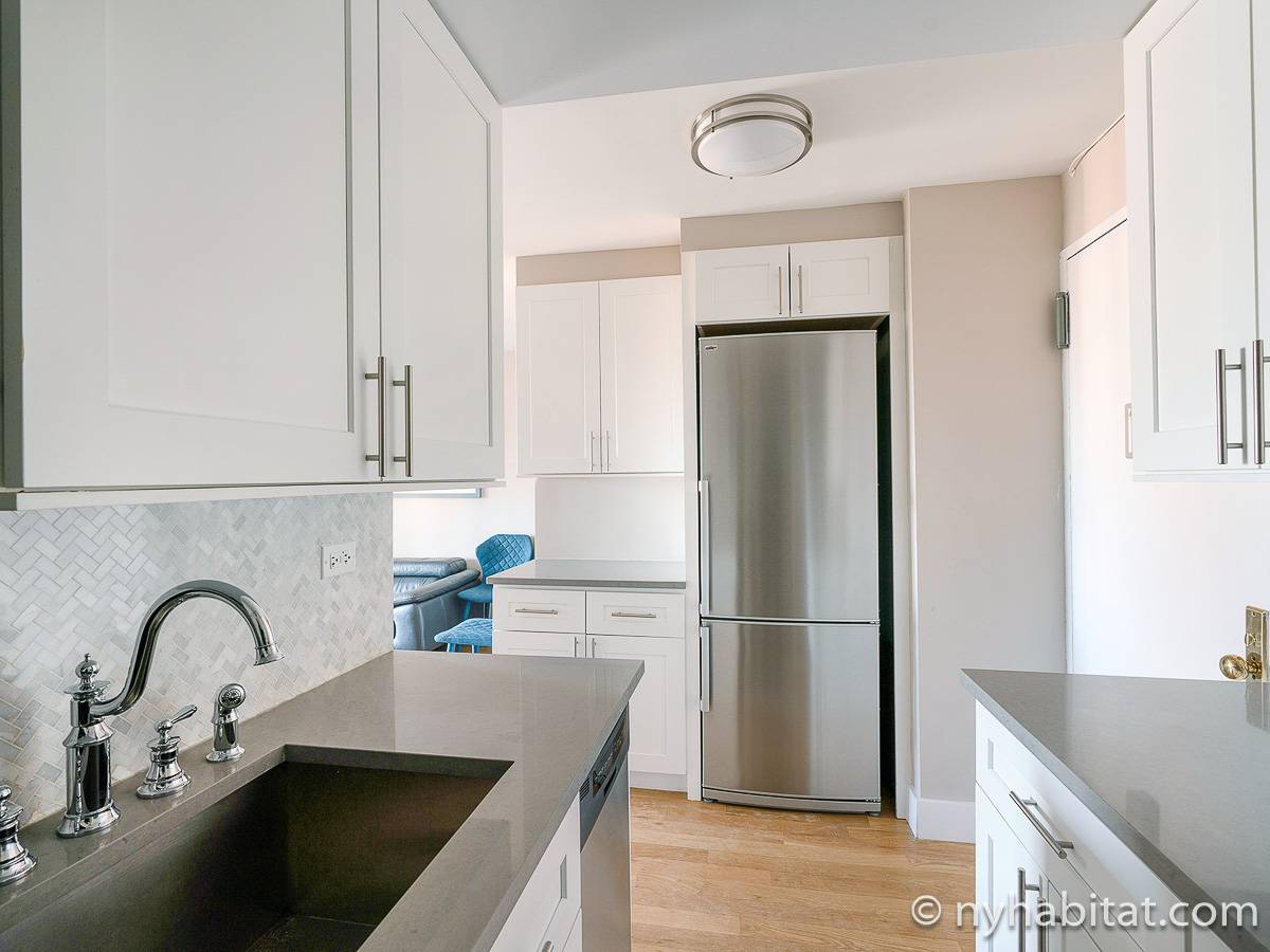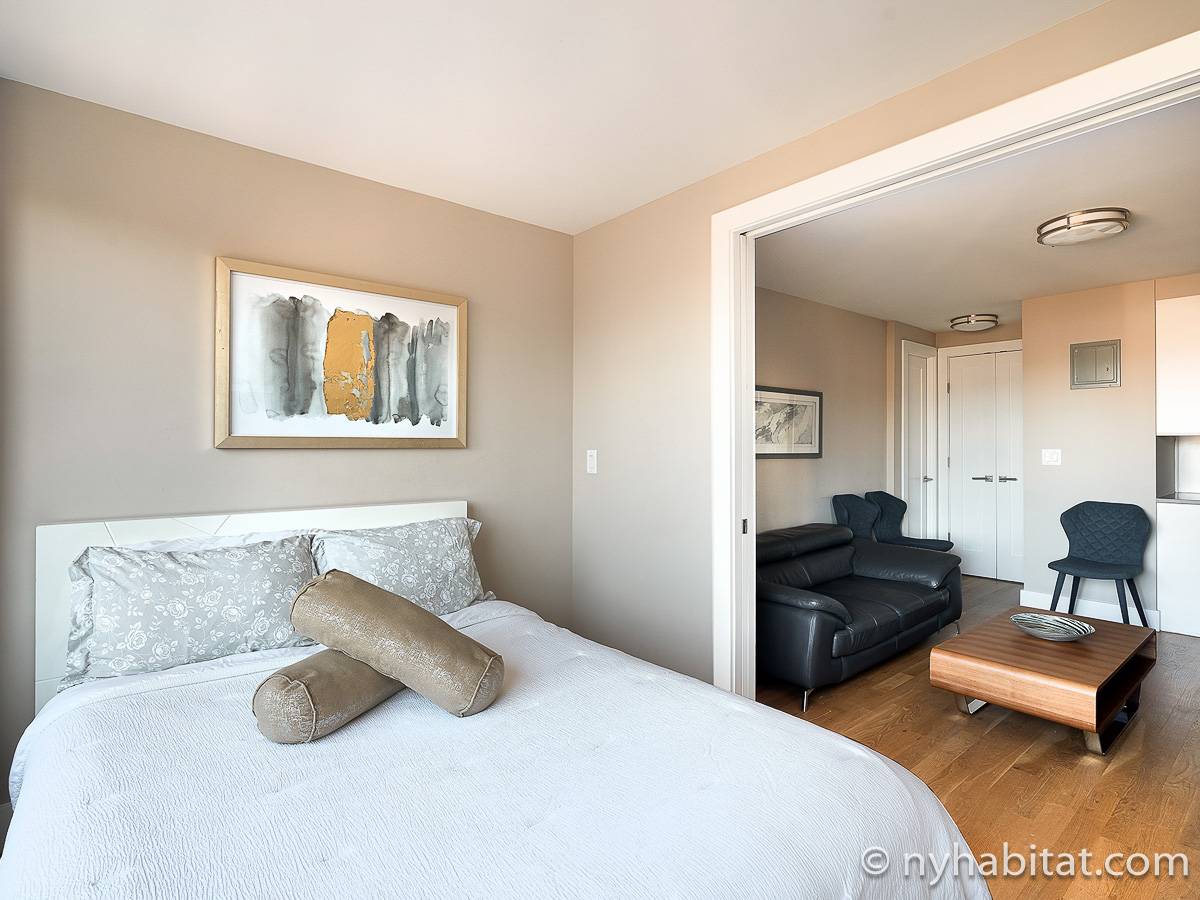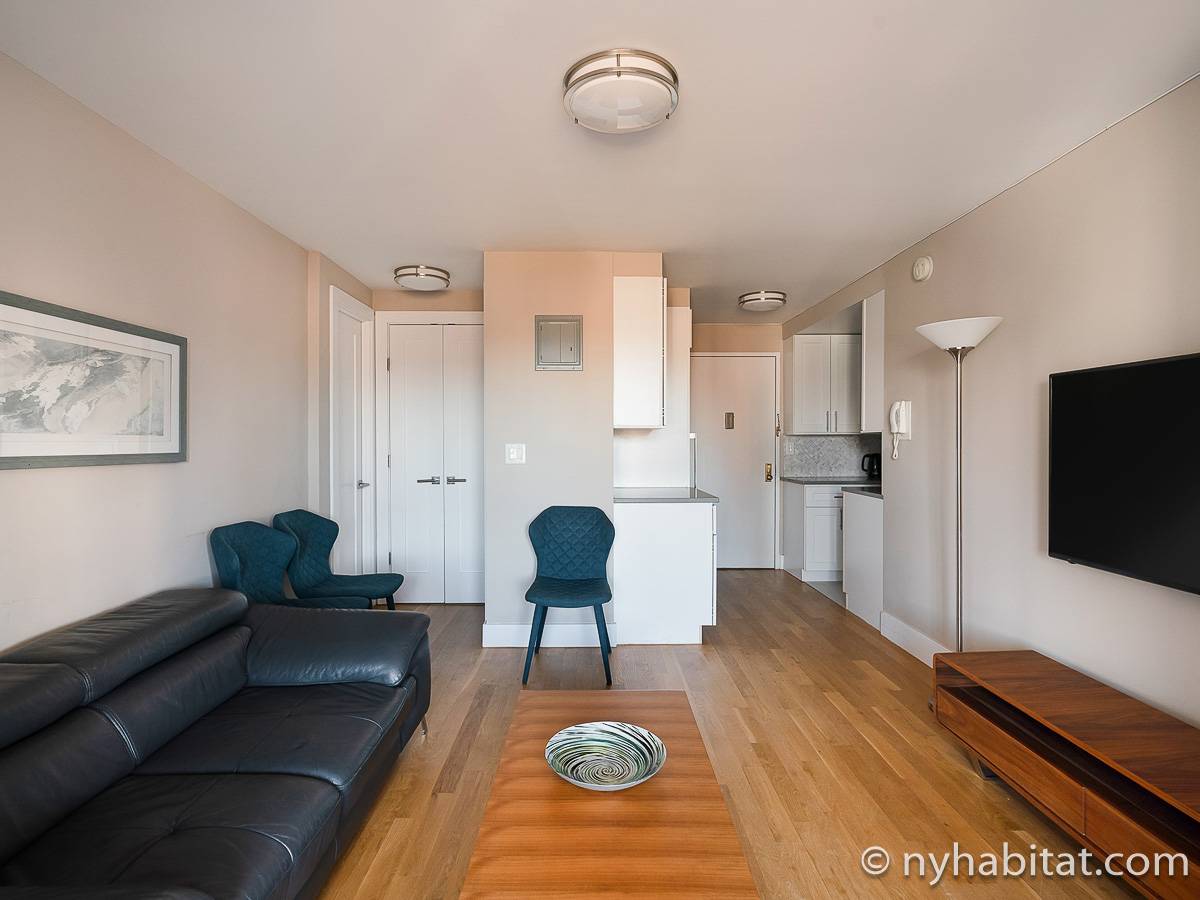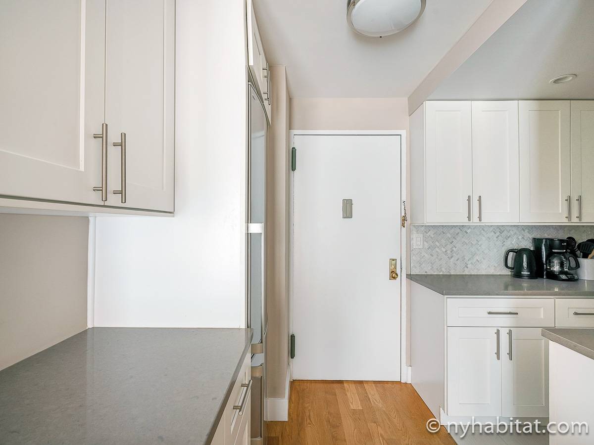 Here is a furnished apartment located in the Upper West Side, New York. This one-bedroom, one-bathroom apartment is on the 14th floor (equivalent to the 13th floor in Europe) of a doorman building with an elevator. It is located near the intersection of Columbus Avenue and 97th Street in Manhattan.