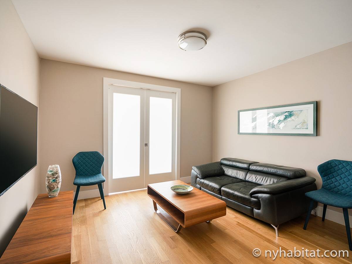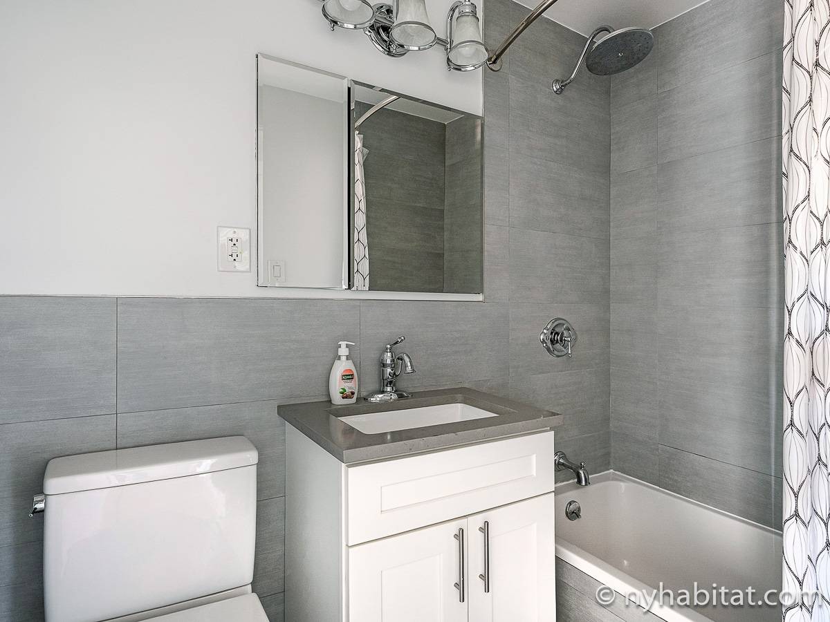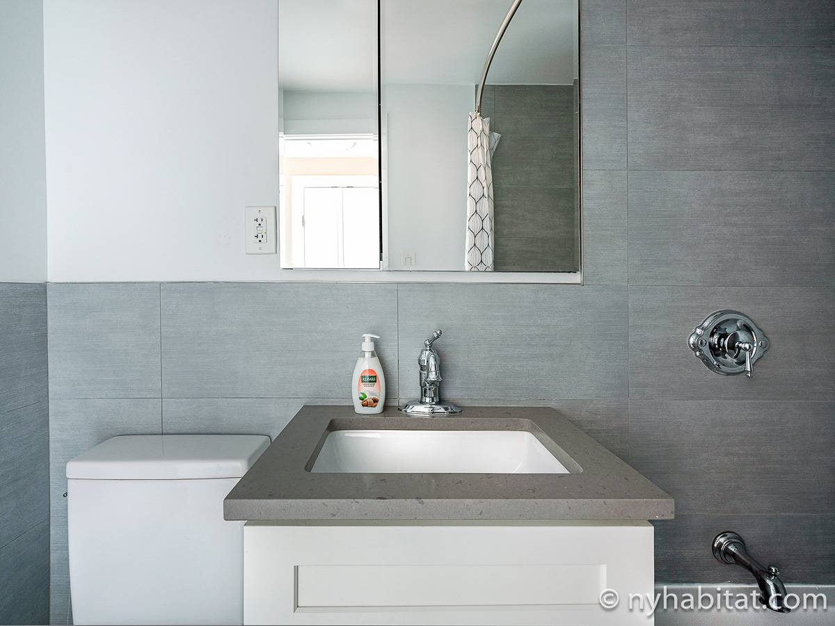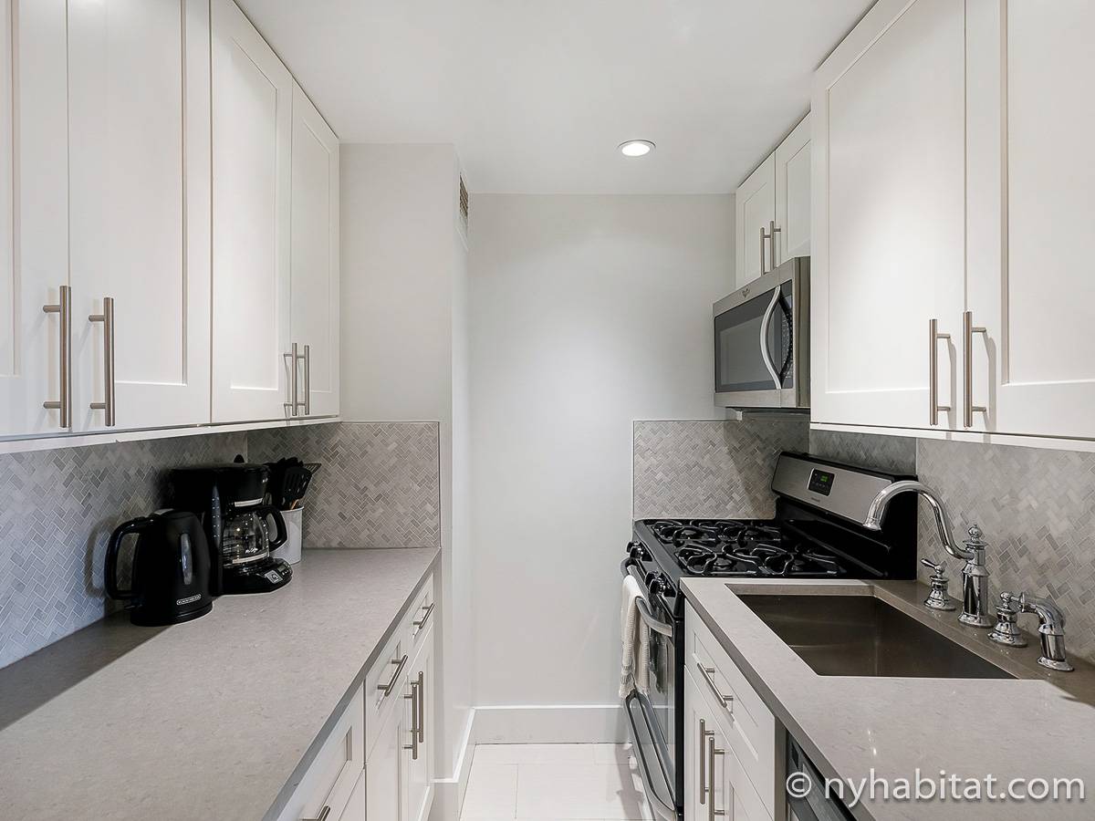 Here is a furnished apartment located in the Upper West Side, New York. This one-bedroom, one-bathroom apartment is on the 14th floor (equivalent to the 13th floor in Europe) of a doorman building with an elevator. It is located near the intersection of Columbus Avenue and 97th Street in Manhattan.