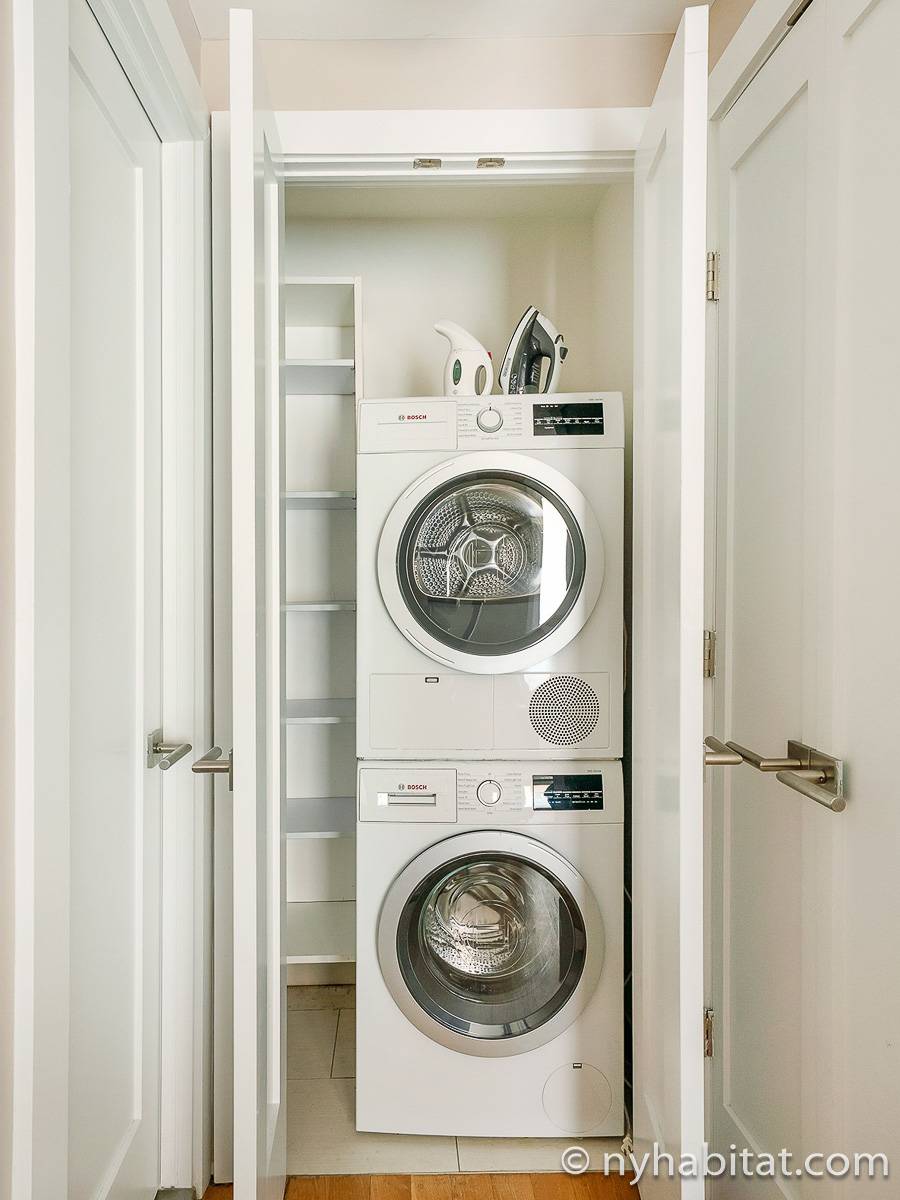 As you walk into this furnished rental, you are greeted by a beautiful view of the city skyline from the bedroom. Connected to this bedroom by a large, view-sharing doorway, the living area features a sofa, air conditioning, and TV. Next to this relaxing environment, you will find a galley kitchen which is fully equipped with an oven, freezer, microwave, coffeemaker, toaster, dishwasher, and fridge, providing everything needed for meal preparation. Apartment amenities include an in-unit washing machine and dryer. The bedroom includes air conditioning and a queen-size bed. The bathroom features a shower and tub.
