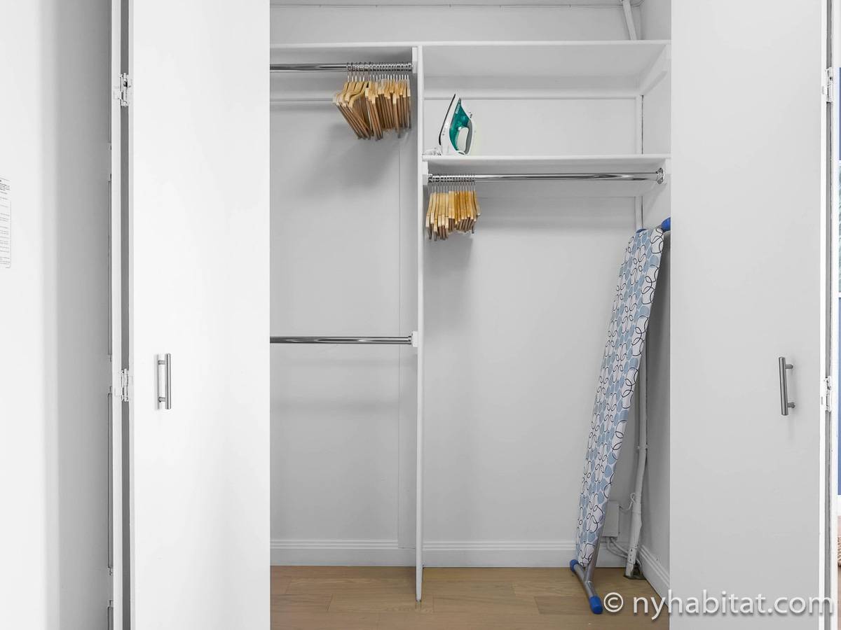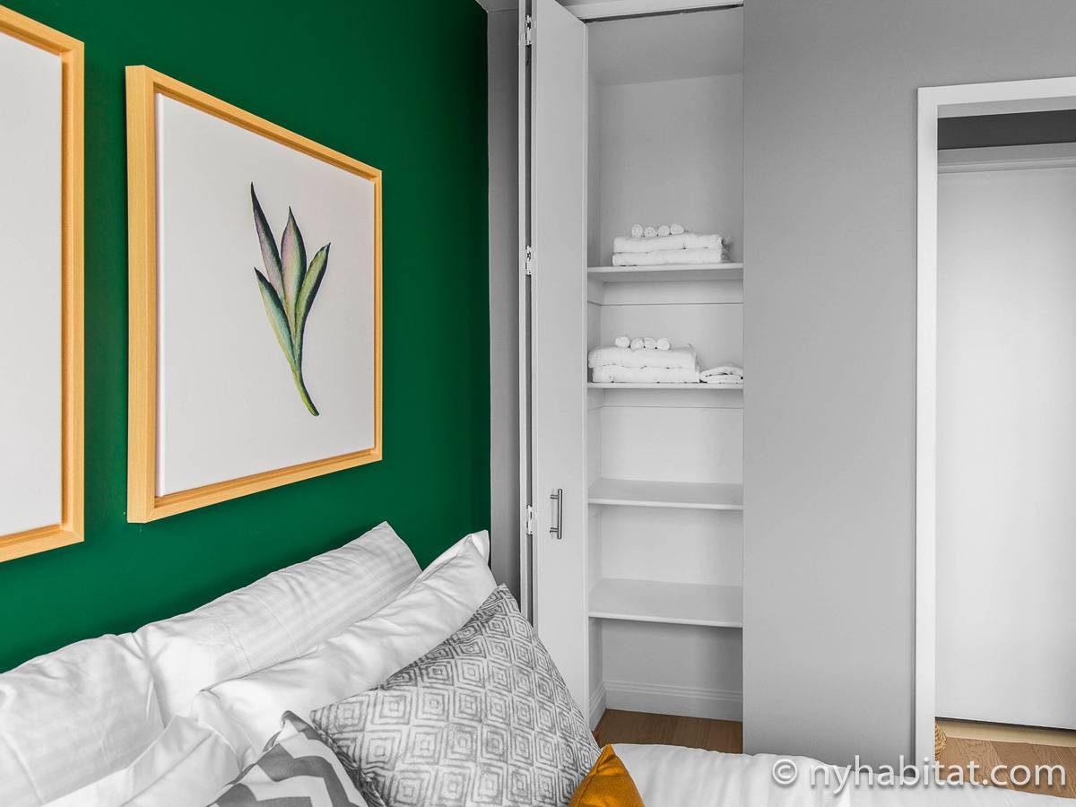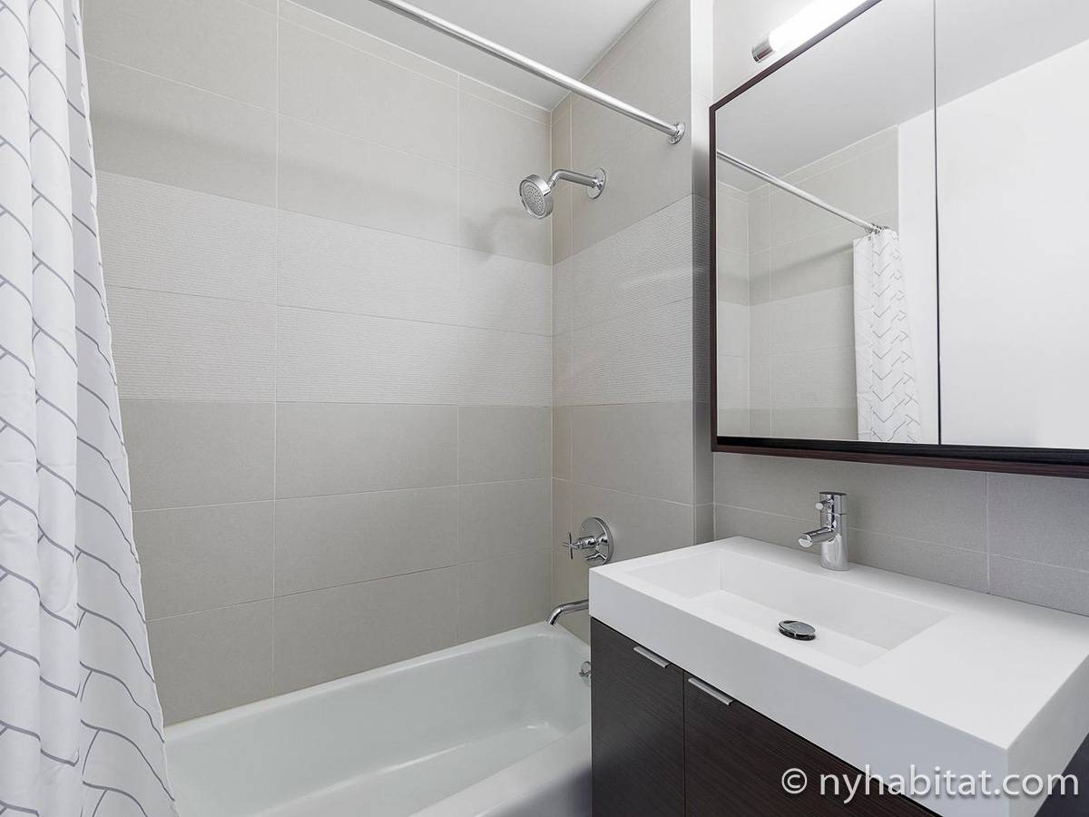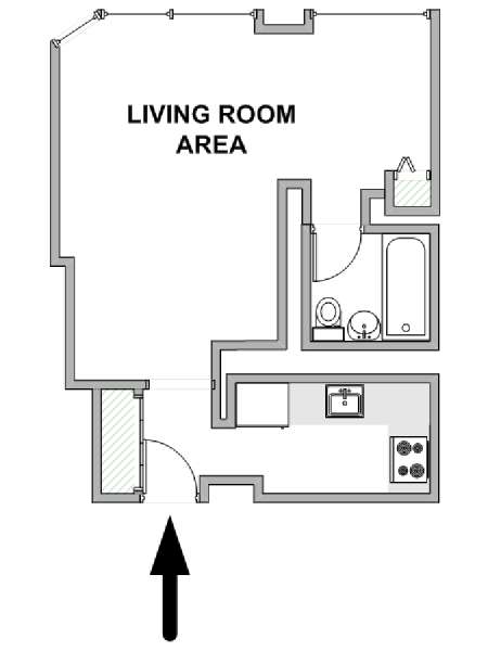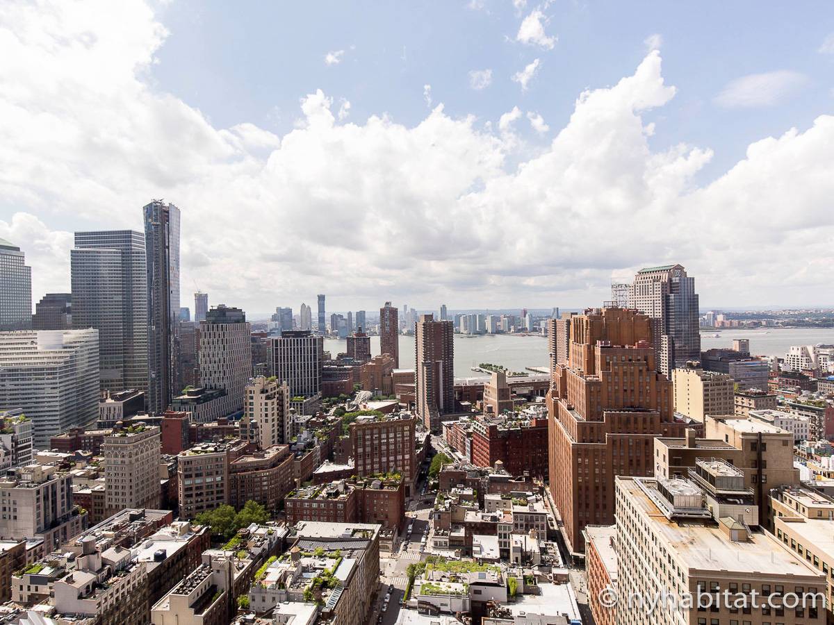 This furnished studio apartment is located on the 41st floor (equivalent to the 40th floor in Europe) of a New York high-rise building. The building sits near the intersection of Duane Street and Broadway in Tribecca, Manhattan. The building features an elevator, a gym, laundry facilities, a pool, a garden, and a doorman.