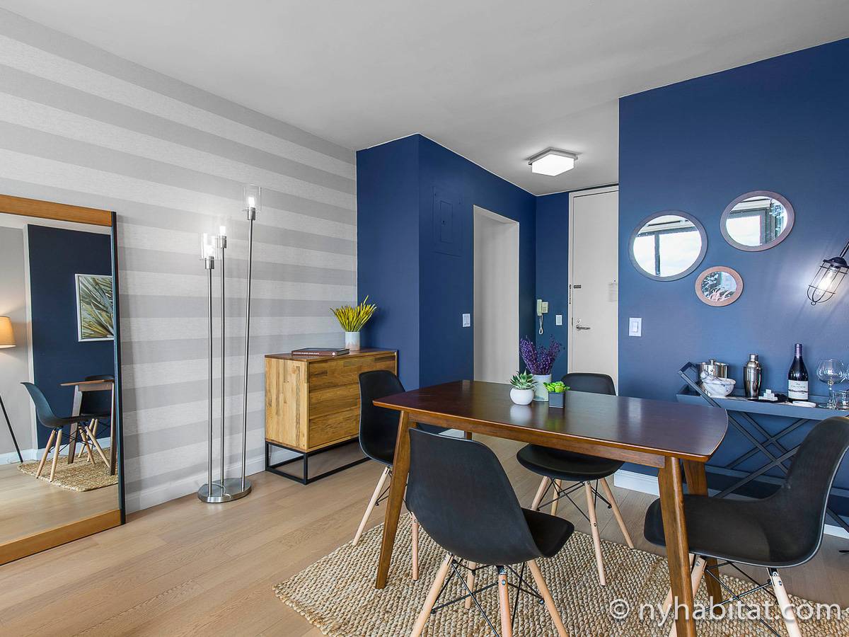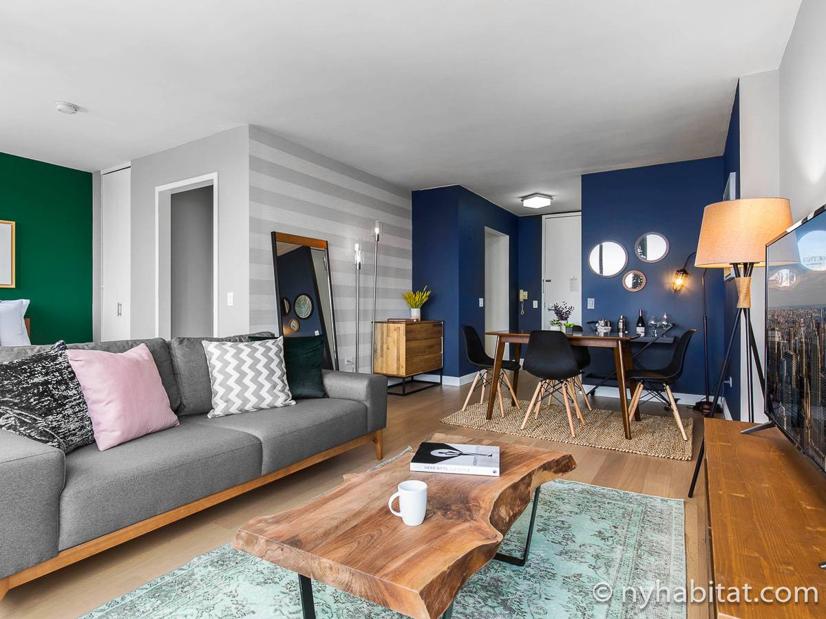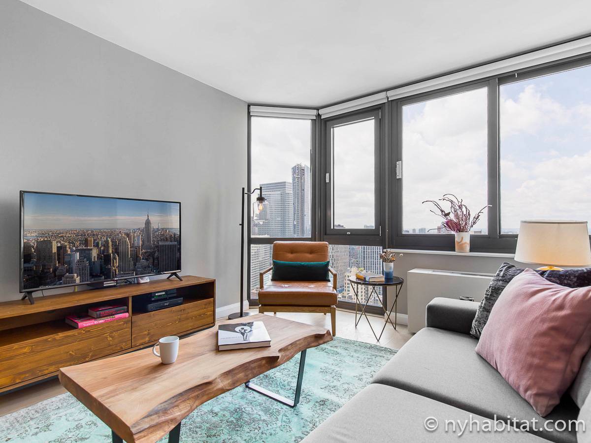 The contemporary style apartment features hardwood floors, stainless-steel appliances, and air conditioning. There are also stunning Manhattan views from the wall-to-wall windows. The furnished rental includes a living room, one bathroom, and a separate kitchen. You will find a sofa, a coffee table, an entertainment center, and a dining table in the living room. To the right of the living room, you will find the open bedroom area with a queen-size bed and a closet. The bathroom has a tile interior with a bathtub/shower. The separate kitchen features an oven, a fridge, a microwave, a coffee maker, a toaster, and a dishwasher.