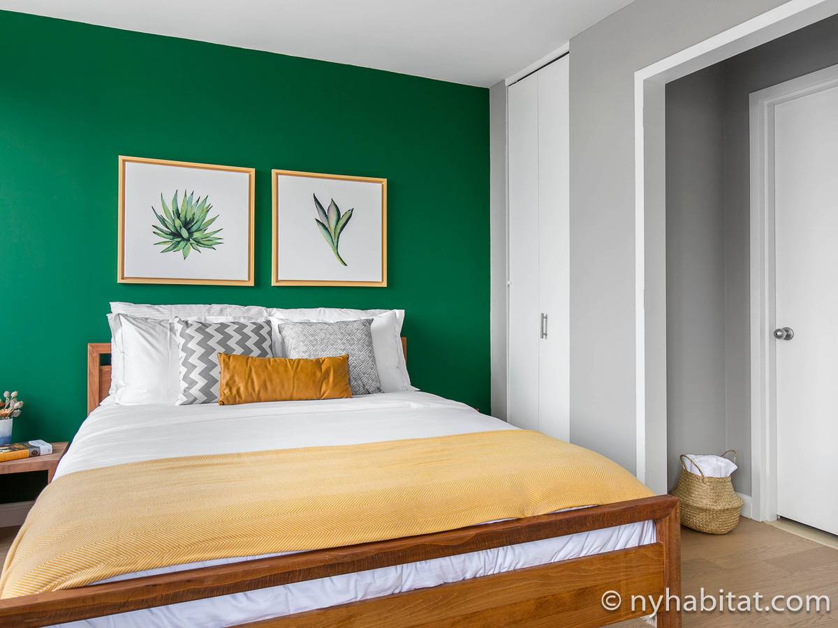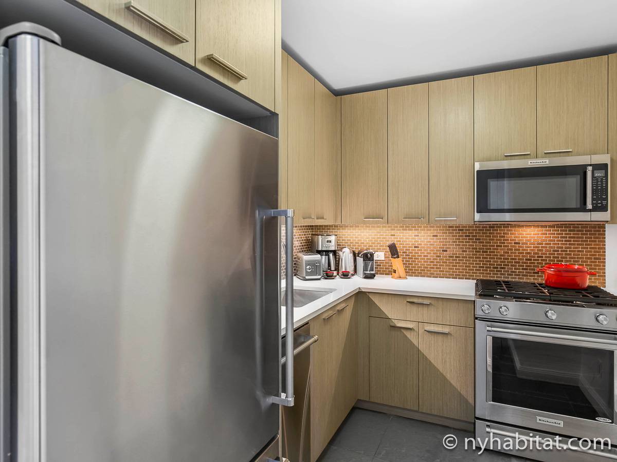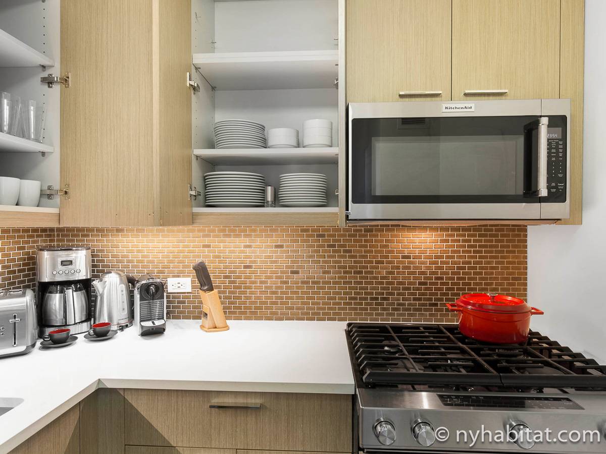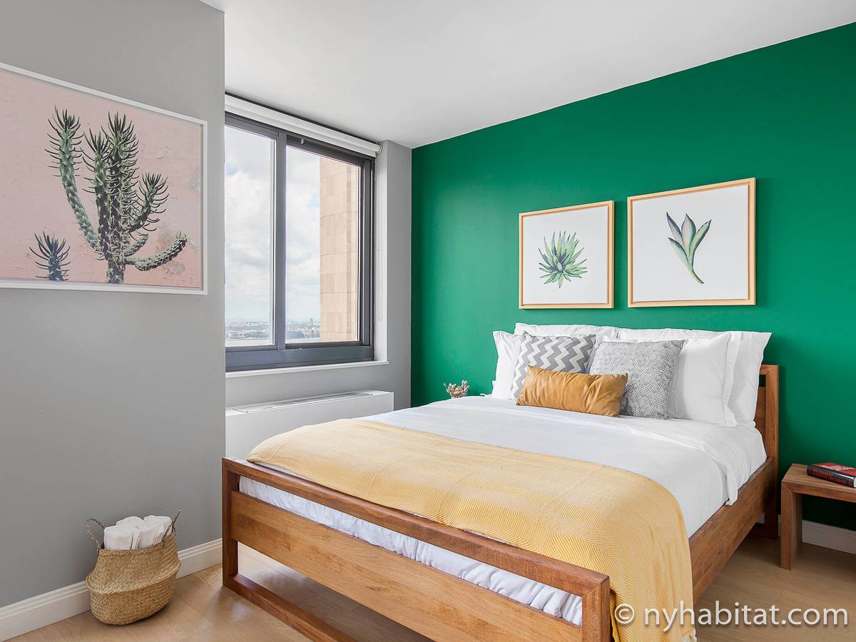 The contemporary style apartment features hardwood floors, stainless-steel appliances, and air conditioning. There are also stunning Manhattan views from the wall-to-wall windows. The furnished rental includes a living room, one bathroom, and a separate kitchen. You will find a sofa, a coffee table, an entertainment center, and a dining table in the living room. To the right of the living room, you will find the open bedroom area with a queen-size bed and a closet. The bathroom has a tile interior with a bathtub/shower. The separate kitchen features an oven, a fridge, a microwave, a coffee maker, a toaster, and a dishwasher.