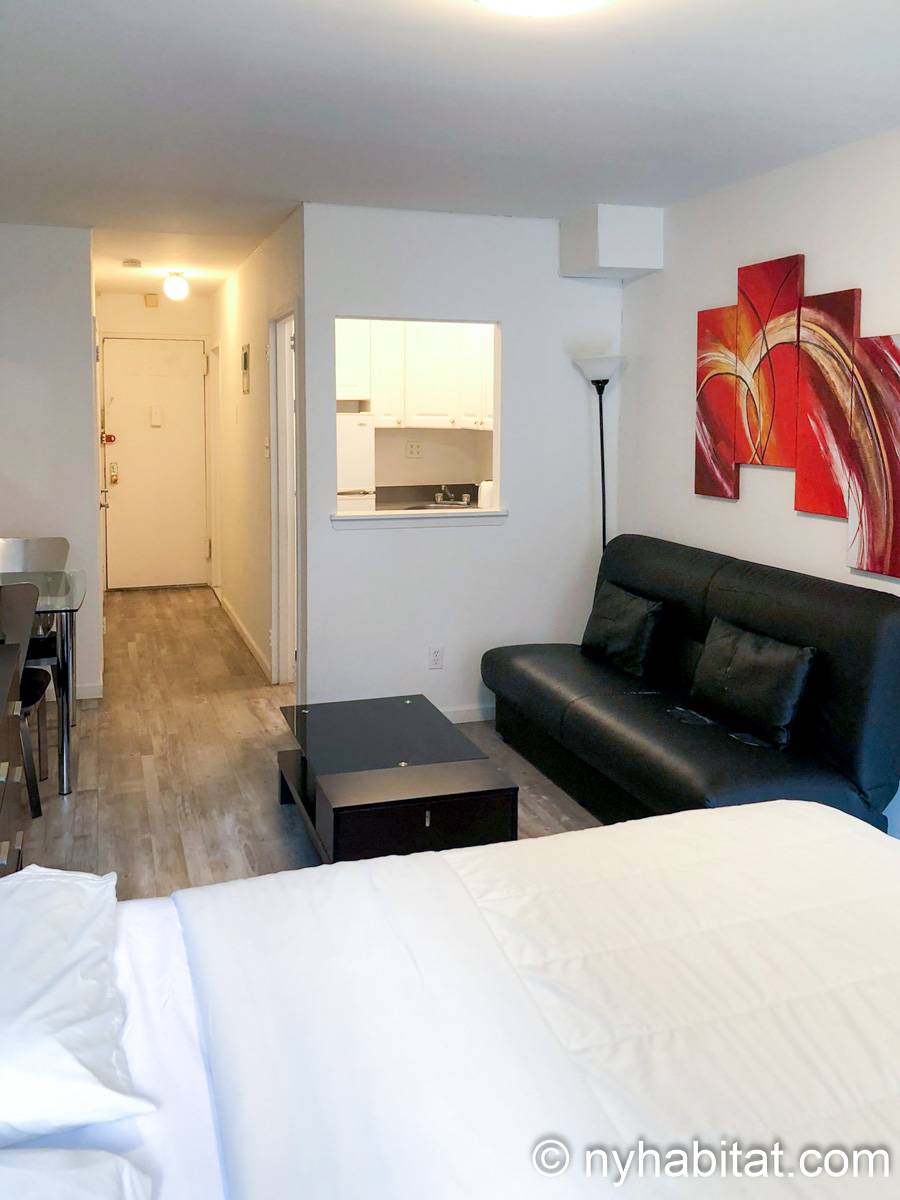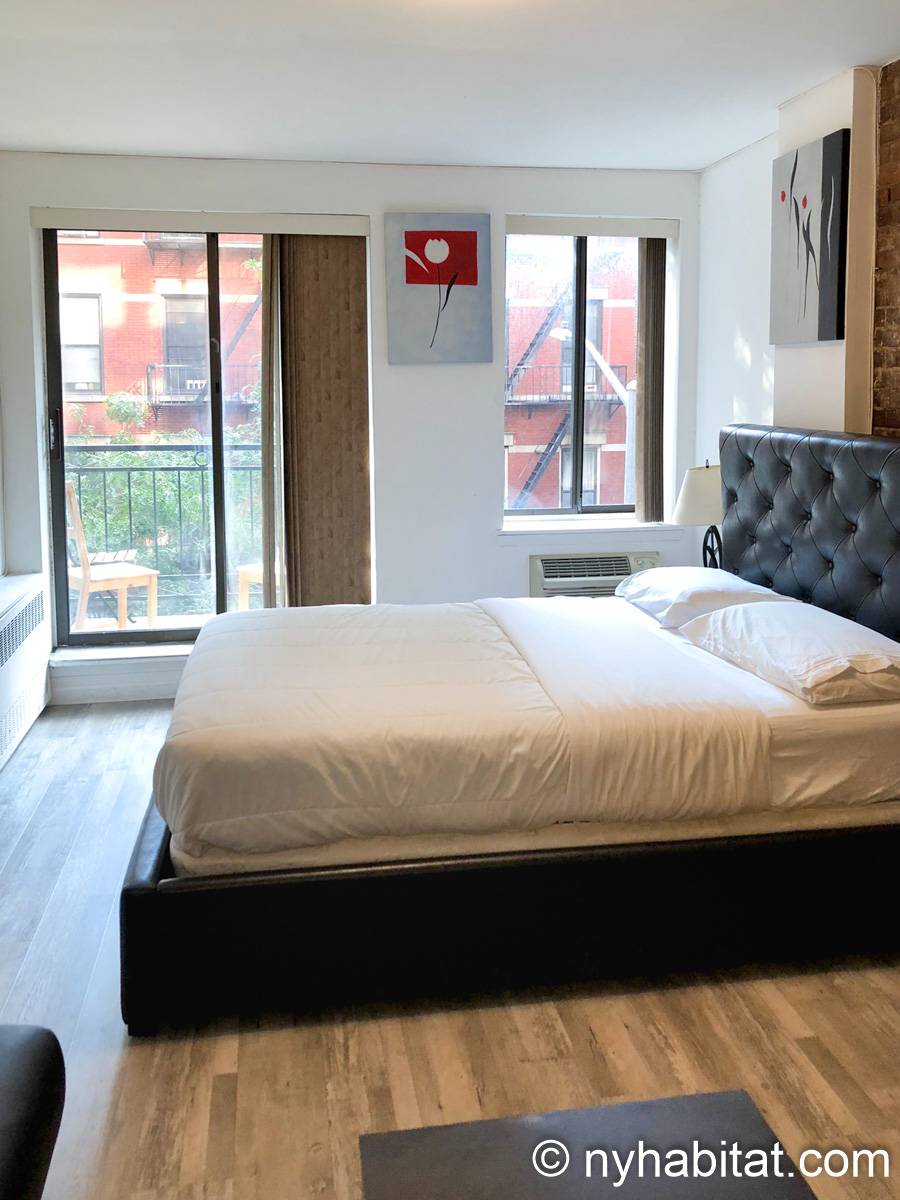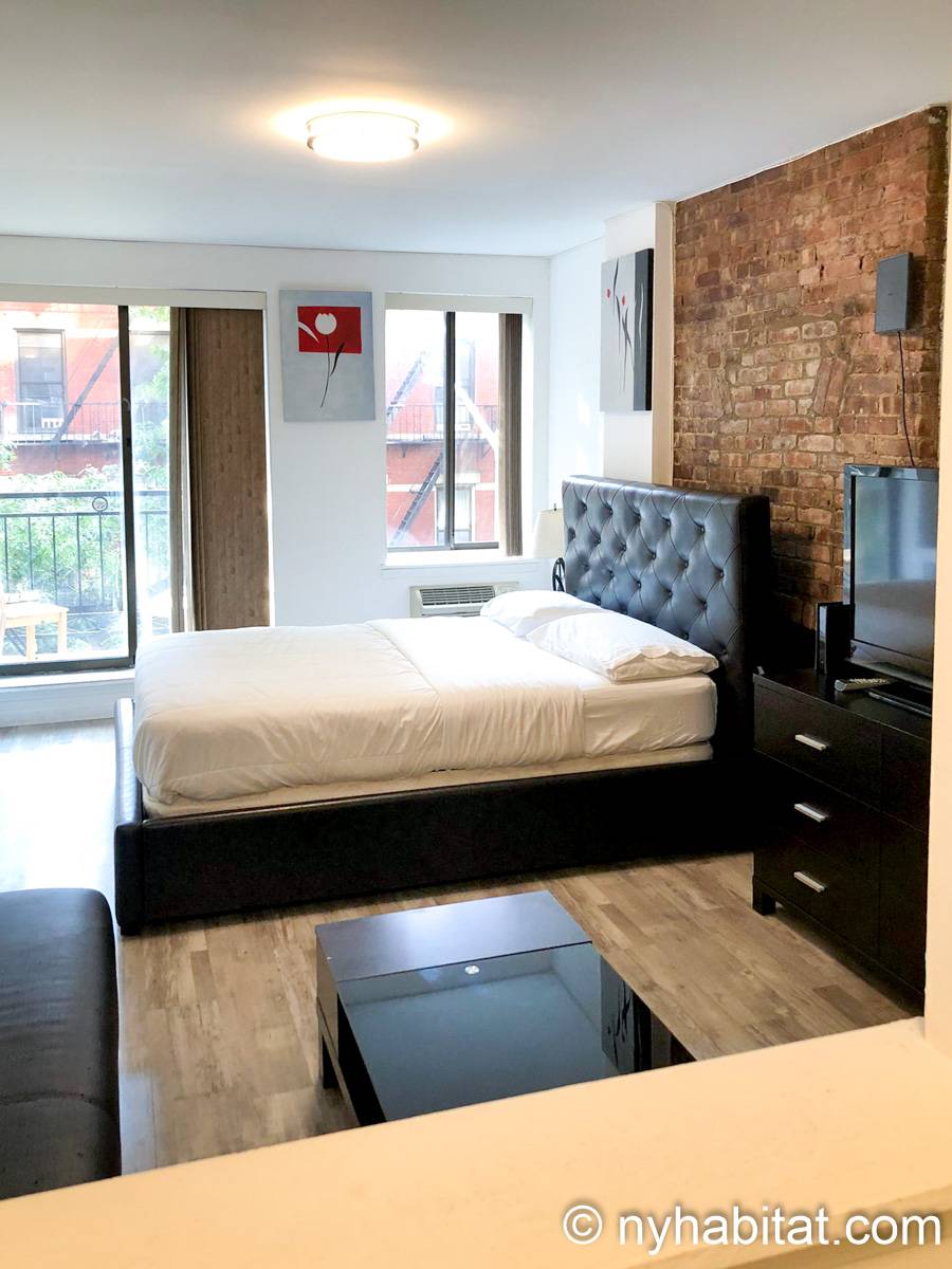 In the studio, you will find a living room, kitchen, and bathroom. The living room is accented with a brick wall and hardwood floors. It contains a sofa as well as a queen-size bed and flat-screen television. There are also two windows and air conditioning within the room. In the kitchen, you will have access to a refrigerator, freezer, oven, coffeemaker, and toaster. The room is also filled with cabinets where you can store your belongings. The bathroom is equipped with a shower, bathtub, toilet, and towels.