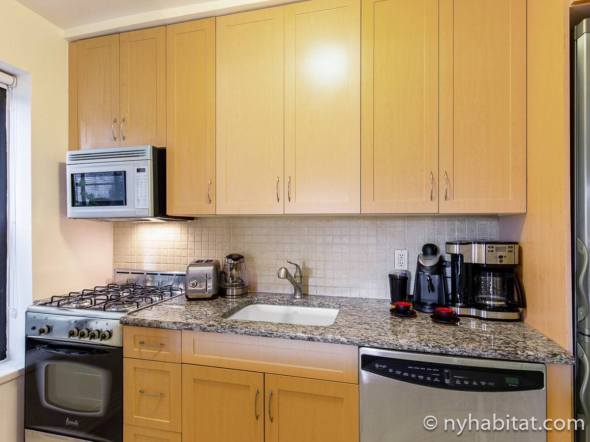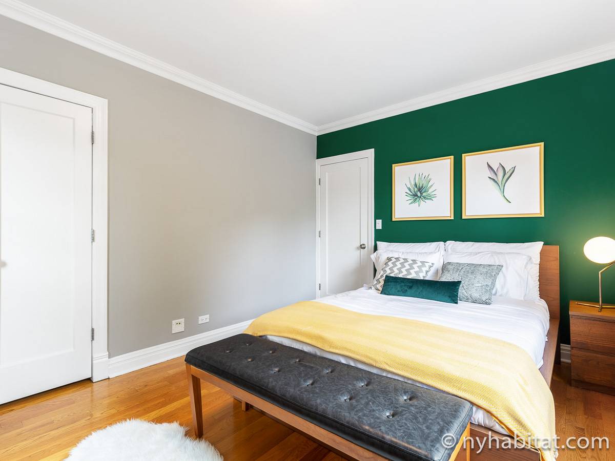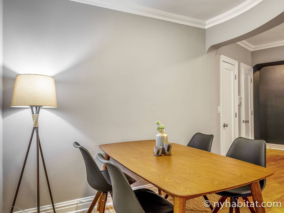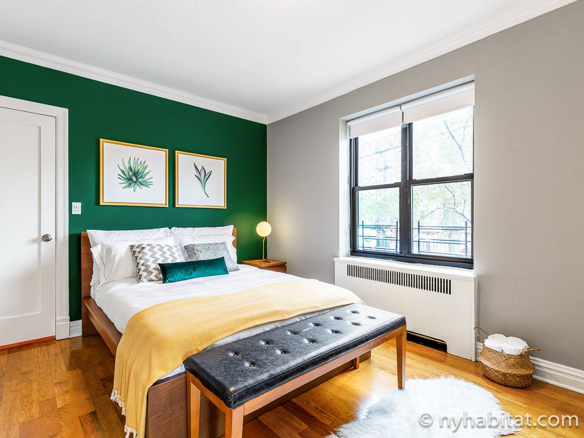 Corner windows and bold accent walls create an inviting atmosphere in this one-bedroom furnished rental. With a total of 925 square feet (approx. 86 m2), each room has an attention to detail not often found in New York City apartments. A mix of classic and contemporary furnishings sit atop hardwood flooring in the living and dining room. The separate kitchen has granite countertops and stainless-steel appliances, including a dishwasher, coffeemaker, microwave, and toaster. In the bedroom, you will find a queen-size bed, a closet, and the same hardwood flooring to unify the space. Each room in this apartment rental has a window, including the kitchen and the bathroom, which is equipped with a bathtub and shower combination.