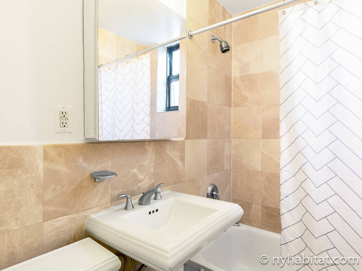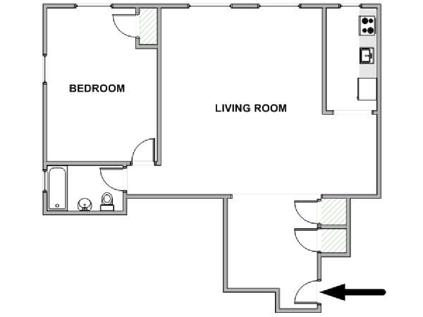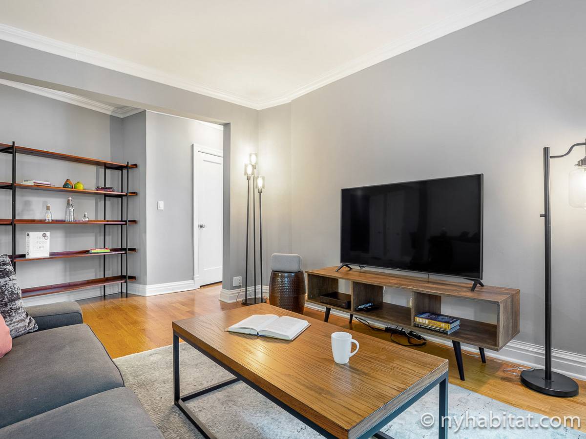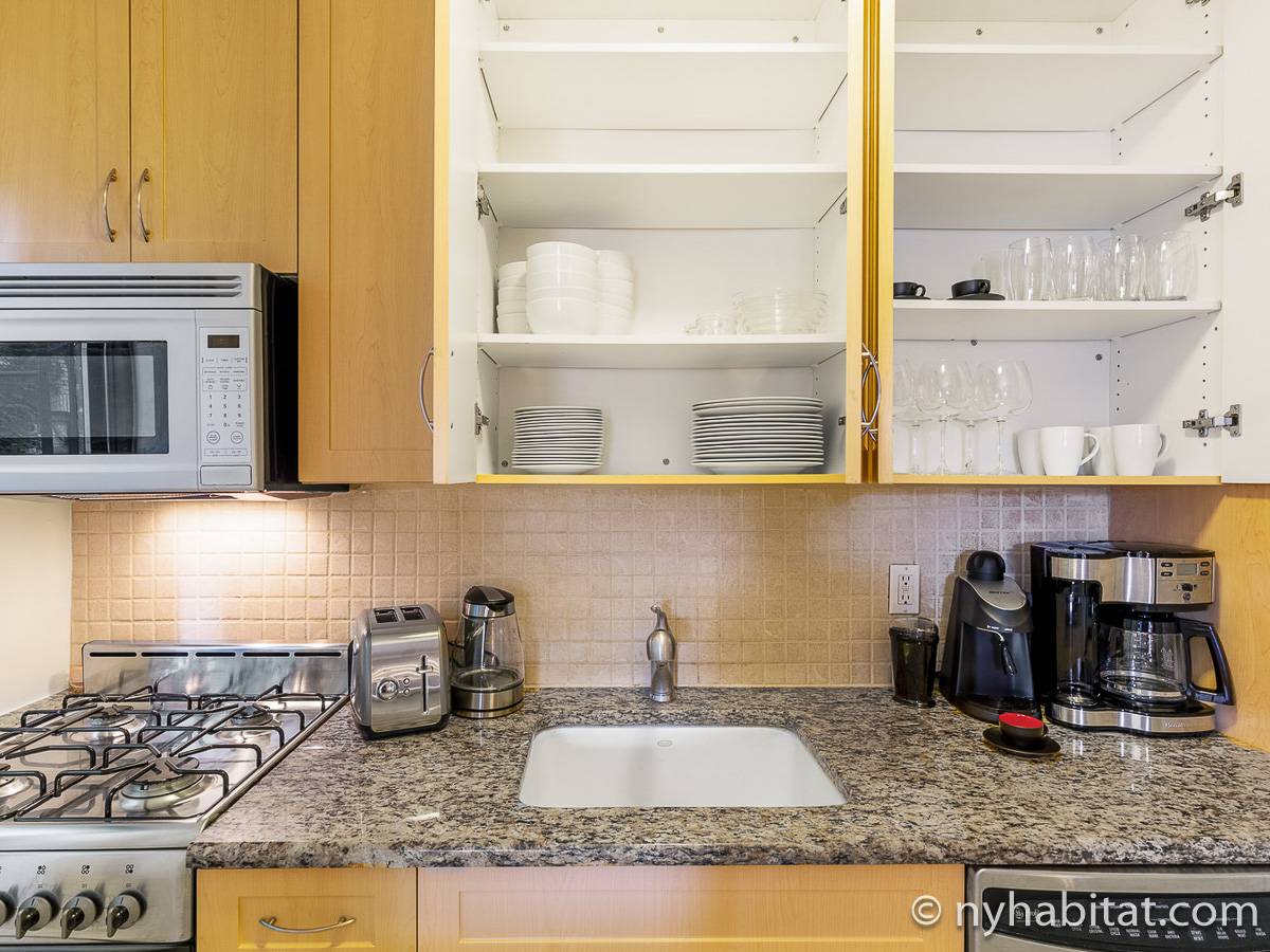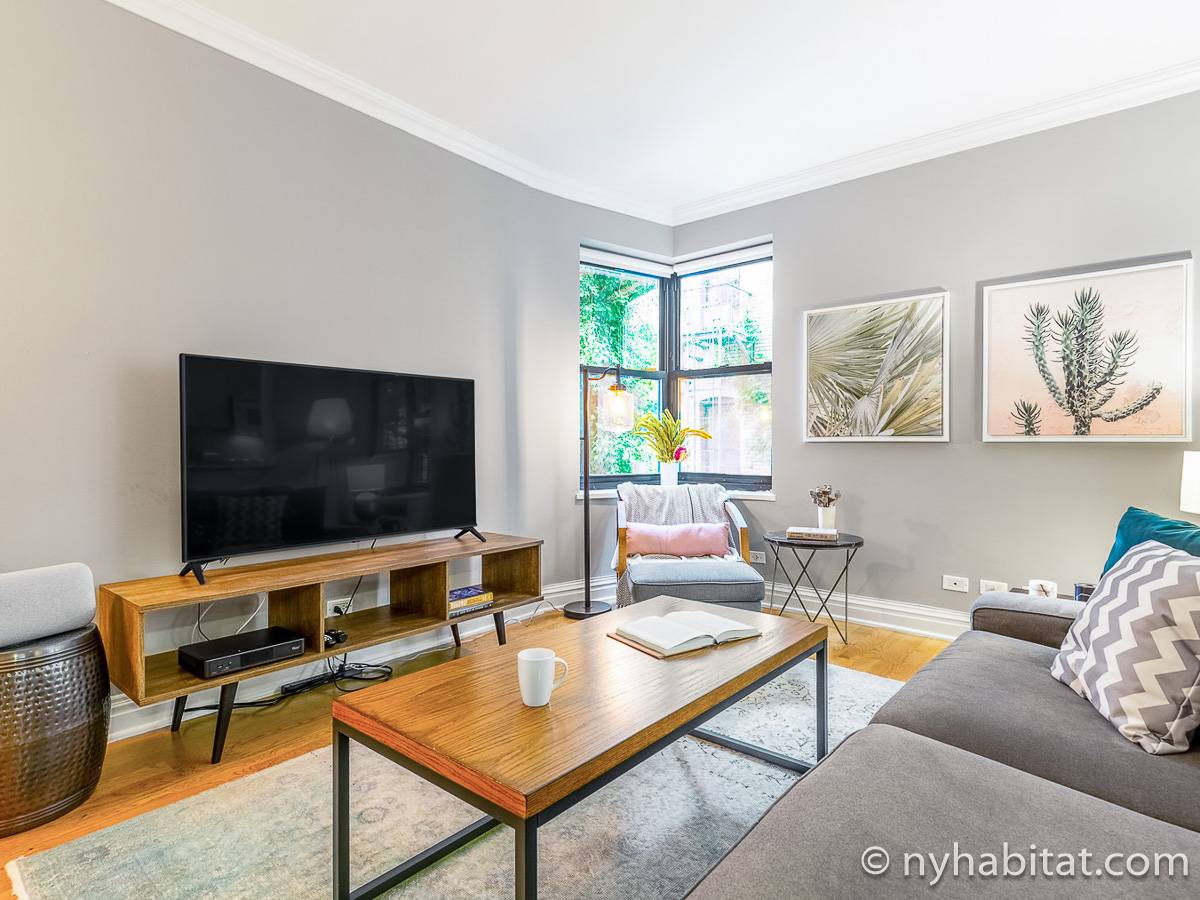 Corner windows and bold accent walls create an inviting atmosphere in this one-bedroom furnished rental. With a total of 925 square feet (approx. 86 m2), each room has an attention to detail not often found in New York City apartments. A mix of classic and contemporary furnishings sit atop hardwood flooring in the living and dining room. The separate kitchen has granite countertops and stainless-steel appliances, including a dishwasher, coffeemaker, microwave, and toaster. In the bedroom, you will find a queen-size bed, a closet, and the same hardwood flooring to unify the space. Each room in this apartment rental has a window, including the kitchen and the bathroom, which is equipped with a bathtub and shower combination.