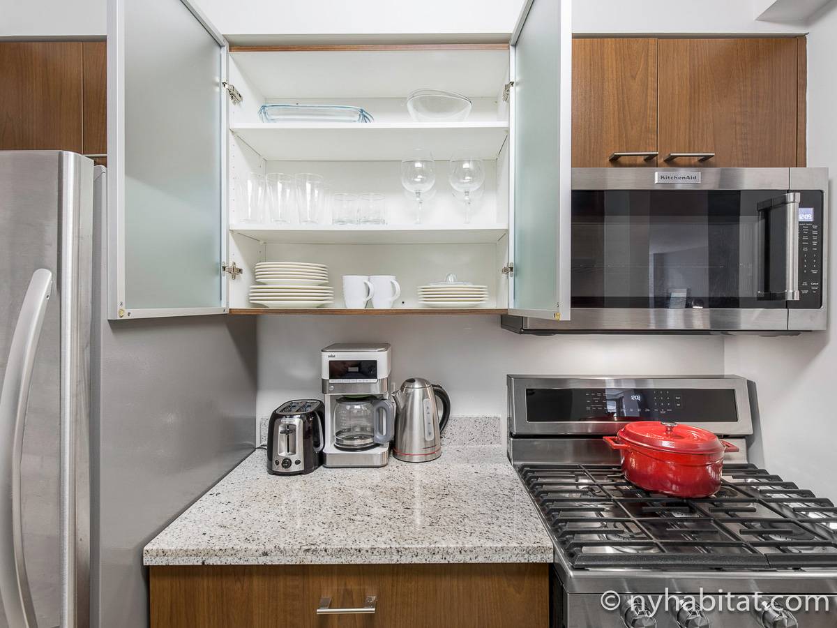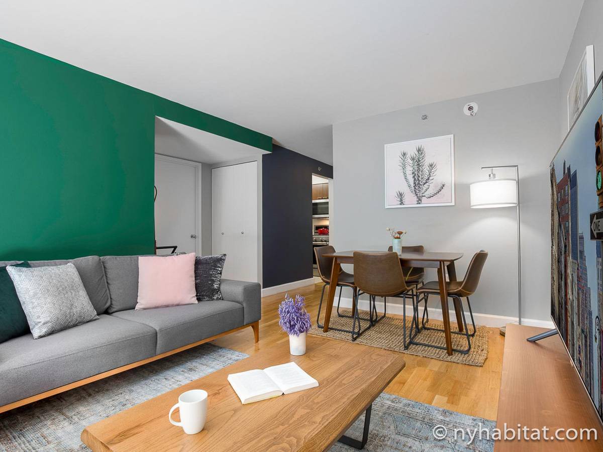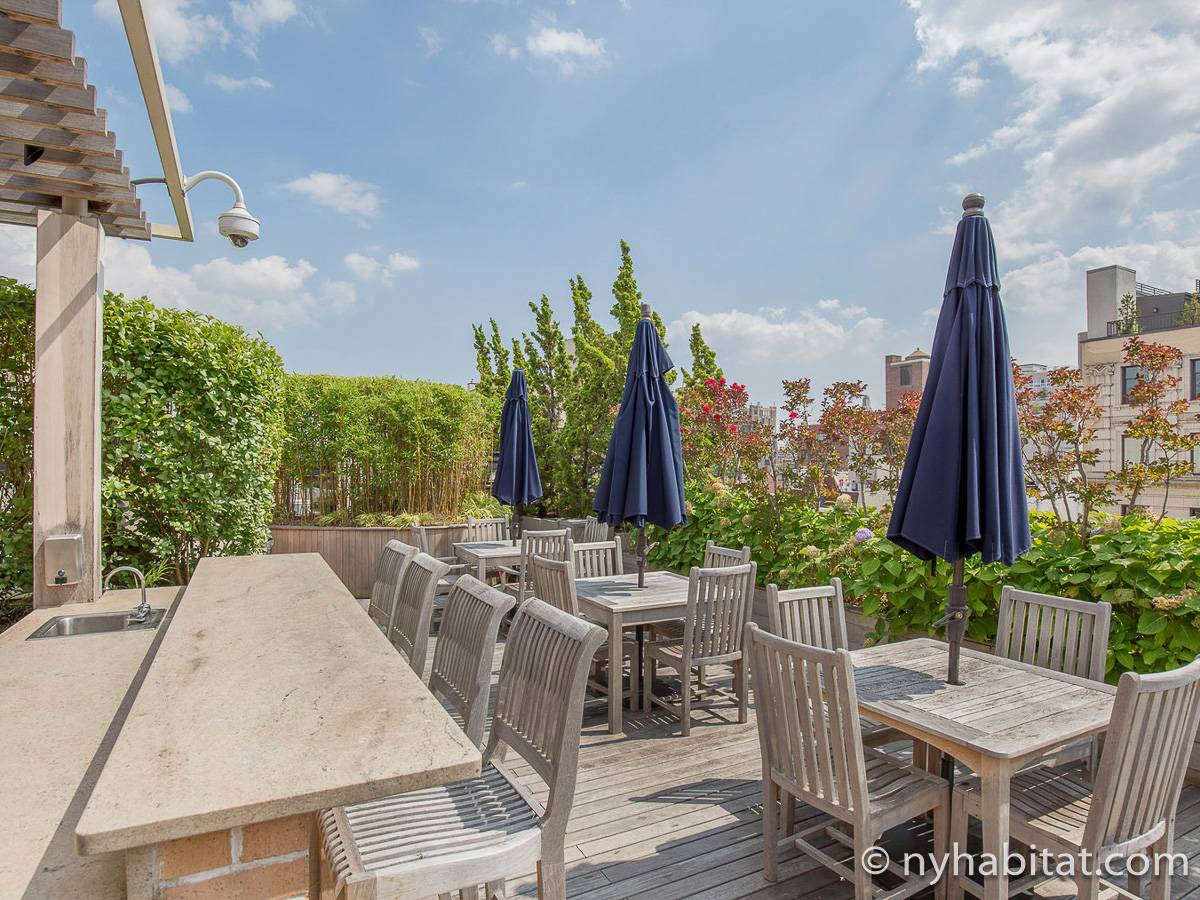 The furnished rental is on the 3rd floor (same as the 2nd floor in Europe) of a 14-story building with an elevator located between West 15th Street & 6th Avenue. The building features a gym and rooftop deck and also has a doorman.