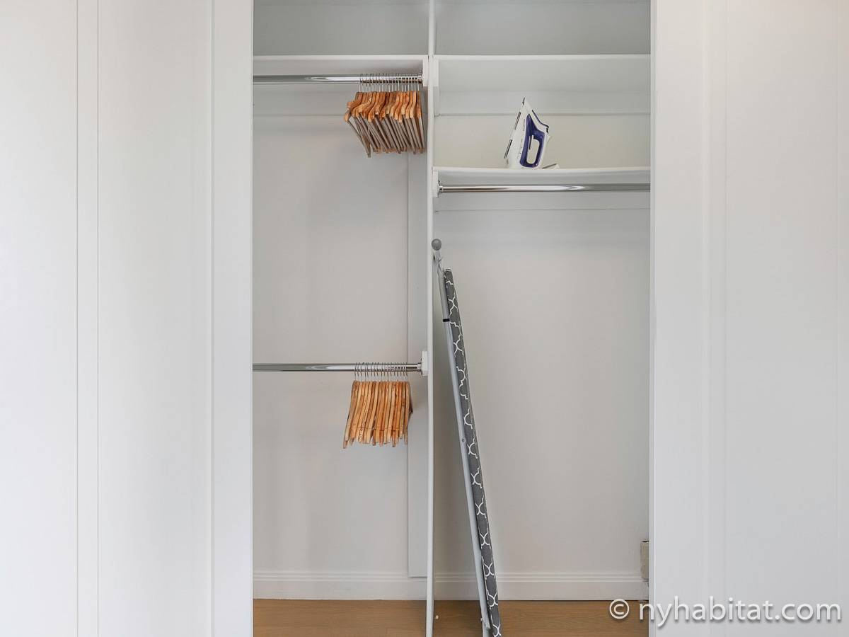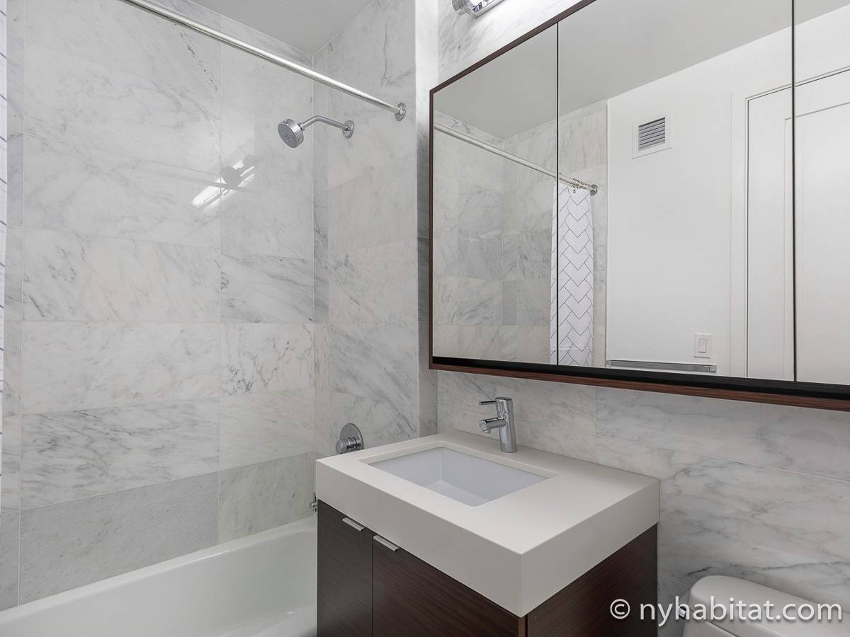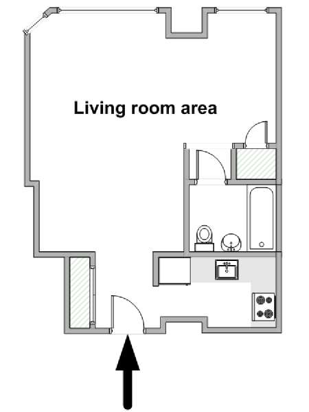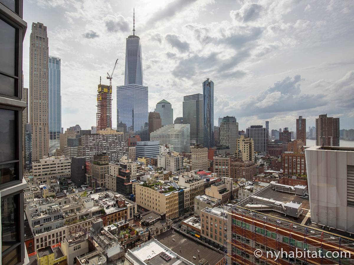 This furnished studio apartment is located on the 27th floor (equivalent to the 26th floor in Europe) of a 52-story high-rise building in Manhattan, New York City. On Duane Street and Broadway, the elevator building features a doorman, laundry facilities, a gym, a pool, and a garden in the Tribeca neighborhood.