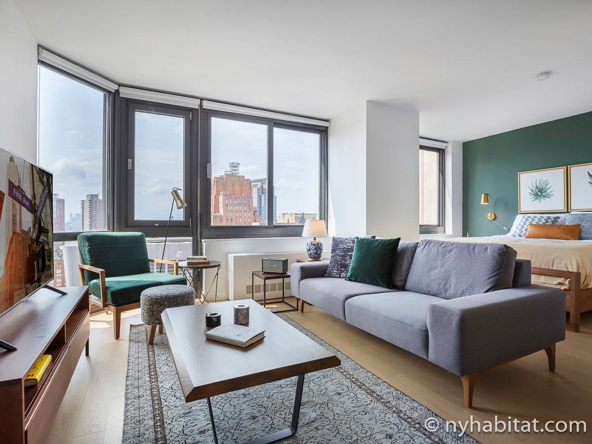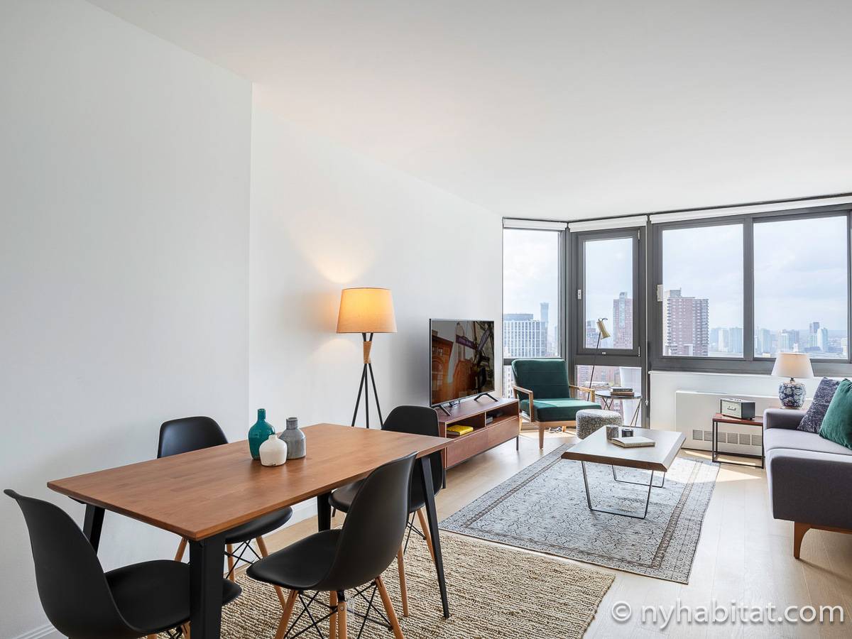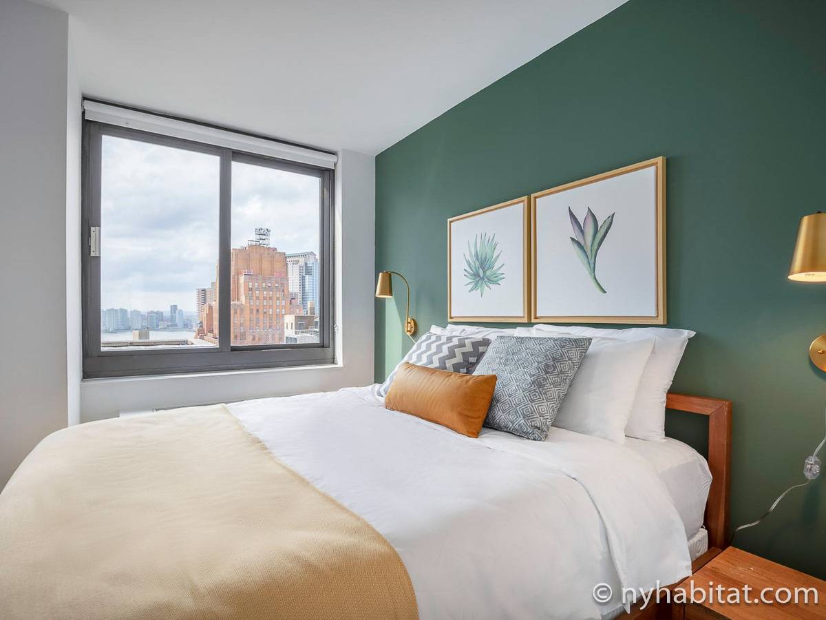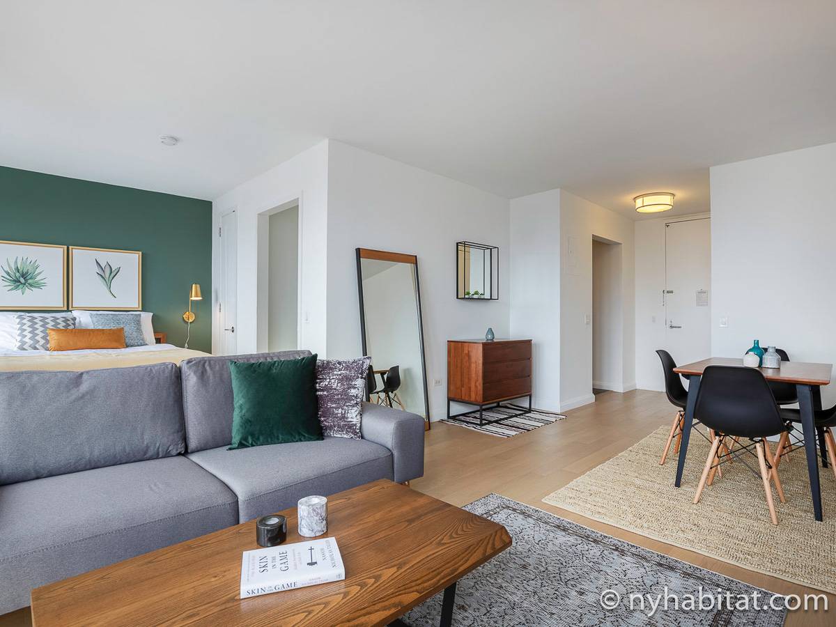 The furnished apartment features hardwood floors, contemporary style furniture, stainless steel appliances, and air conditioning. Enjoy stunning views of Manhattan from the wall-to-wall windows. Natural sunlight and bold accent walls unify the inviting space. This 577-square-foot furnished rental (around 53 m2) includes a living room, a bathroom, and a separate kitchen. You will find a sofa, a coffee table, a TV, and a dining table in the living room. There is a queen-size bed and a closet in the bedroom area. The bathroom has a tile interior with a bathtub/shower. The separate kitchen features an oven, a fridge, a microwave, a coffee maker, a toaster, and a dishwasher.