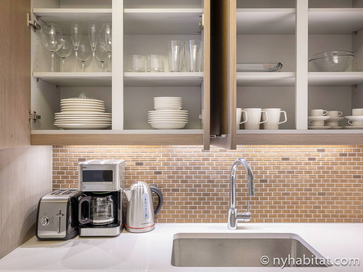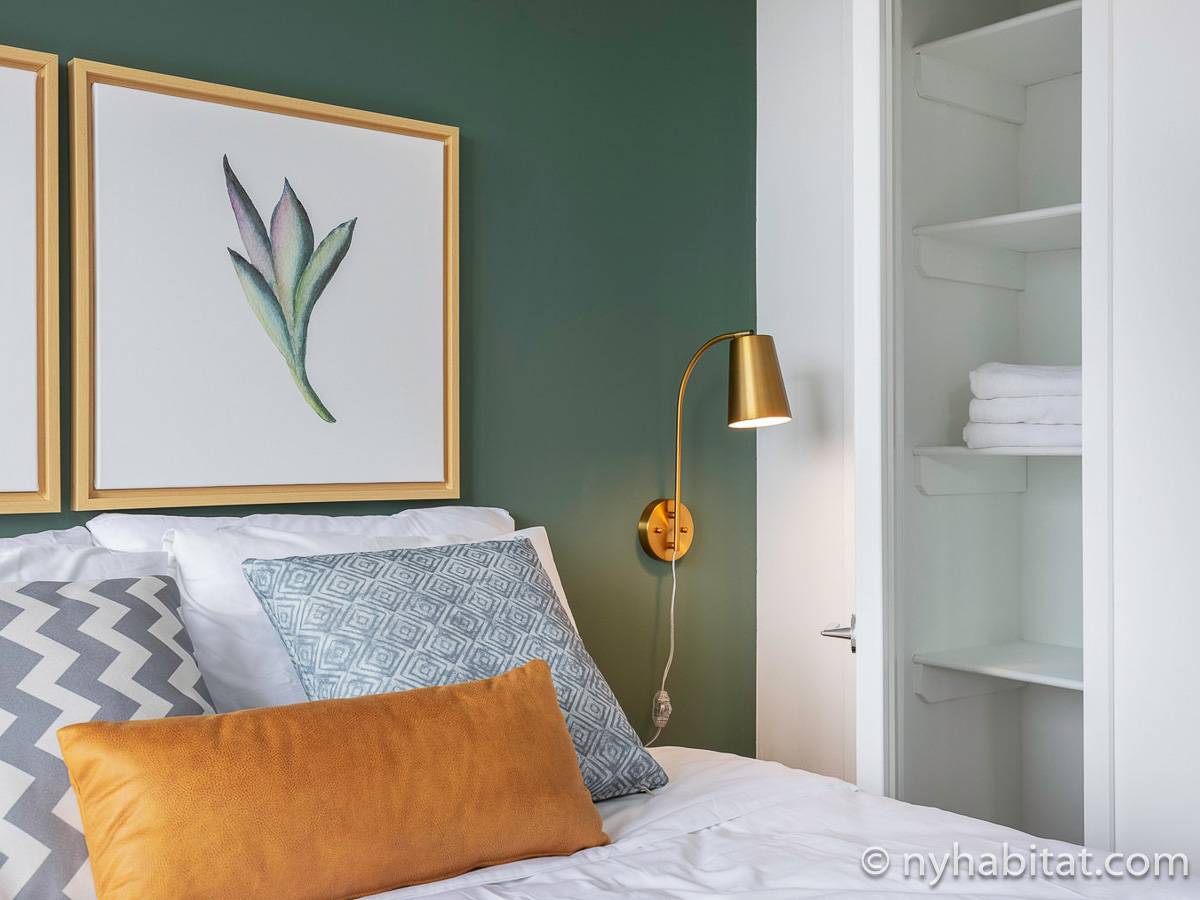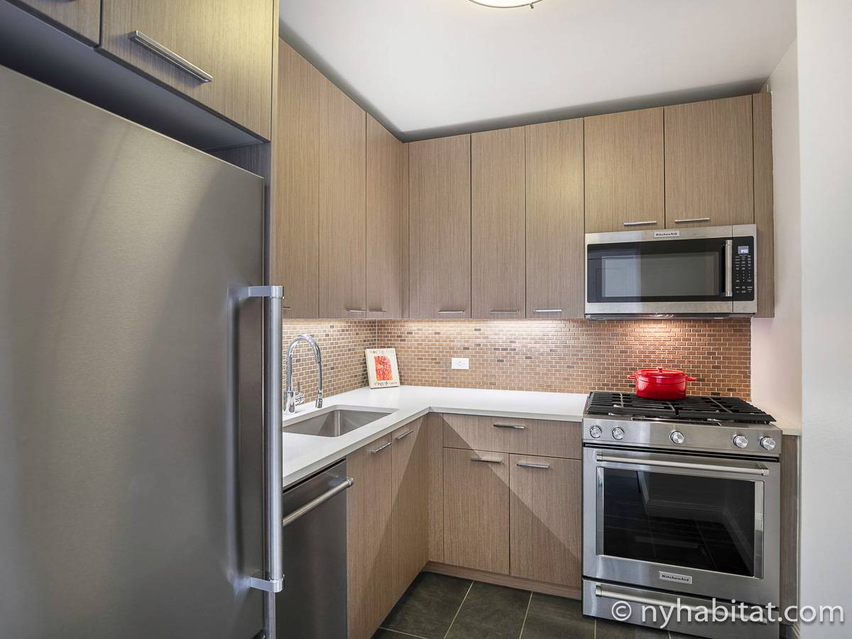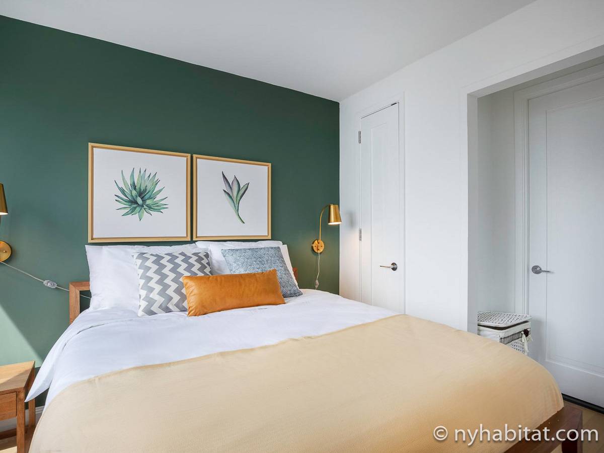 The furnished apartment features hardwood floors, contemporary style furniture, stainless steel appliances, and air conditioning. Enjoy stunning views of Manhattan from the wall-to-wall windows. Natural sunlight and bold accent walls unify the inviting space. This 577-square-foot furnished rental (around 53 m2) includes a living room, a bathroom, and a separate kitchen. You will find a sofa, a coffee table, a TV, and a dining table in the living room. There is a queen-size bed and a closet in the bedroom area. The bathroom has a tile interior with a bathtub/shower. The separate kitchen features an oven, a fridge, a microwave, a coffee maker, a toaster, and a dishwasher.
