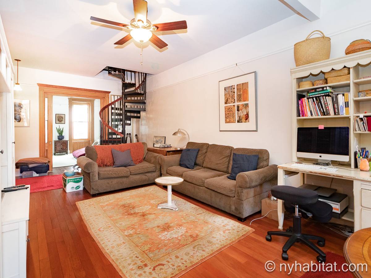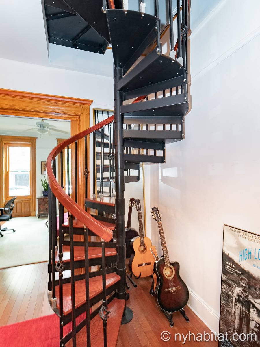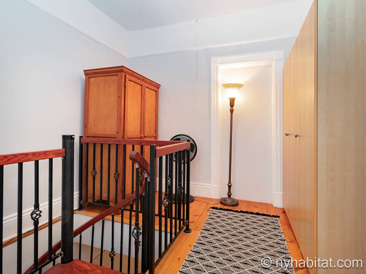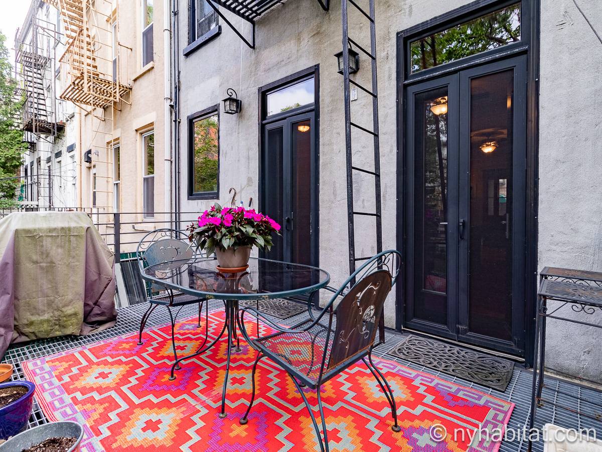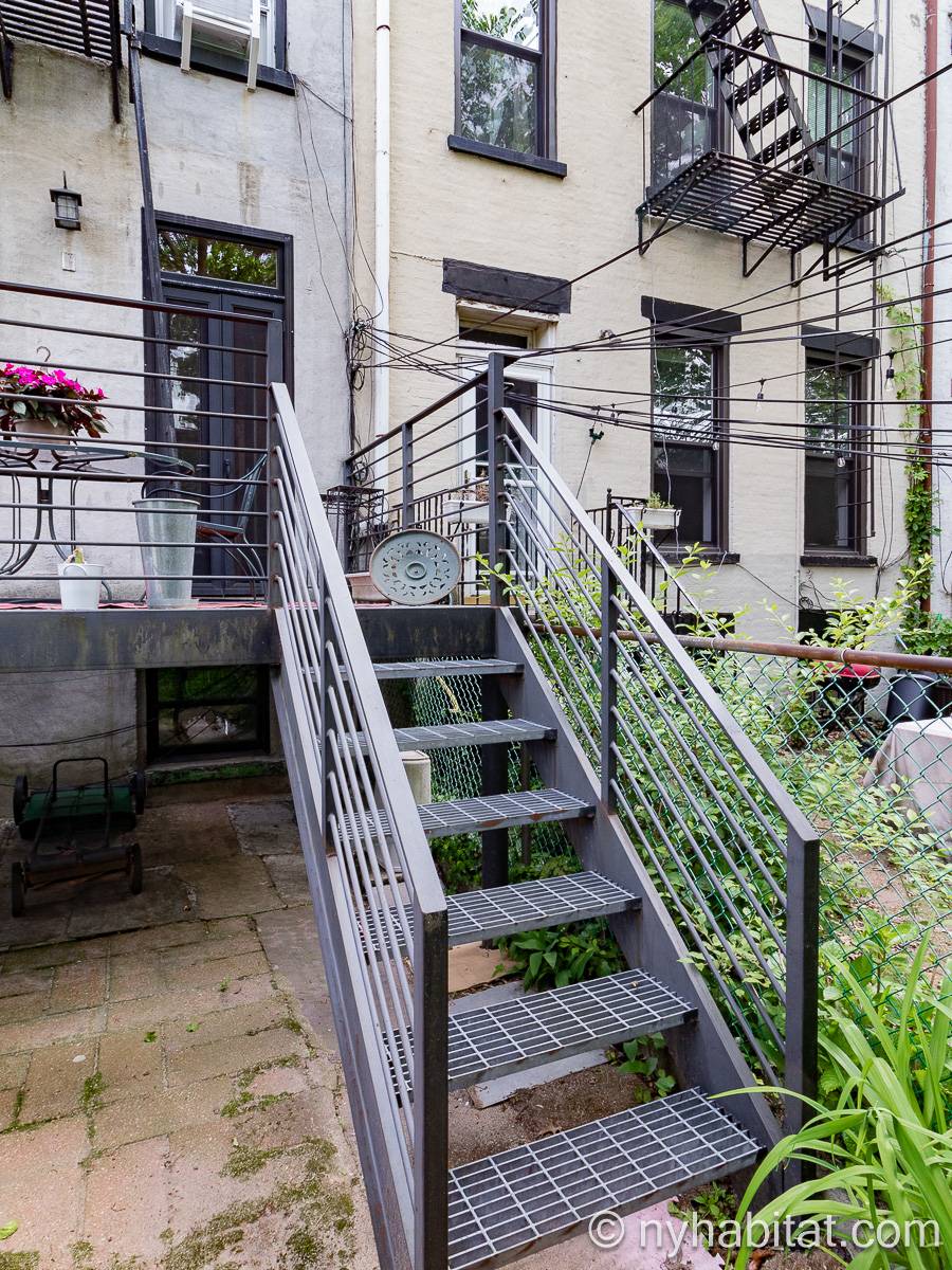 This two-bedroom, one-bathroom furnished apartment is a duplex and is in Park Slope, Brooklyn on the corner of 12th Street and 5th Avenue. This apartment is on the first and second floor (equivalent to the ground floor and first floor in Europe) of a townhouse, which includes a terrace and a garden. Laundry machines are located in the basement of the building.