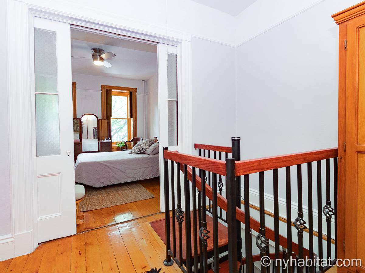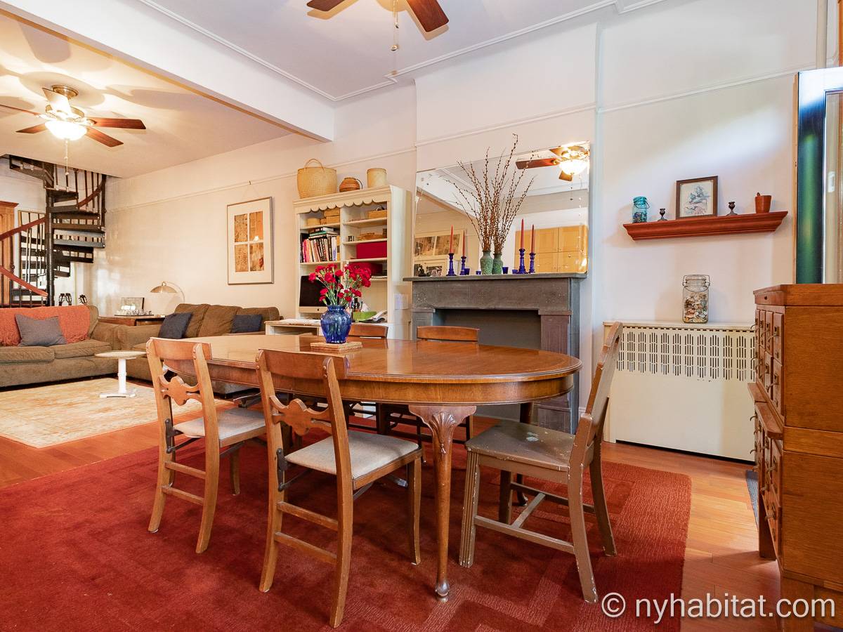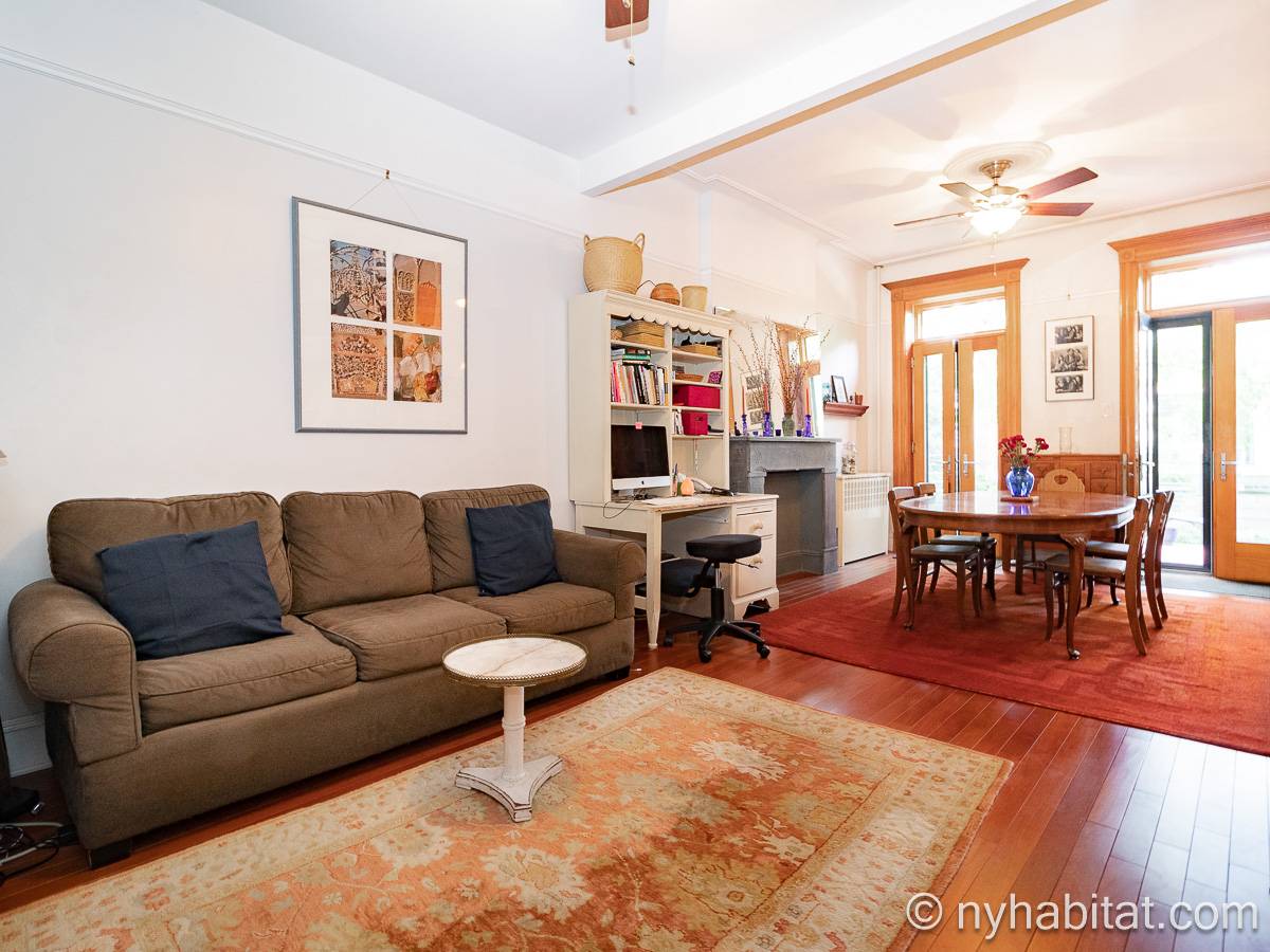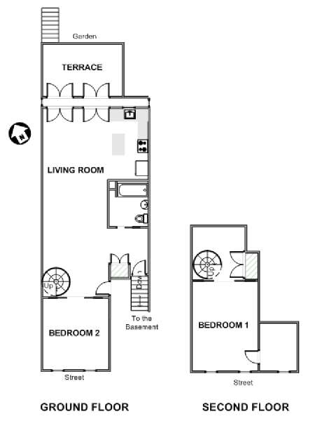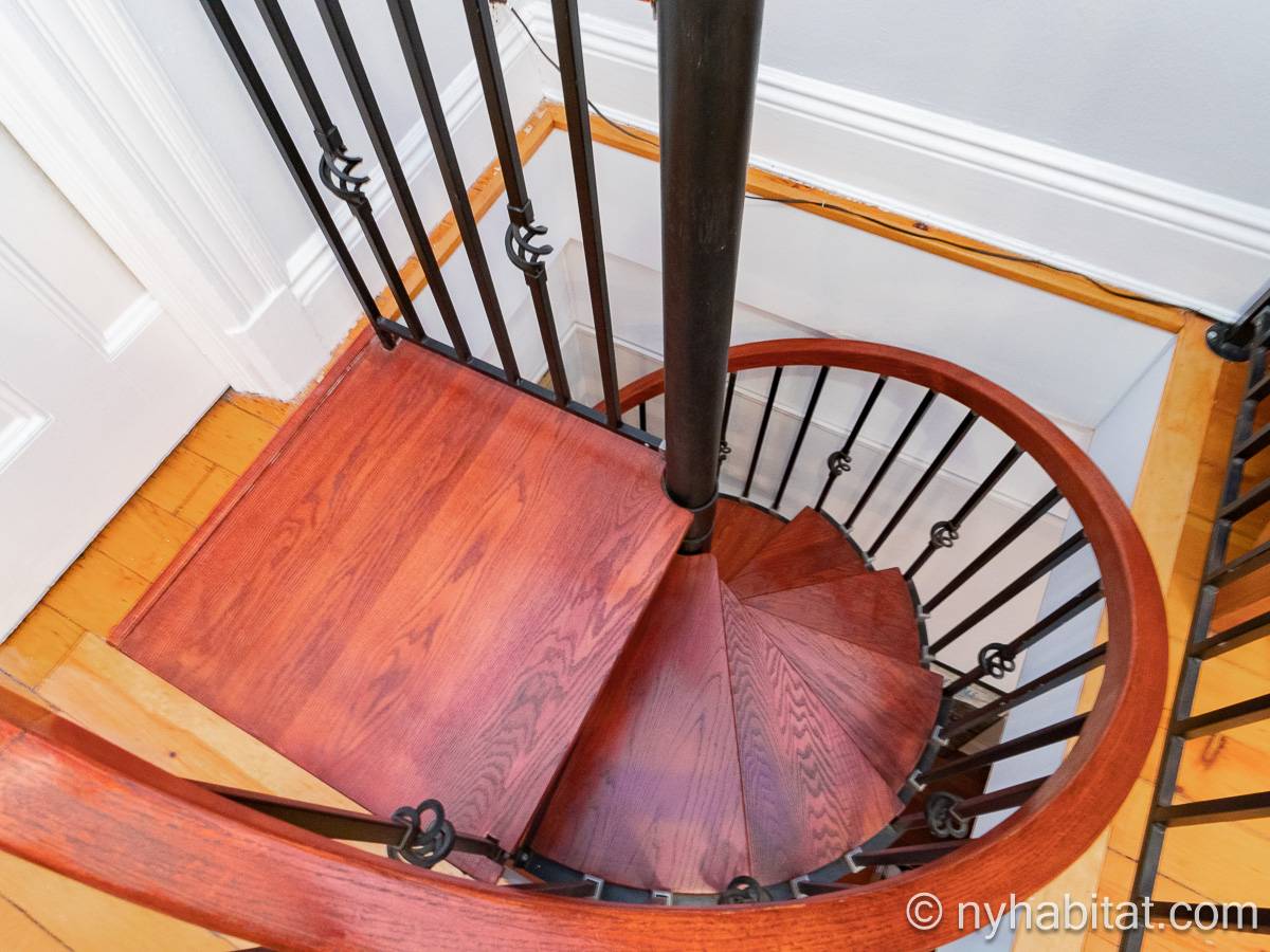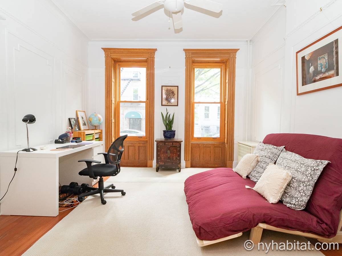 This two-bedroom, one-bathroom furnished apartment is a duplex and is in Park Slope, Brooklyn on the corner of 12th Street and 5th Avenue. This apartment is on the first and second floor (equivalent to the ground floor and first floor in Europe) of a townhouse, which includes a terrace and a garden. Laundry machines are located in the basement of the building.