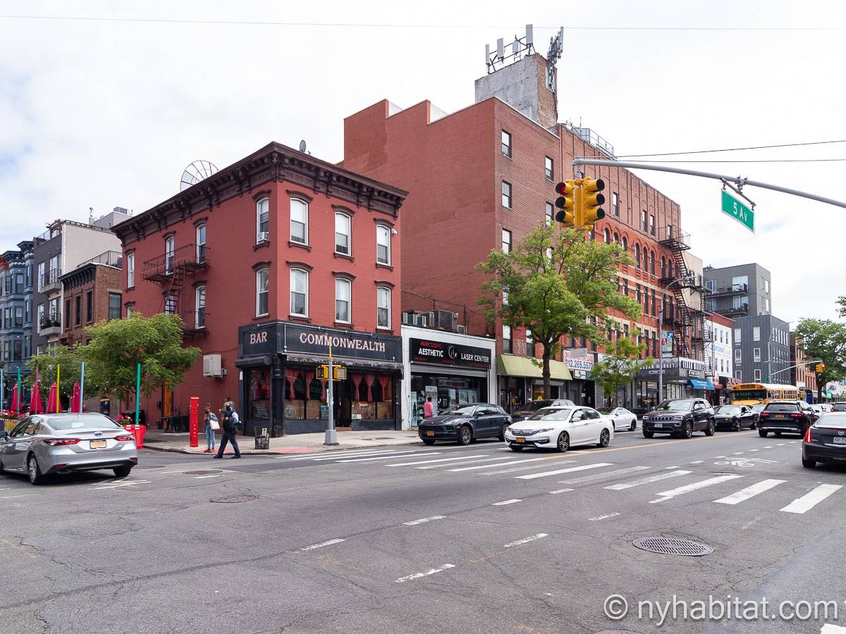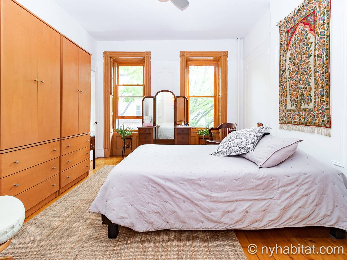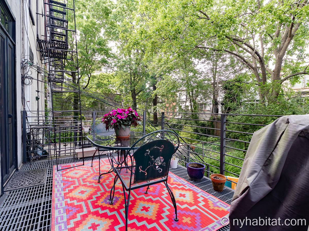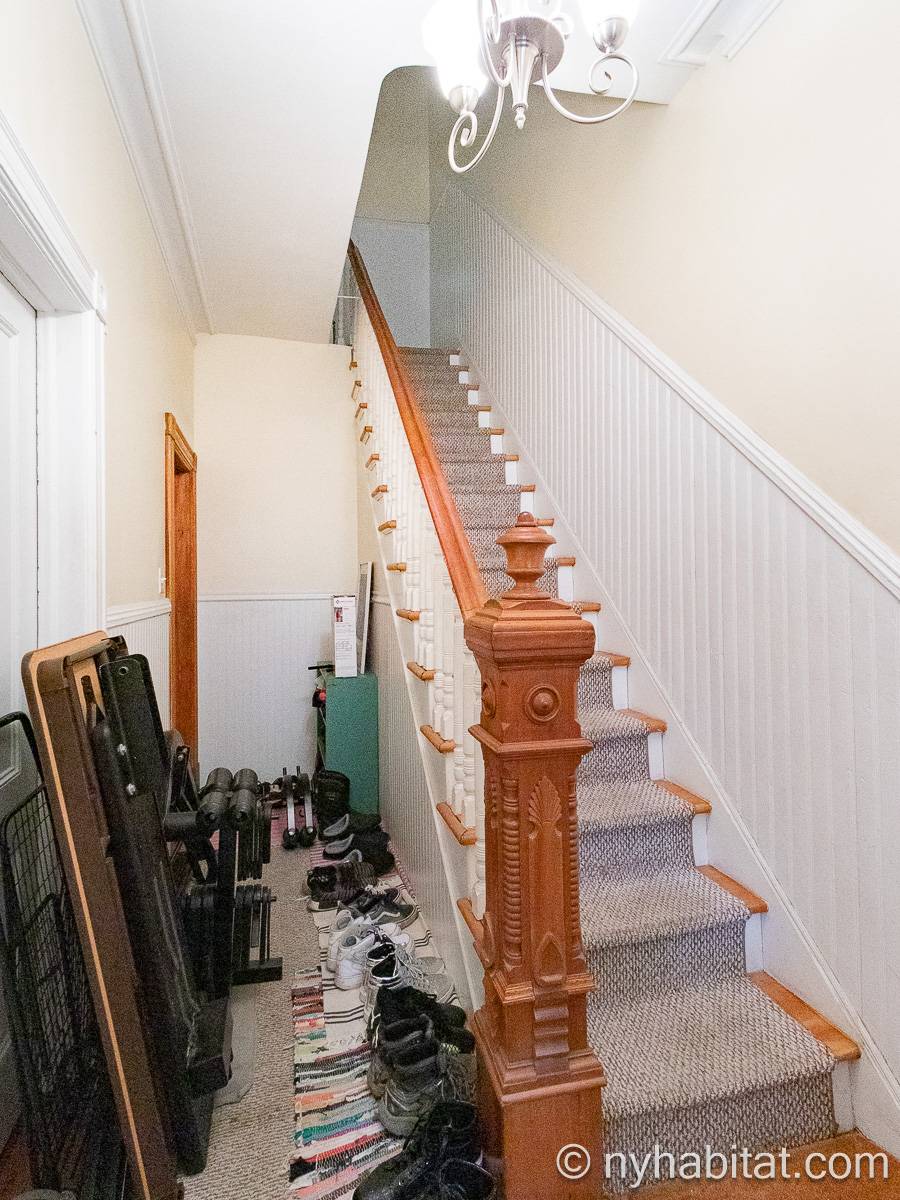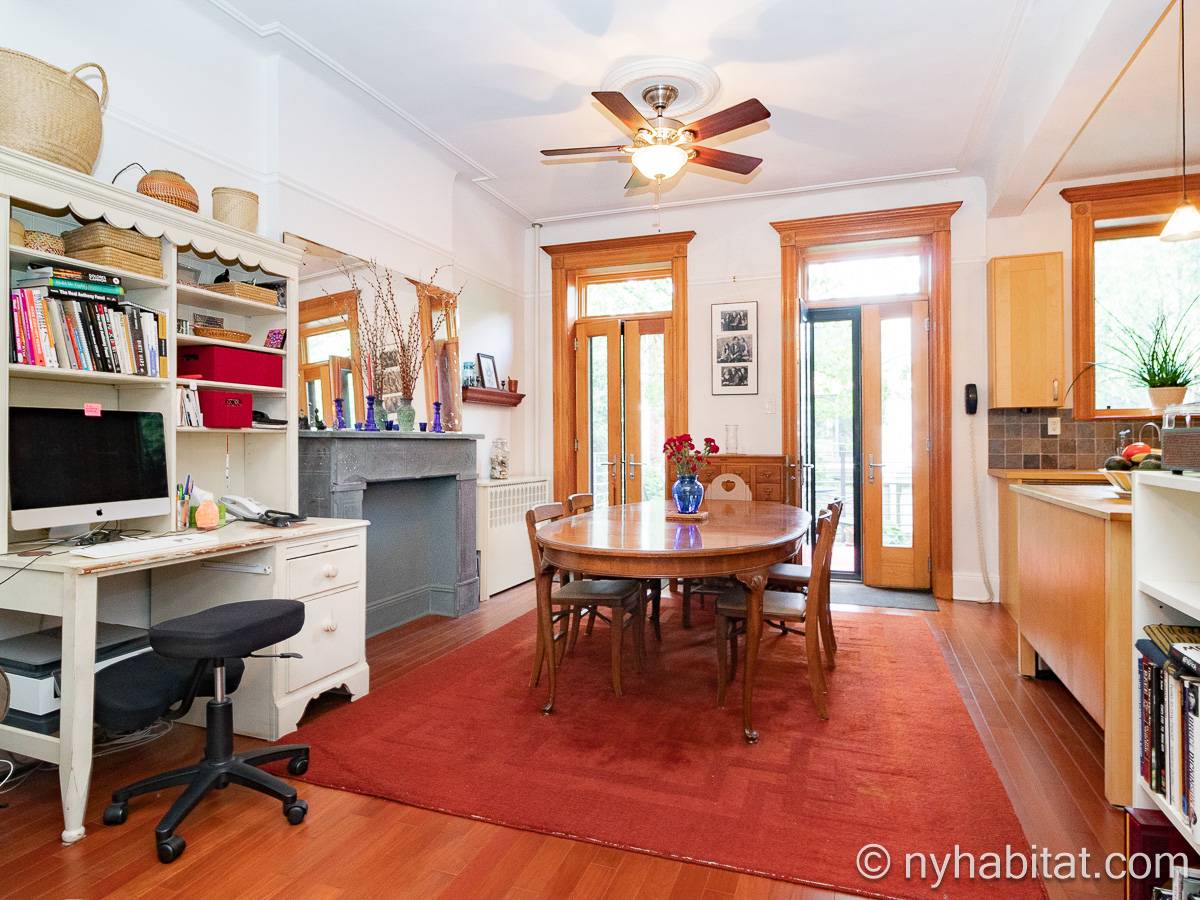 This two-bedroom, one-bathroom furnished apartment is a duplex and is in Park Slope, Brooklyn on the corner of 12th Street and 5th Avenue. This apartment is on the first and second floor (equivalent to the ground floor and first floor in Europe) of a townhouse, which includes a terrace and a garden. Laundry machines are located in the basement of the building.