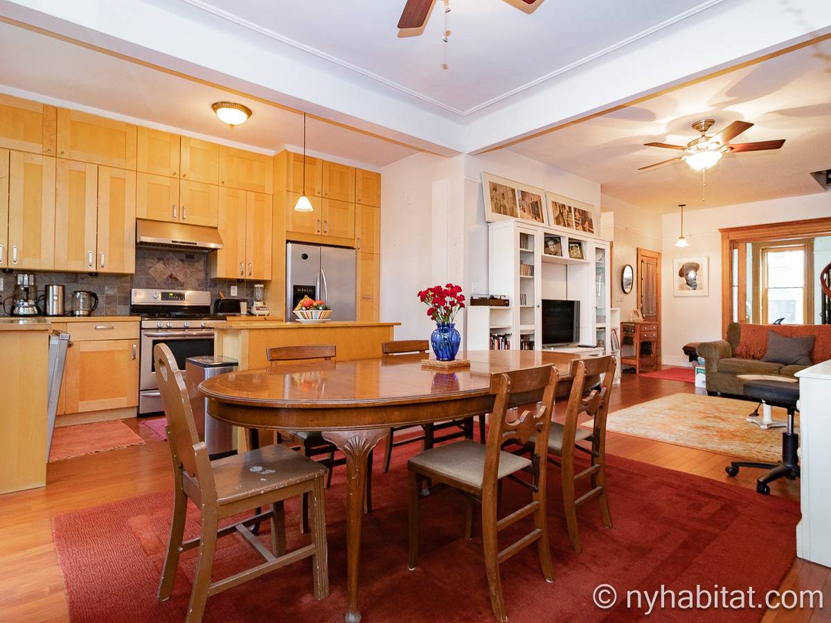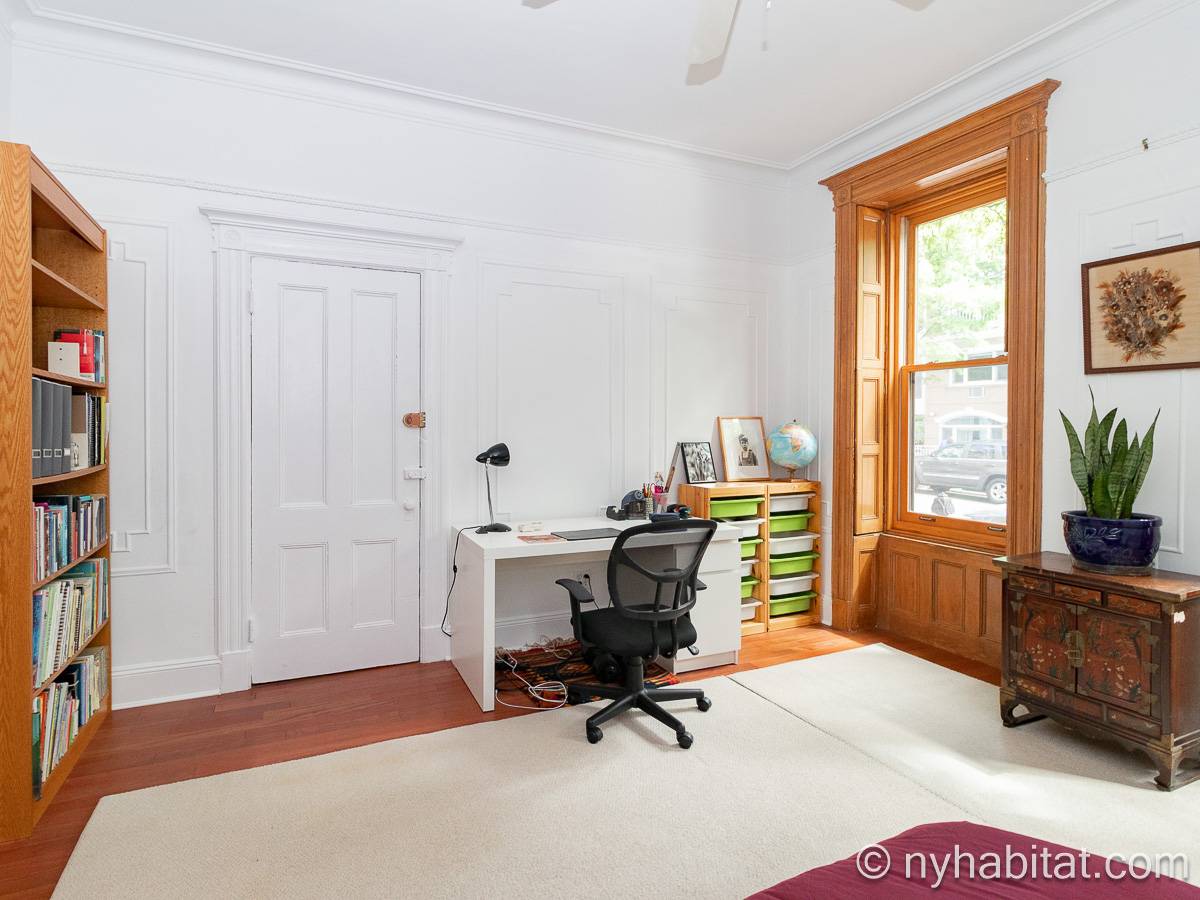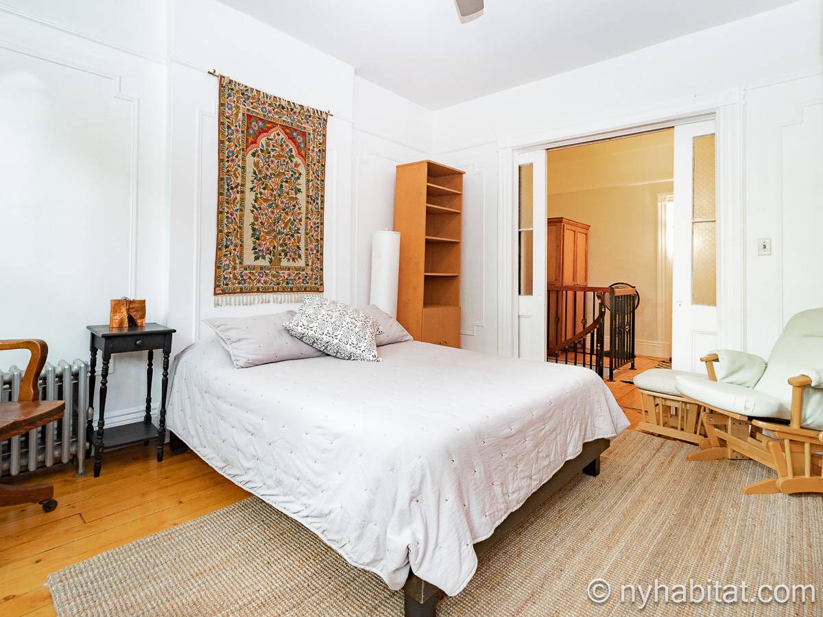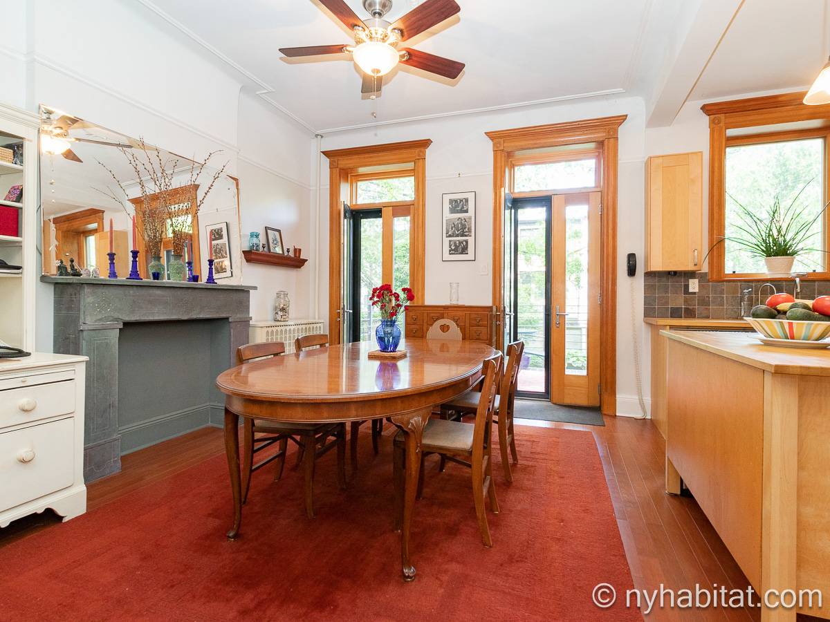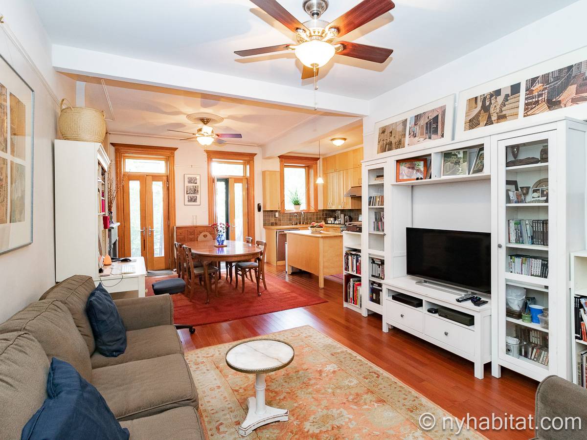 This two-bedroom, one-bathroom furnished apartment is a duplex and is in Park Slope, Brooklyn on the corner of 12th Street and 5th Avenue. This apartment is on the first and second floor (equivalent to the ground floor and first floor in Europe) of a townhouse, which includes a terrace and a garden. Laundry machines are located in the basement of the building.