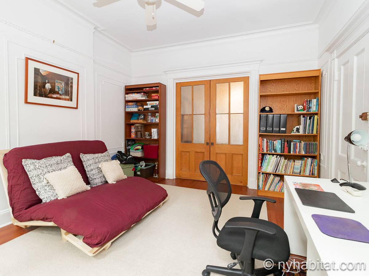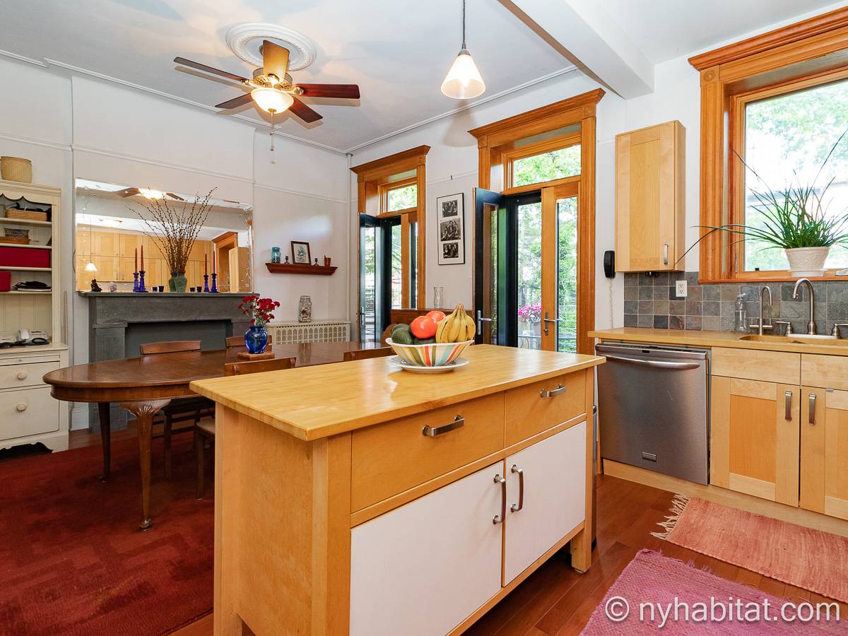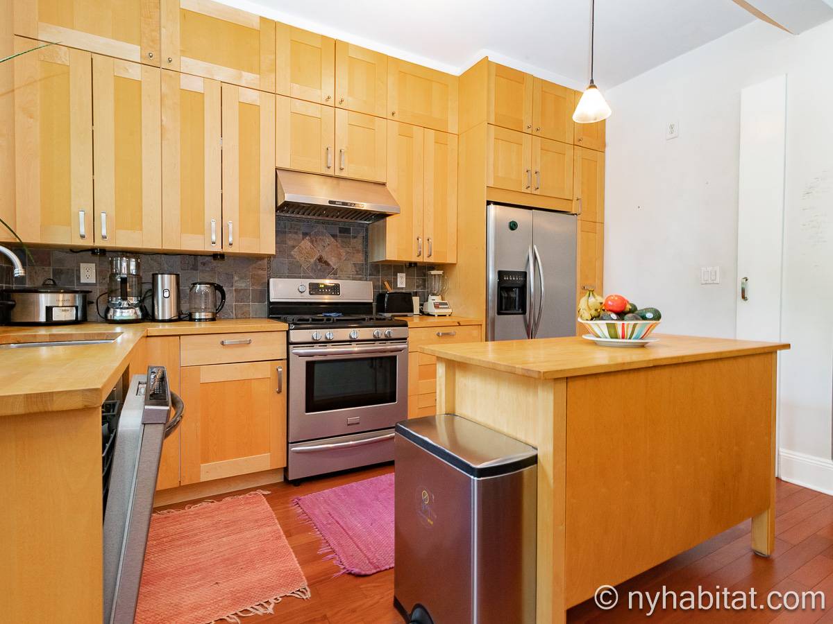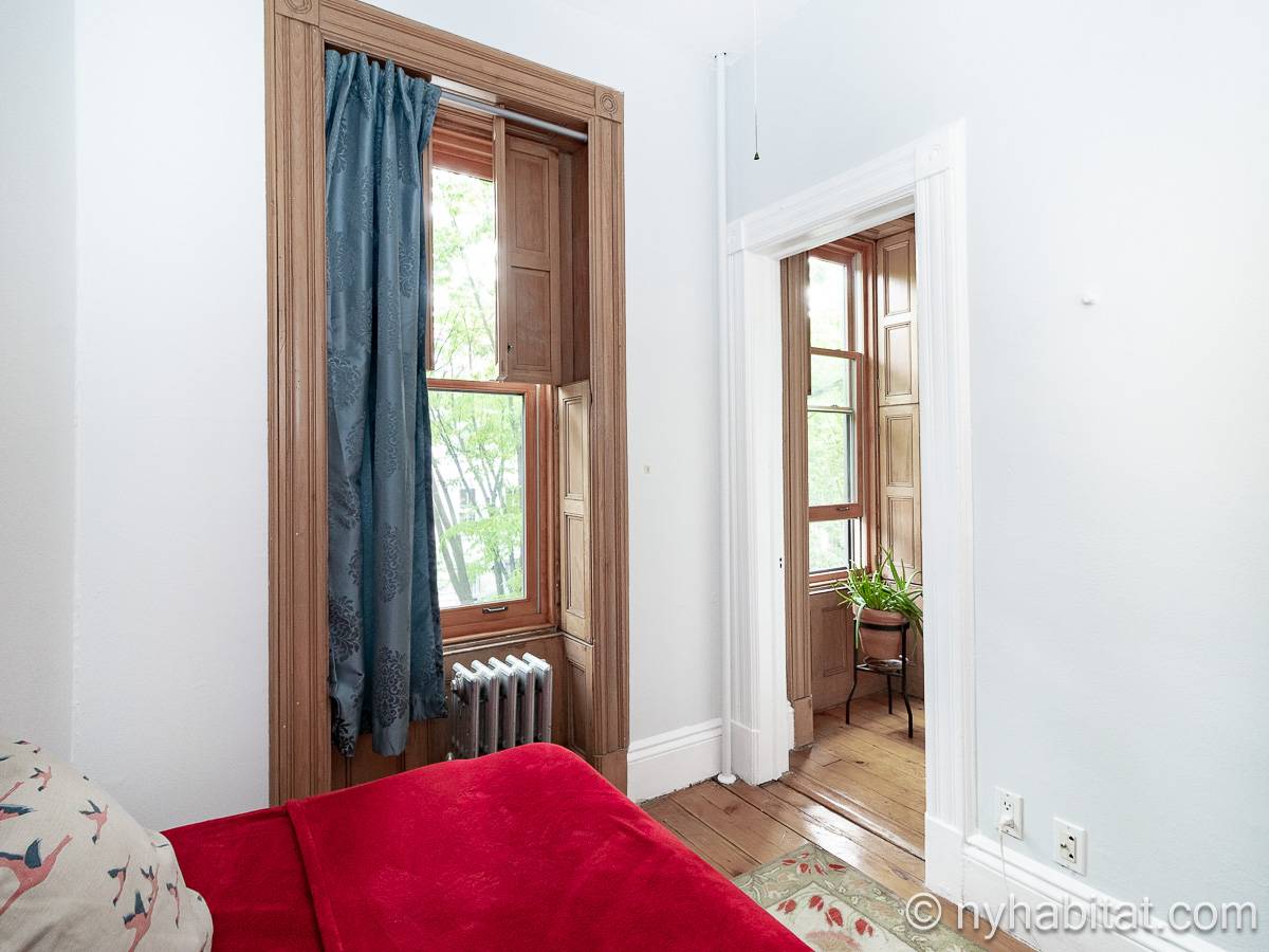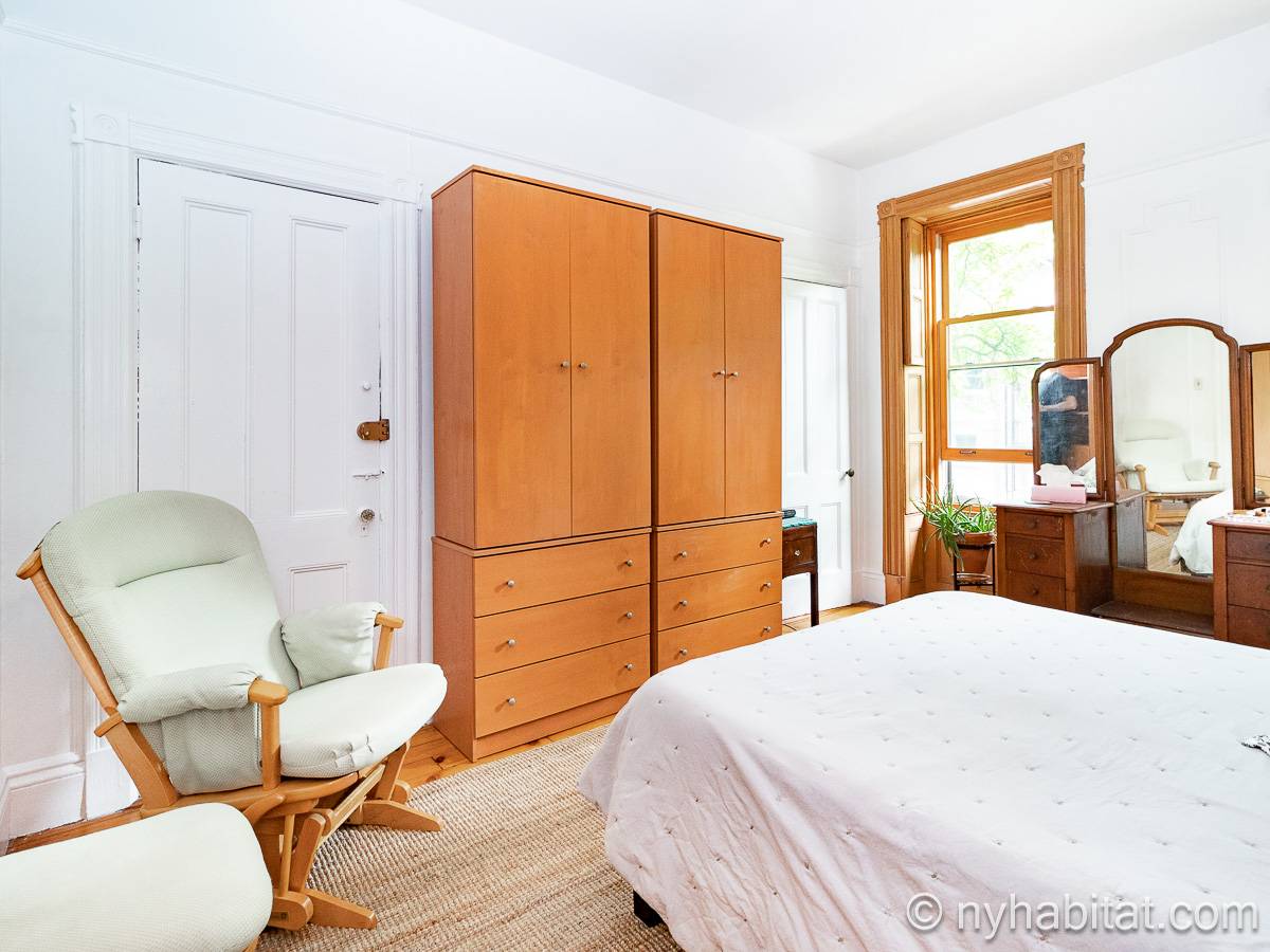 This two-bedroom, one-bathroom furnished apartment is a duplex and is in Park Slope, Brooklyn on the corner of 12th Street and 5th Avenue. This apartment is on the first and second floor (equivalent to the ground floor and first floor in Europe) of a townhouse, which includes a terrace and a garden. Laundry machines are located in the basement of the building.