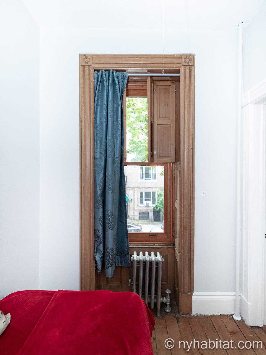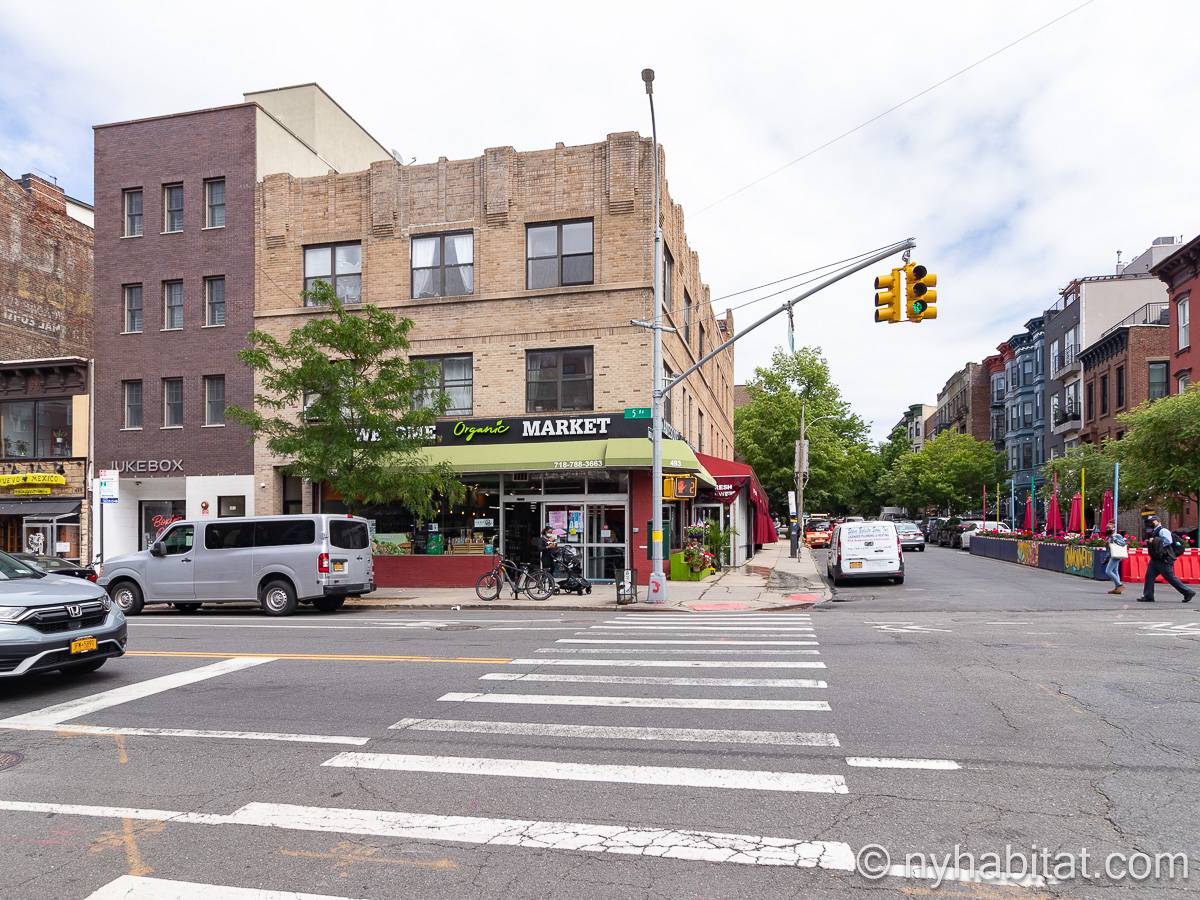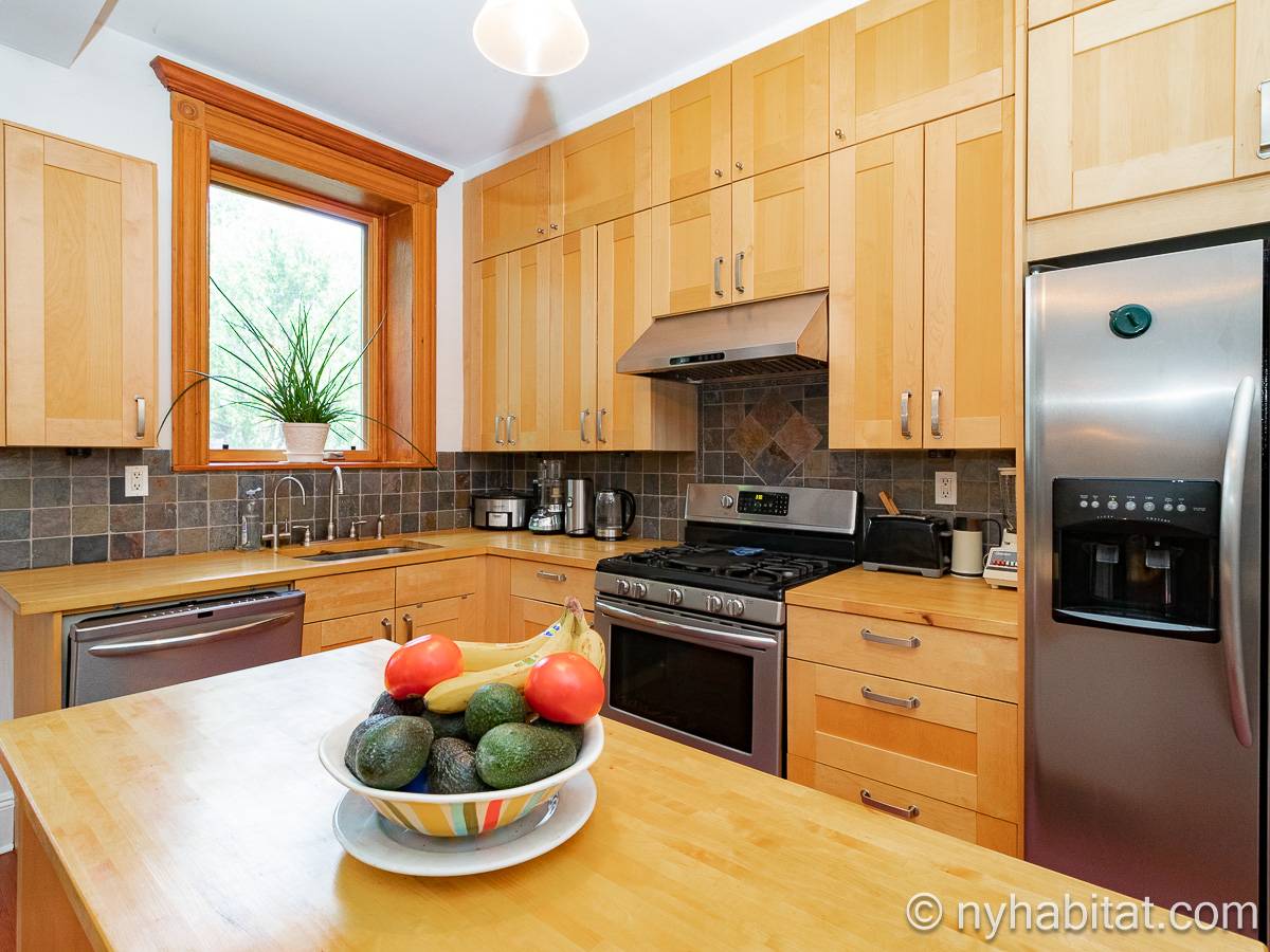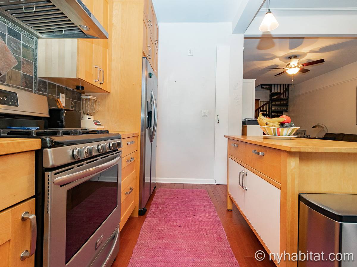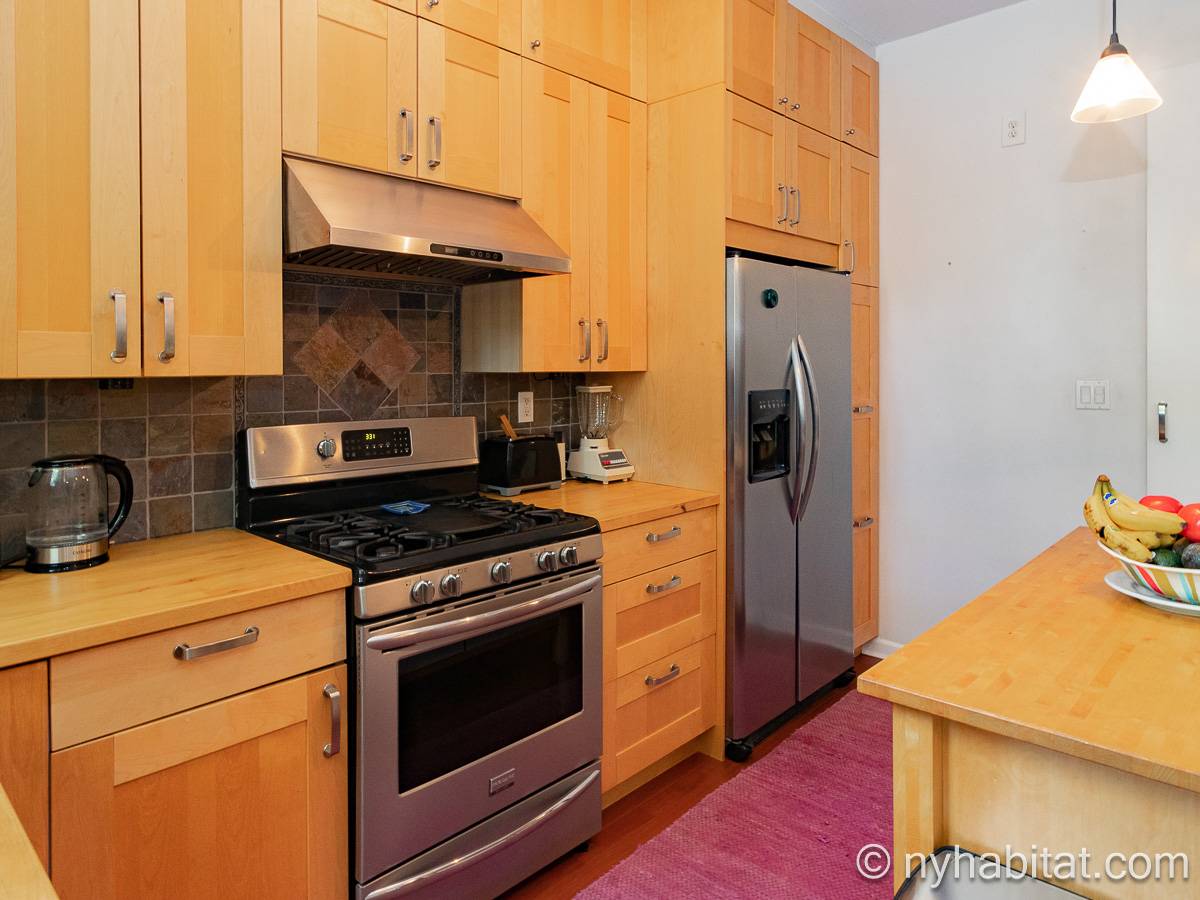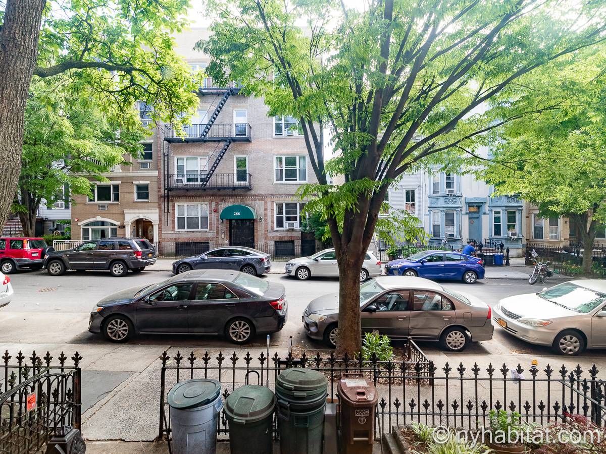 This two-bedroom, one-bathroom furnished apartment is a duplex and is in Park Slope, Brooklyn on the corner of 12th Street and 5th Avenue. This apartment is on the first and second floor (equivalent to the ground floor and first floor in Europe) of a townhouse, which includes a terrace and a garden. Laundry machines are located in the basement of the building.