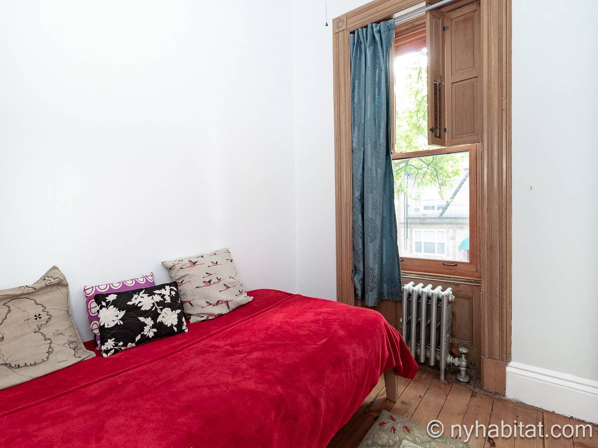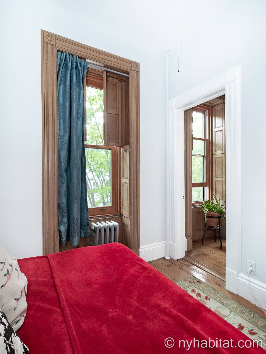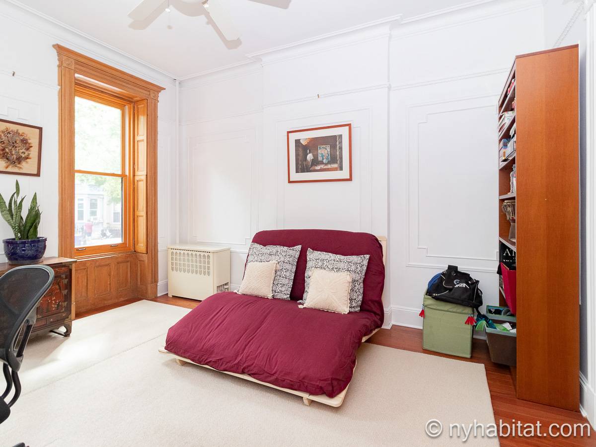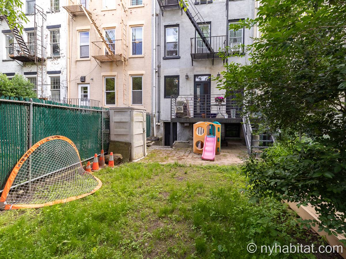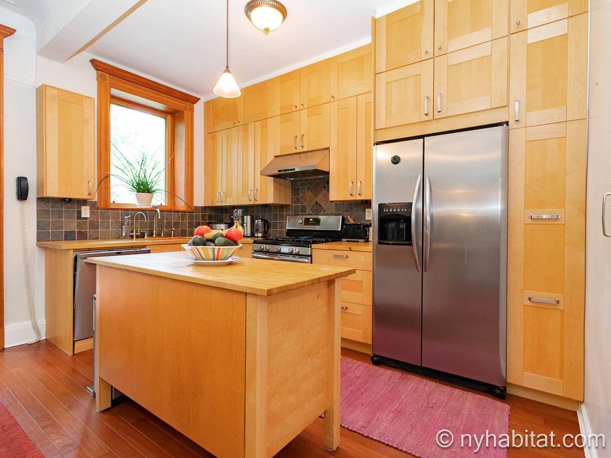 This two-bedroom, one-bathroom furnished apartment is a duplex and is in Park Slope, Brooklyn on the corner of 12th Street and 5th Avenue. This apartment is on the first and second floor (equivalent to the ground floor and first floor in Europe) of a townhouse, which includes a terrace and a garden. Laundry machines are located in the basement of the building.