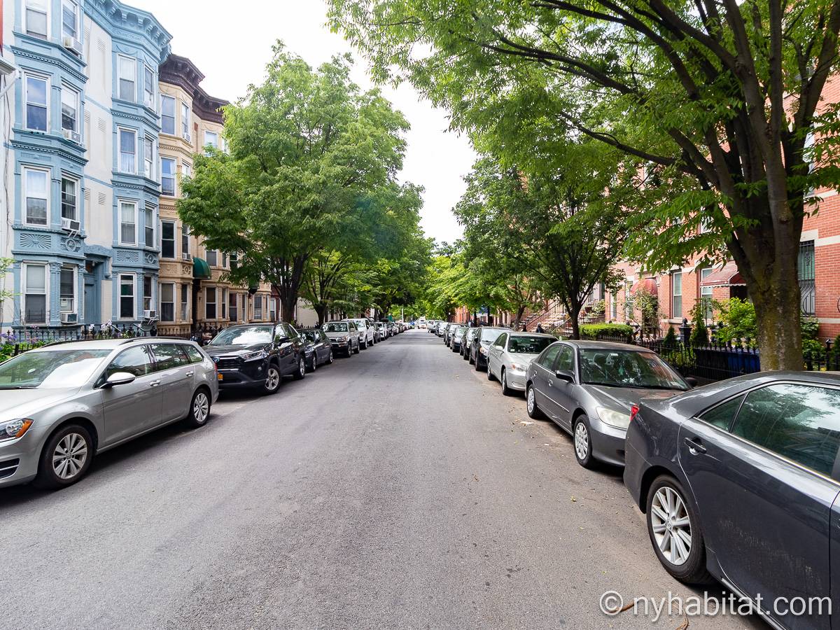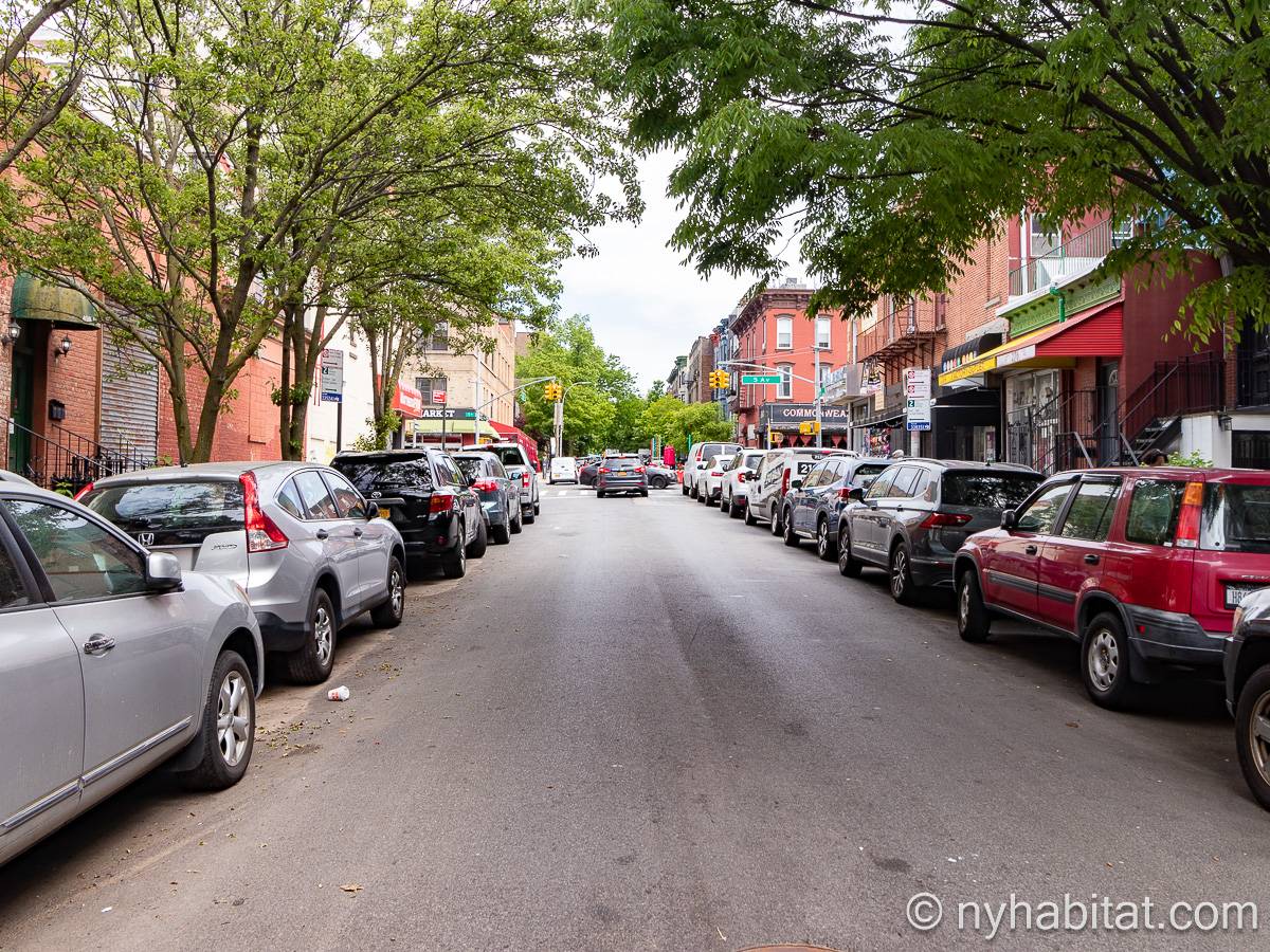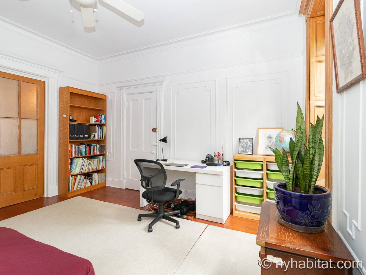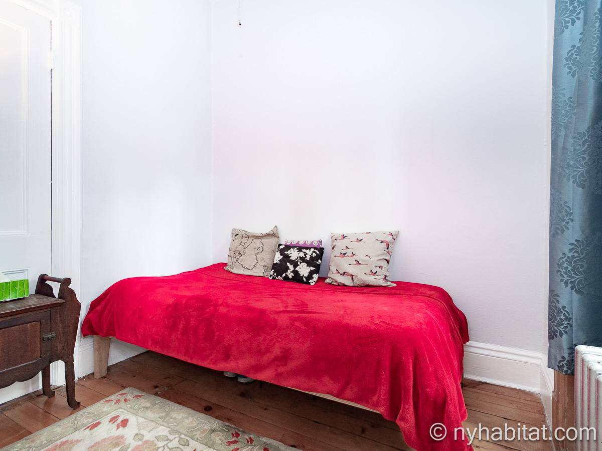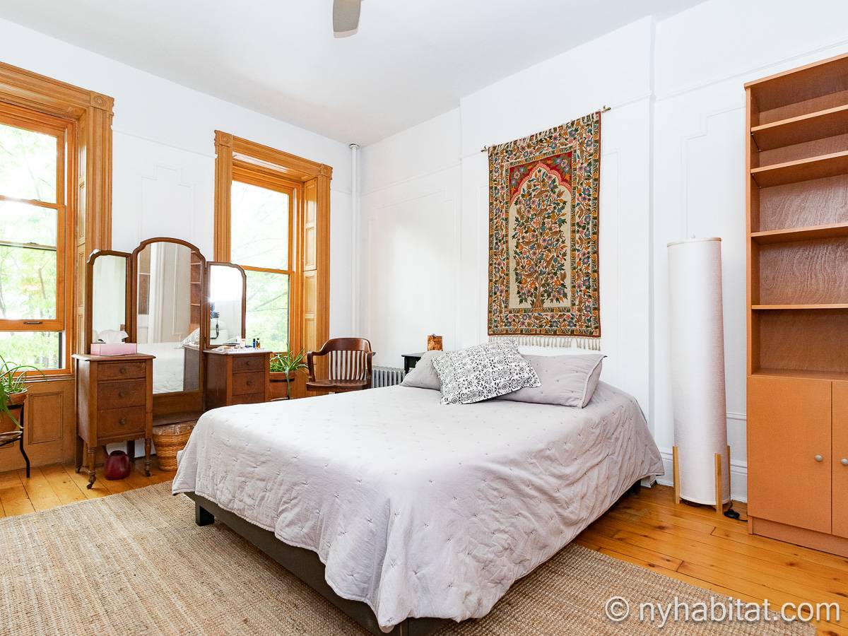 This two-bedroom, one-bathroom furnished apartment is a duplex and is in Park Slope, Brooklyn on the corner of 12th Street and 5th Avenue. This apartment is on the first and second floor (equivalent to the ground floor and first floor in Europe) of a townhouse, which includes a terrace and a garden. Laundry machines are located in the basement of the building.