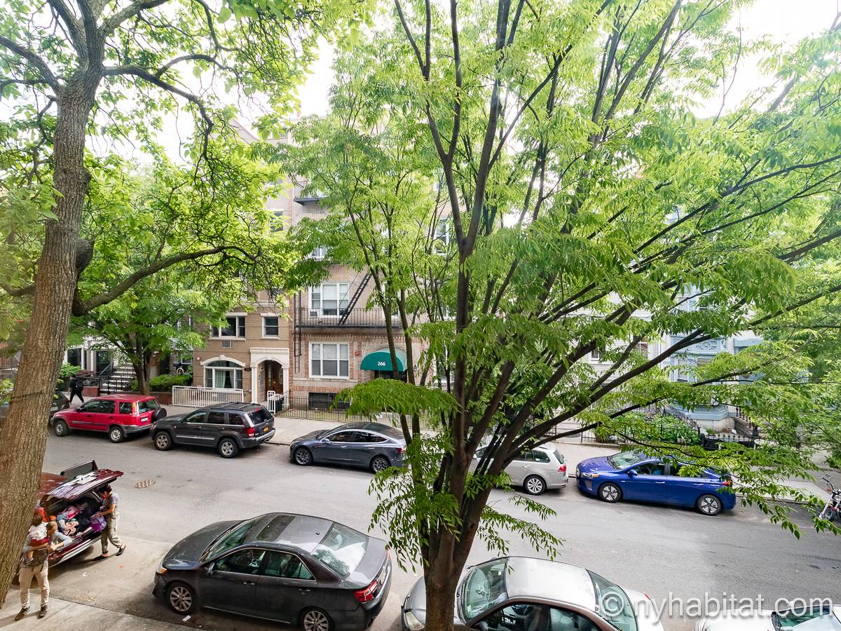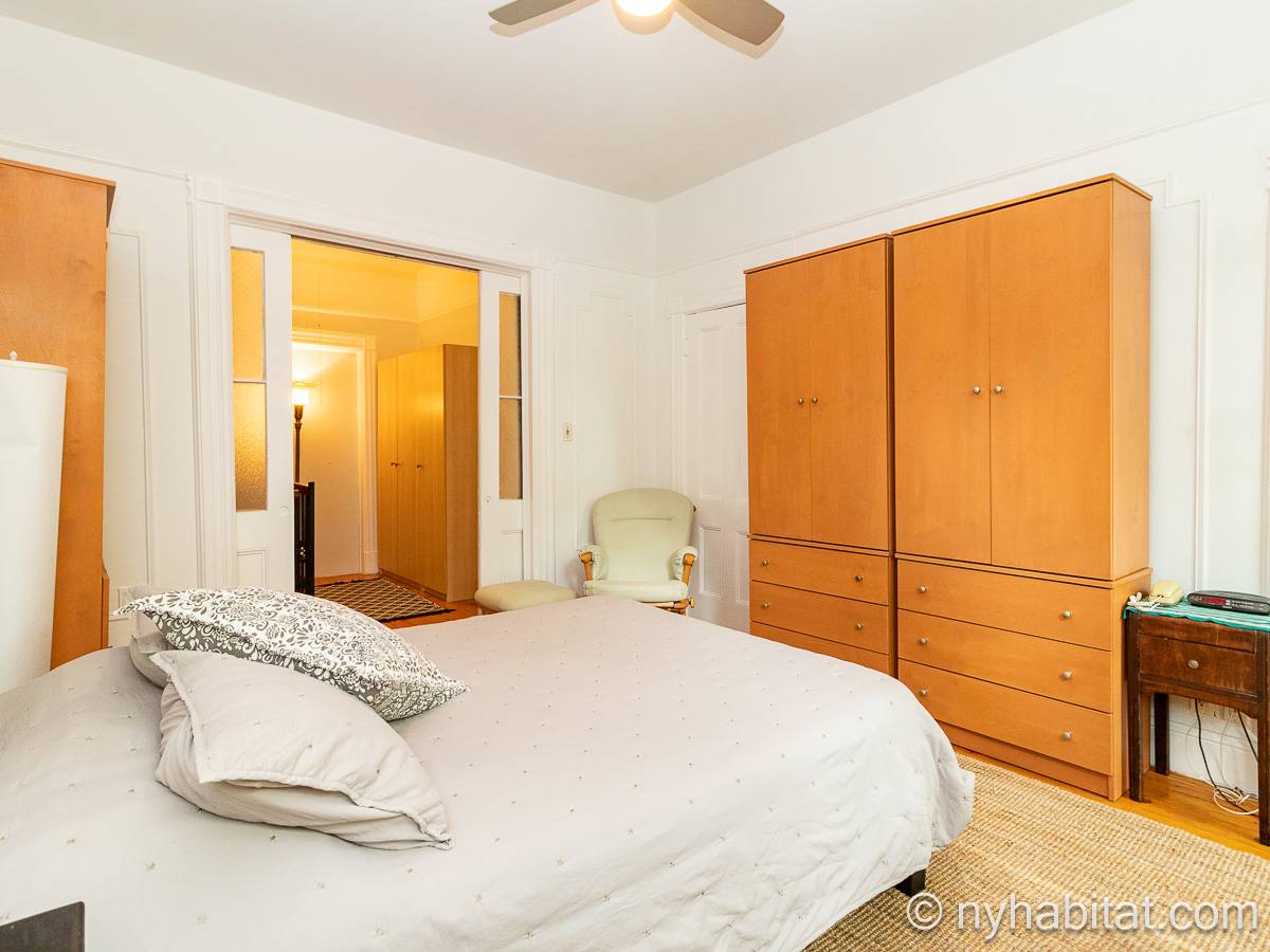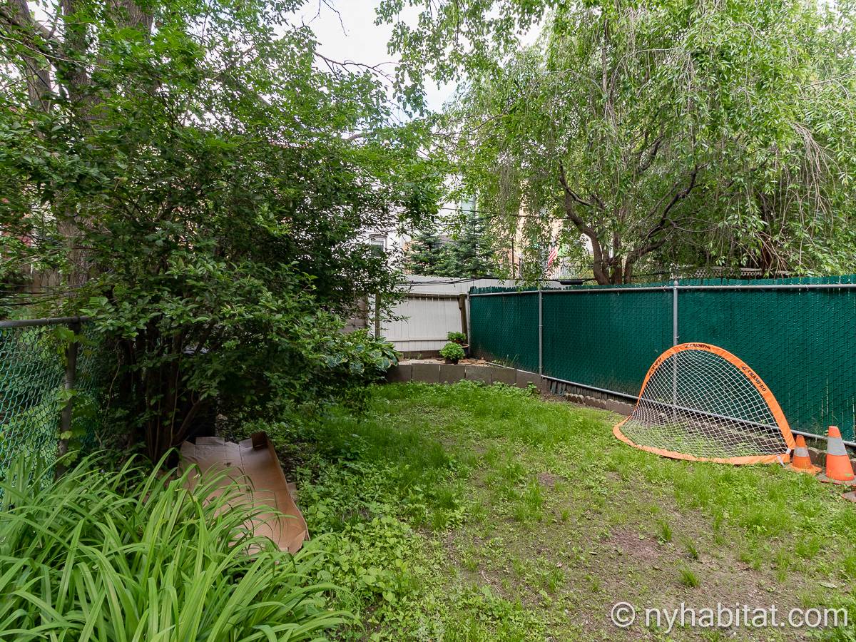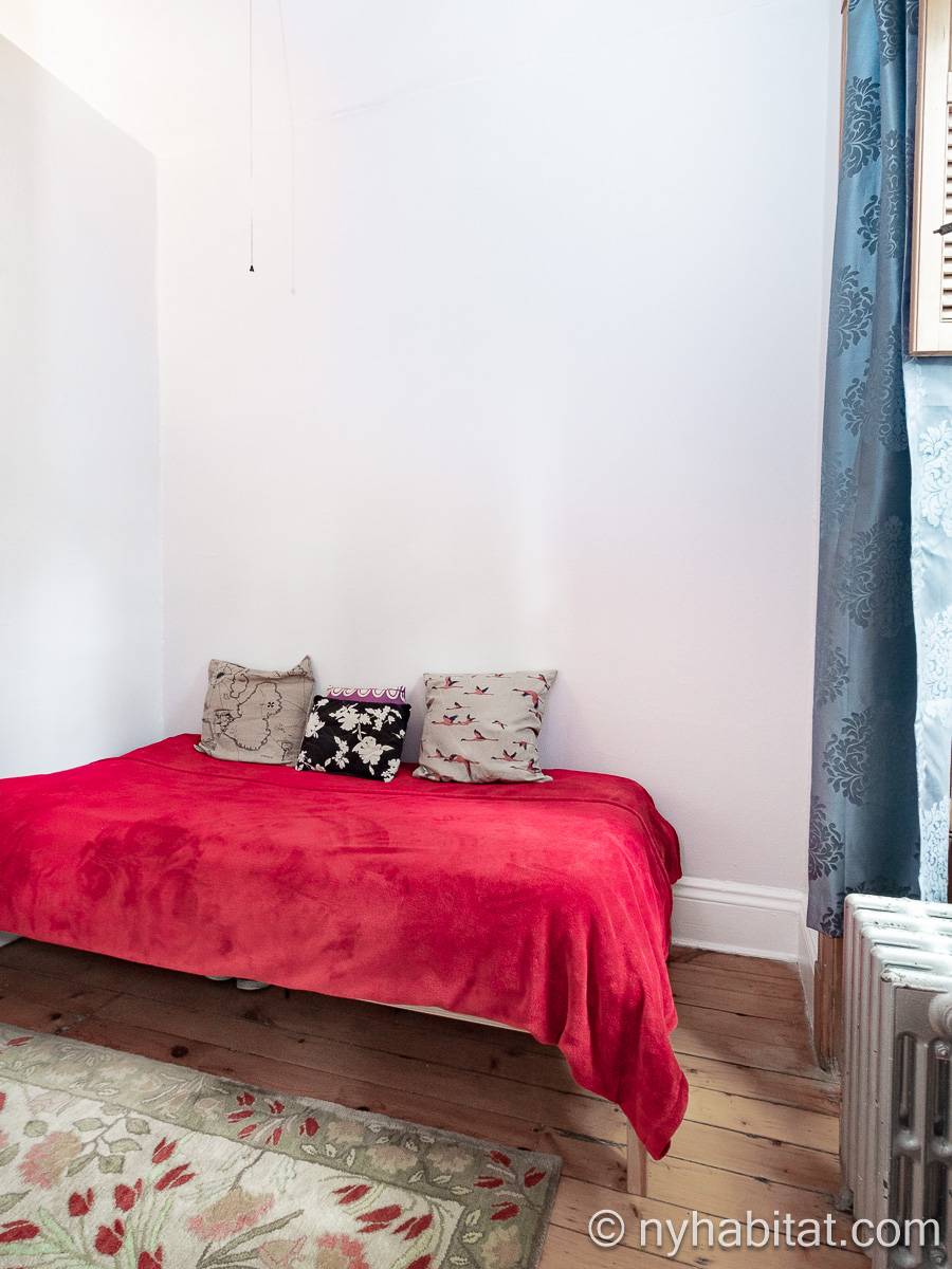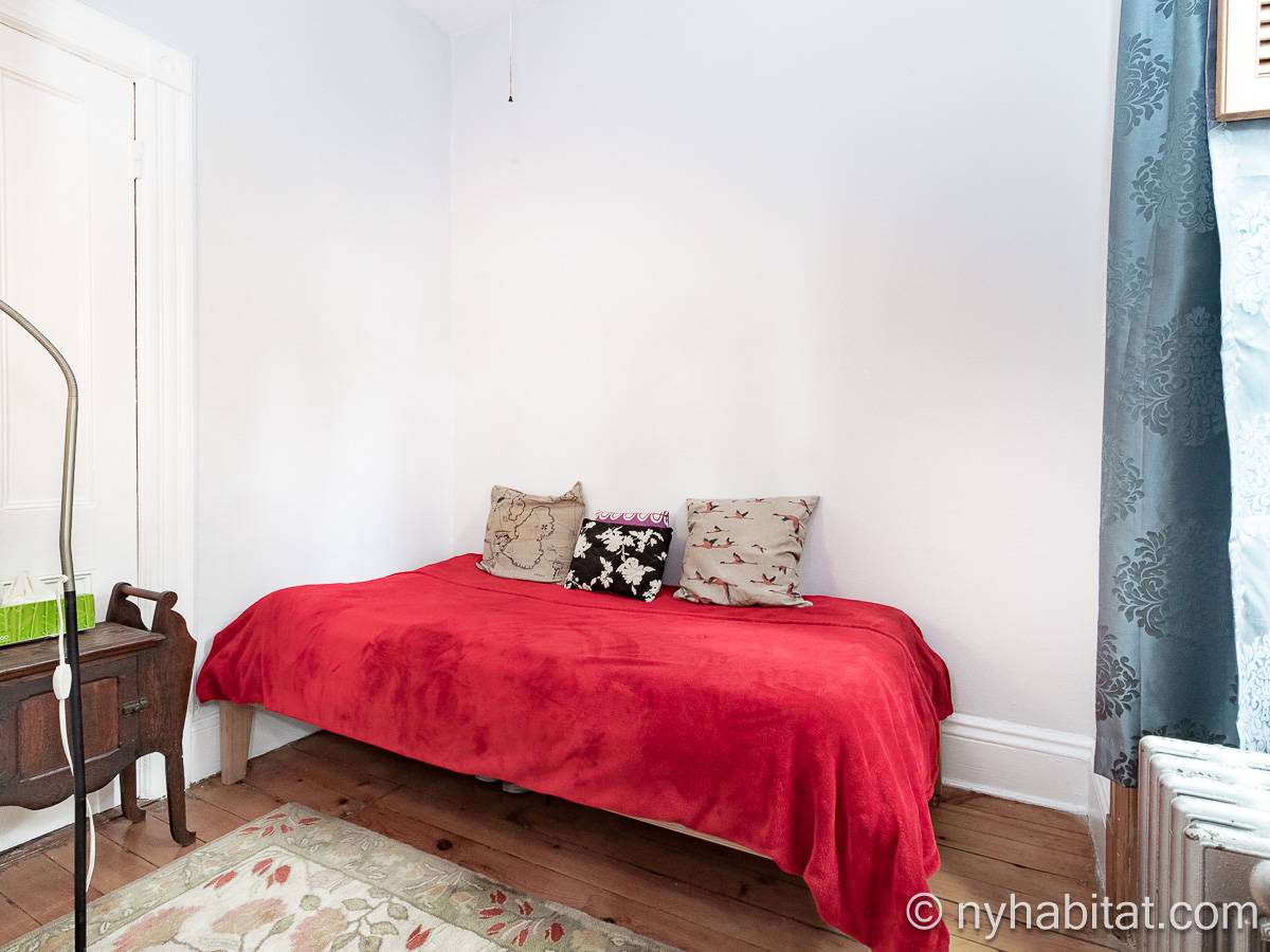 This two-bedroom, one-bathroom furnished apartment is a duplex and is in Park Slope, Brooklyn on the corner of 12th Street and 5th Avenue. This apartment is on the first and second floor (equivalent to the ground floor and first floor in Europe) of a townhouse, which includes a terrace and a garden. Laundry machines are located in the basement of the building.