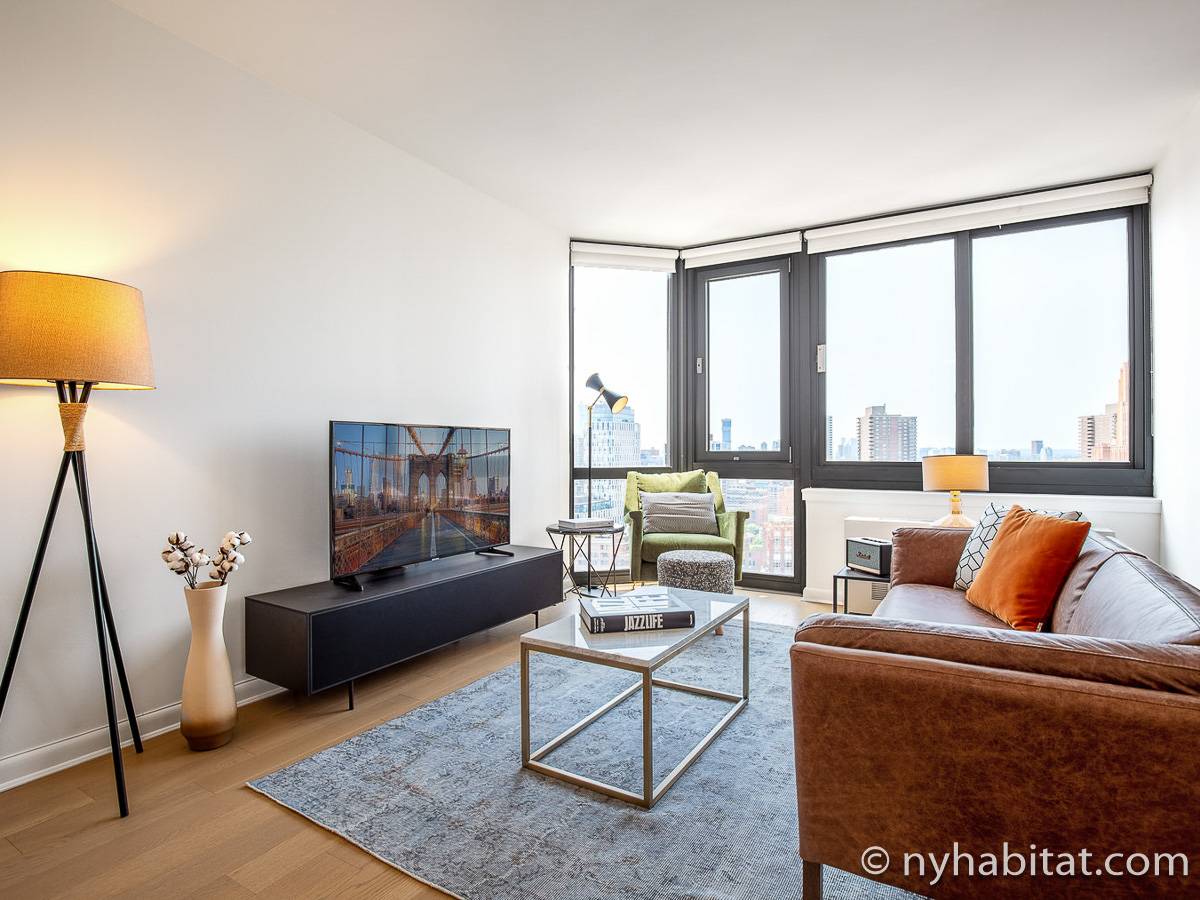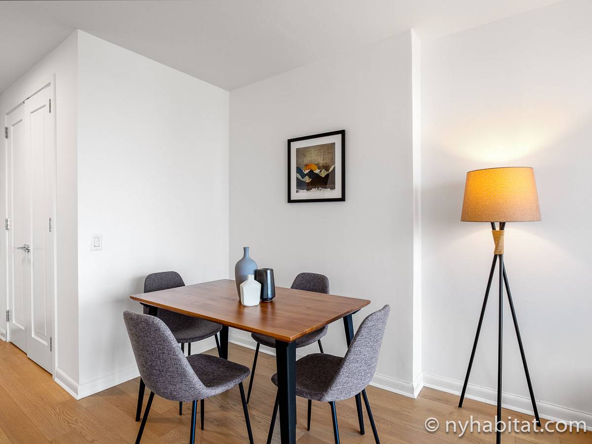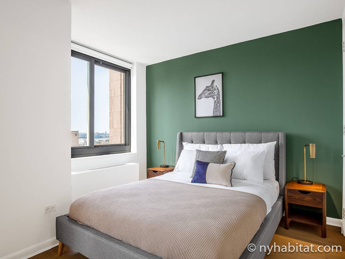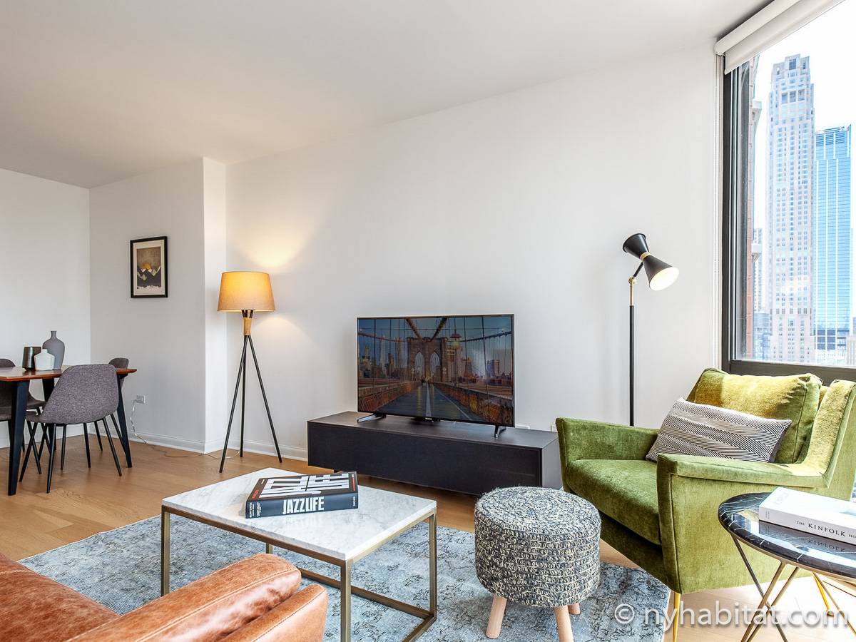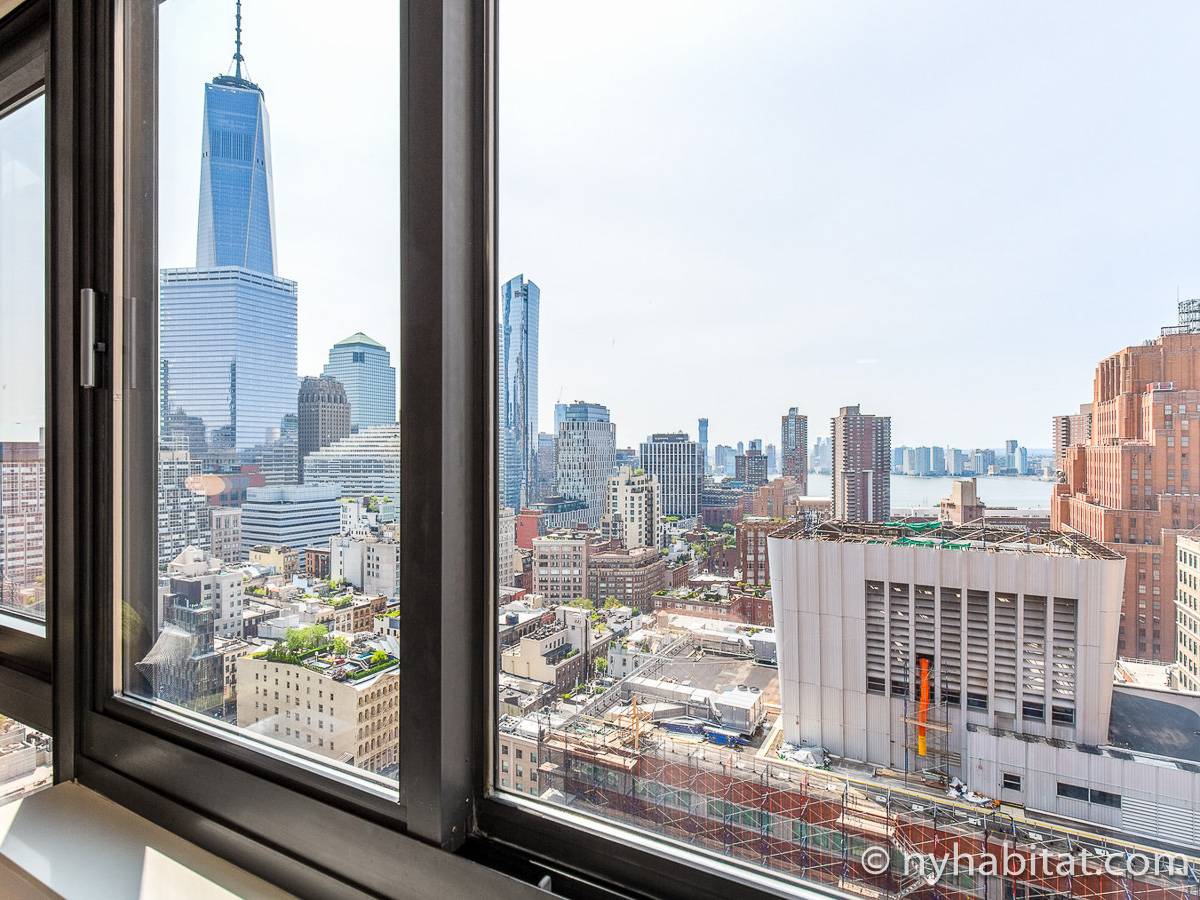This furnished studio apartment is located in Tribeca in Manhattan. Located on Duane Street and Broadway, this rental is on the 28th floor (same as the 27th floor in Europe) of a high-rise building which has a doorman and houses an elevator, a gym, a pool, and laundry facilities.