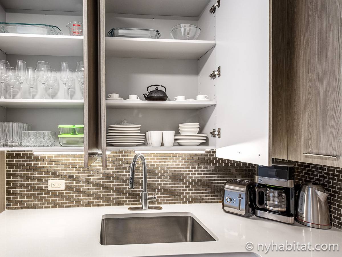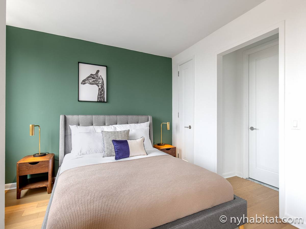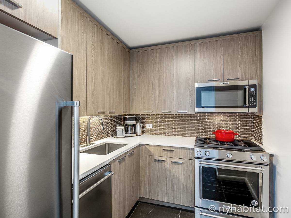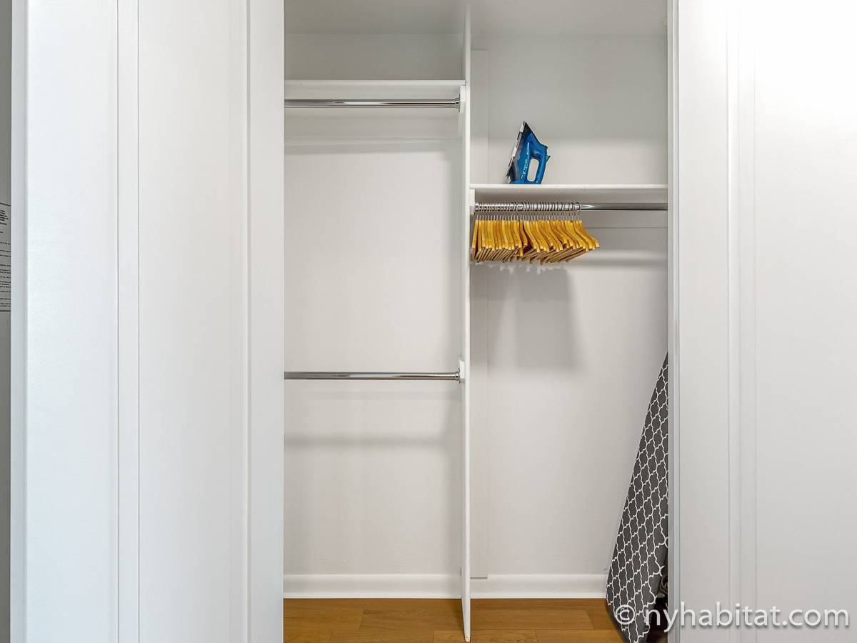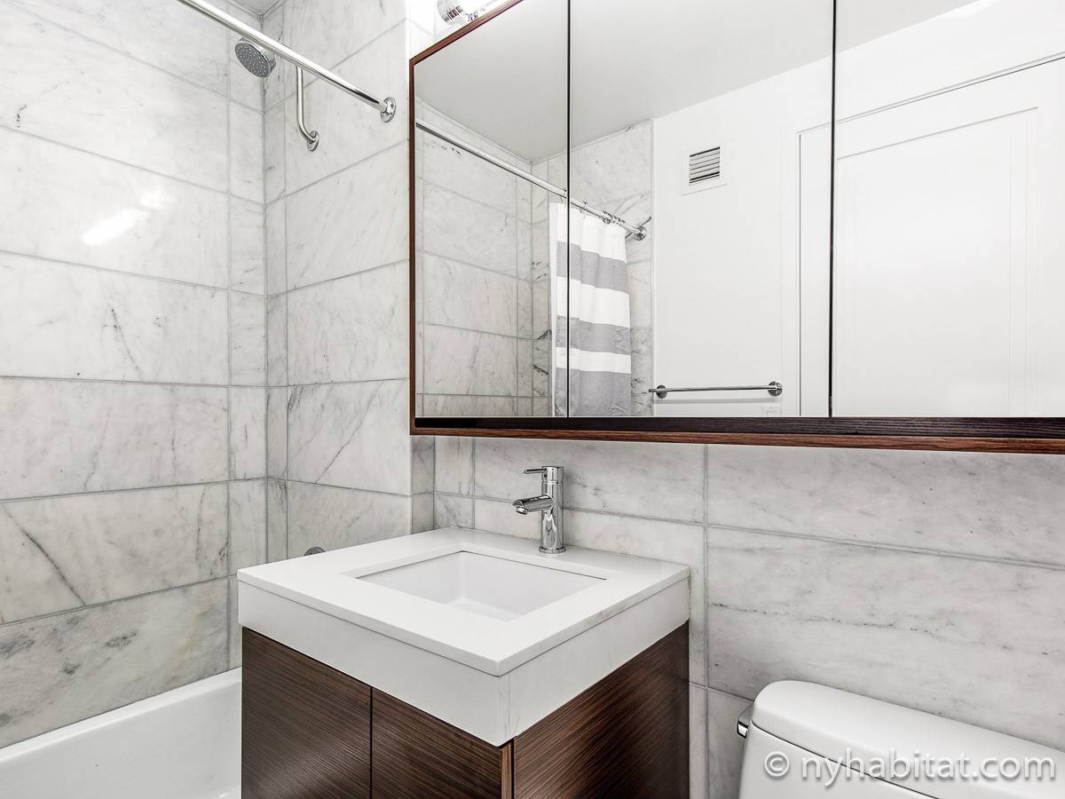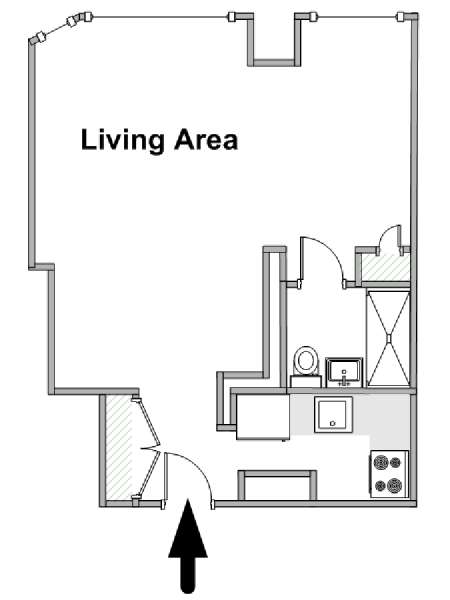 This furnished studio apartment is located in Tribeca in Manhattan. Located on Duane Street and Broadway, this rental is on the 28th floor (same as the 27th floor in Europe) of a high-rise building which has a doorman and houses an elevator, a gym, a pool, and laundry facilities.