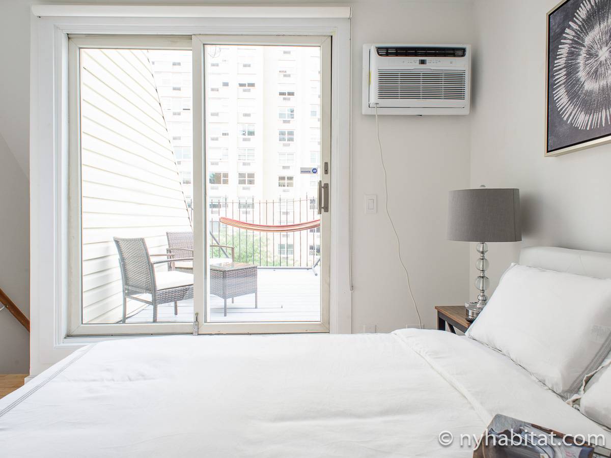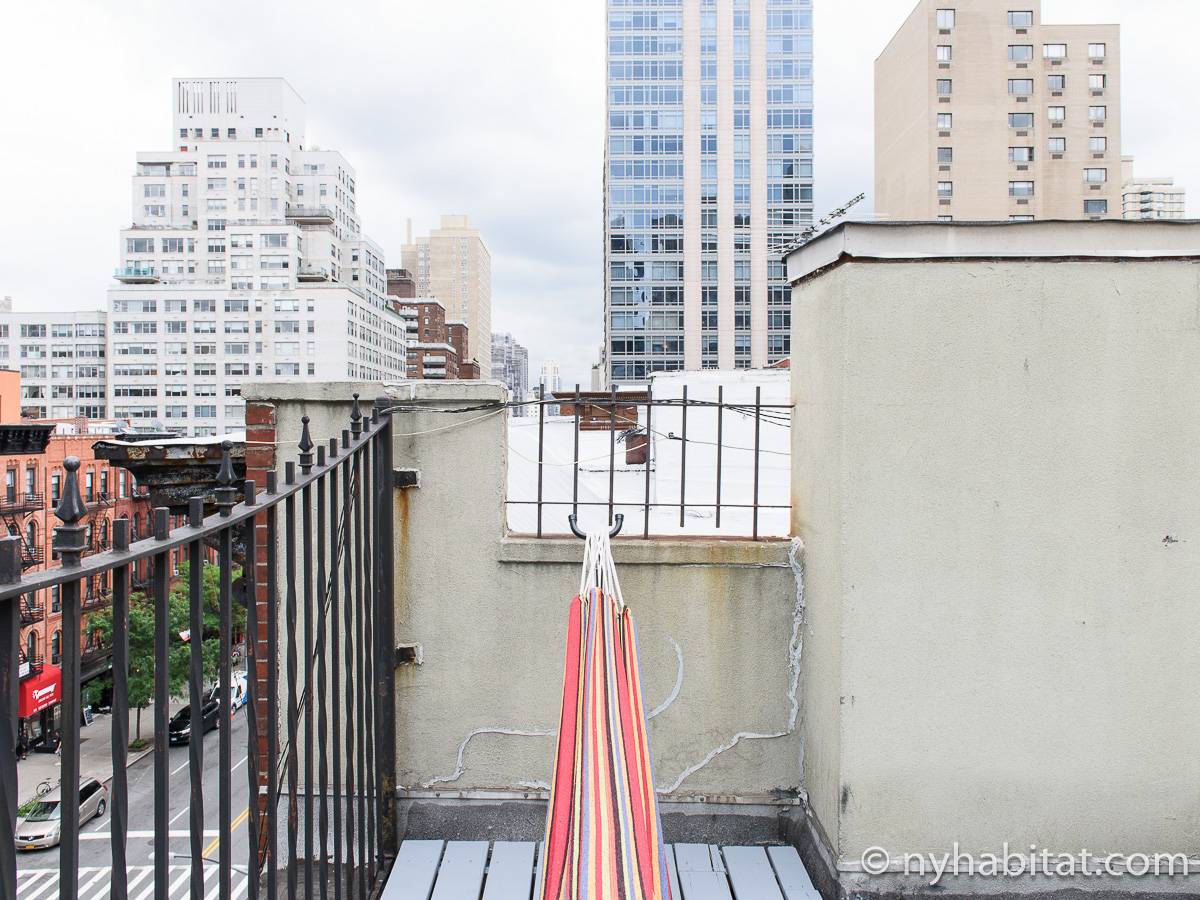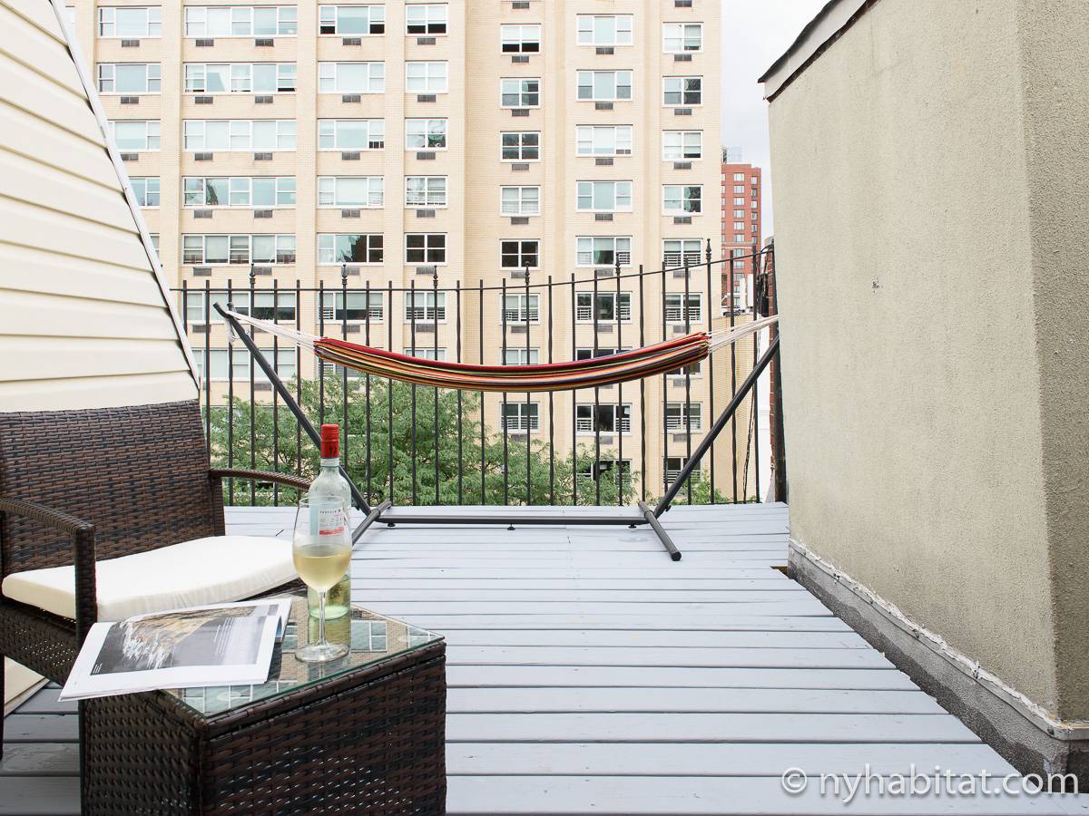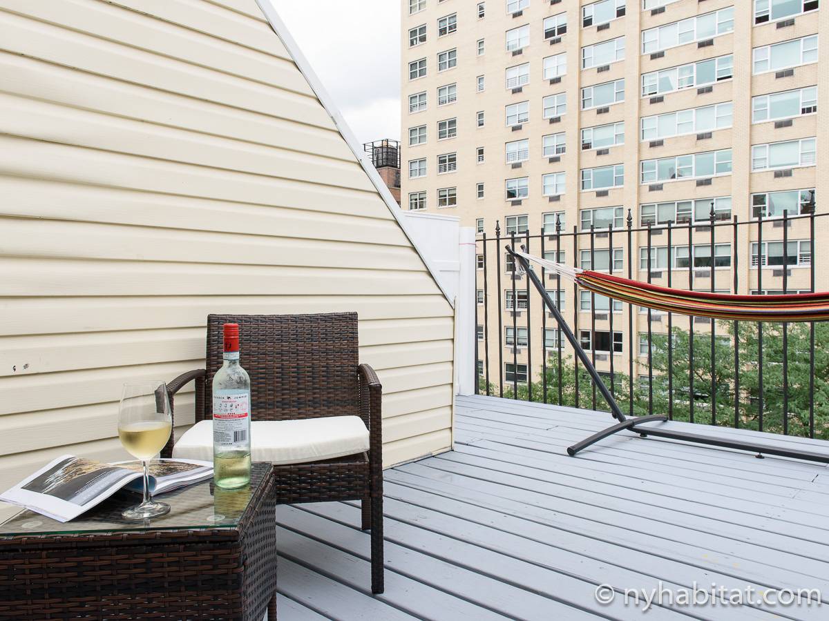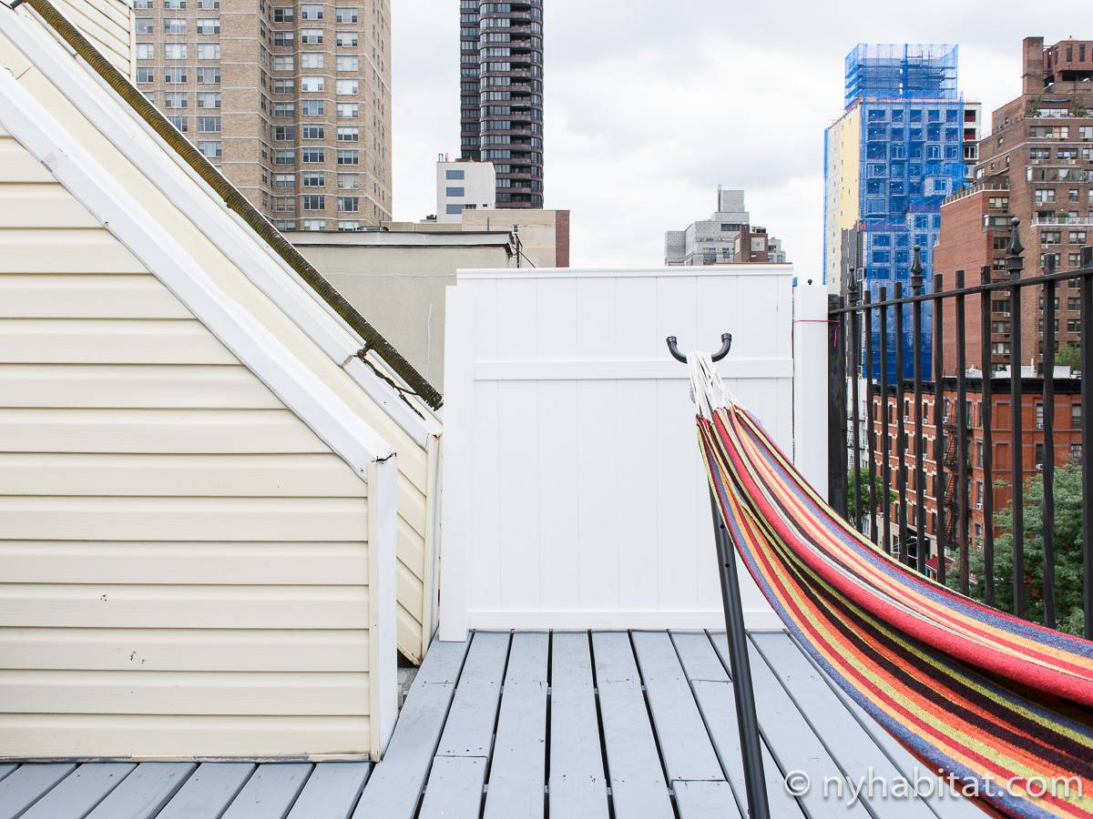 In Upper East Side, Manhattan, is a furnished 1-bedroom, 2-bathroom duplex apartment for rent. Located near the corner of East 84th Street and York Avenue, this penthouse apartment is in a no-elevator building. Amenities of this rental include a private terrace as well as an in-unit washing machine and dryer.