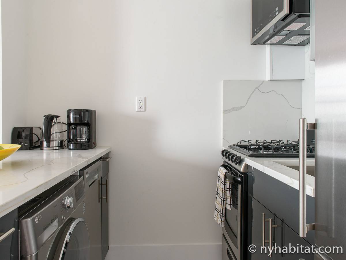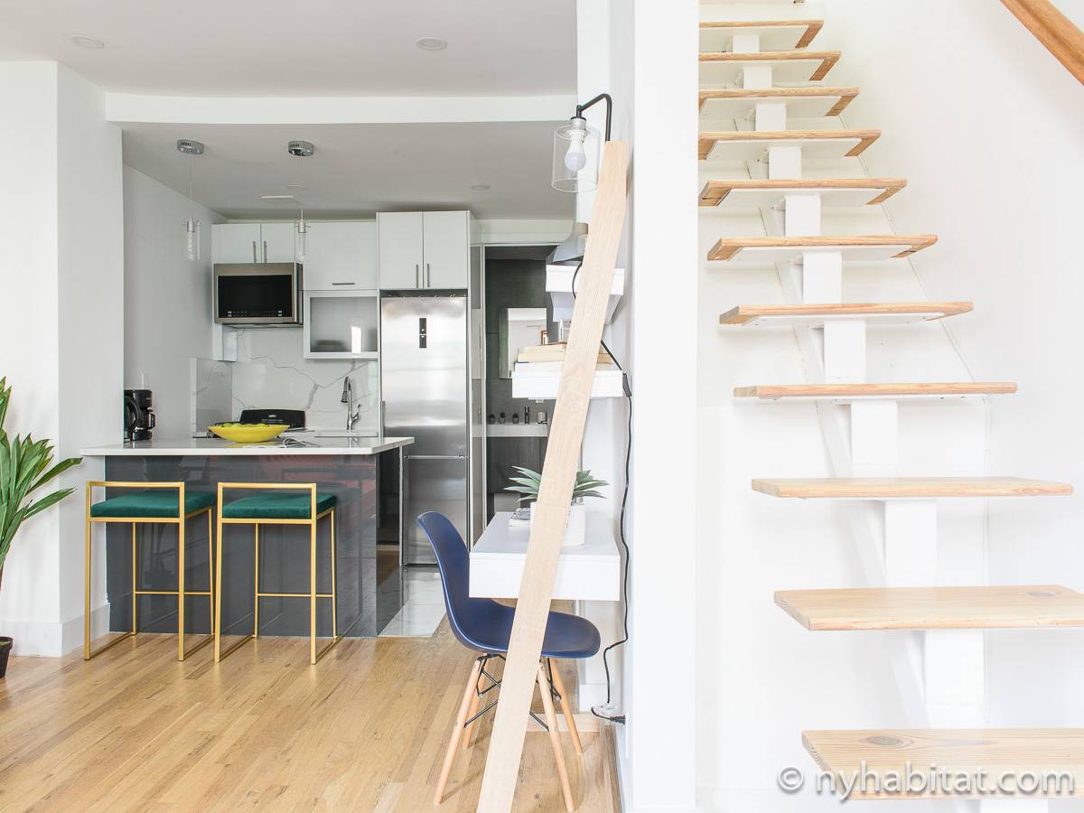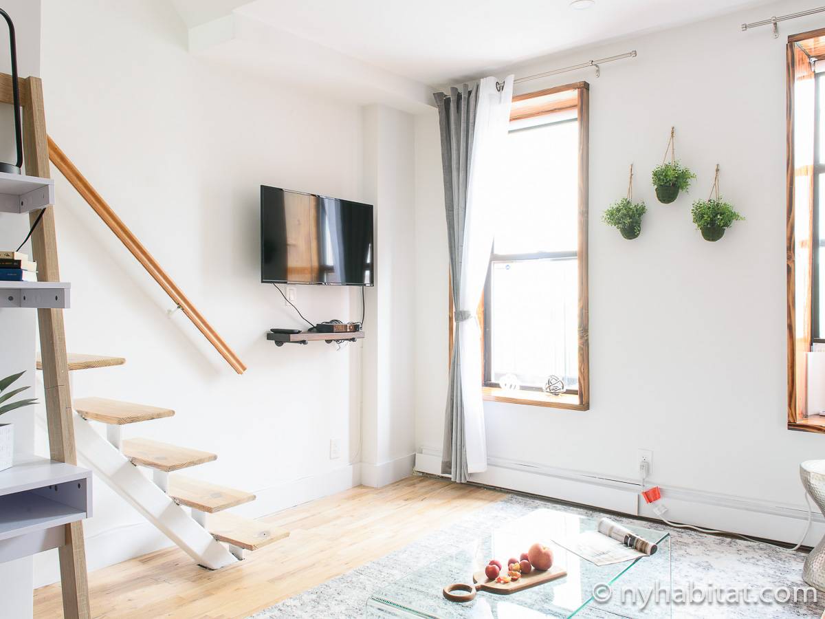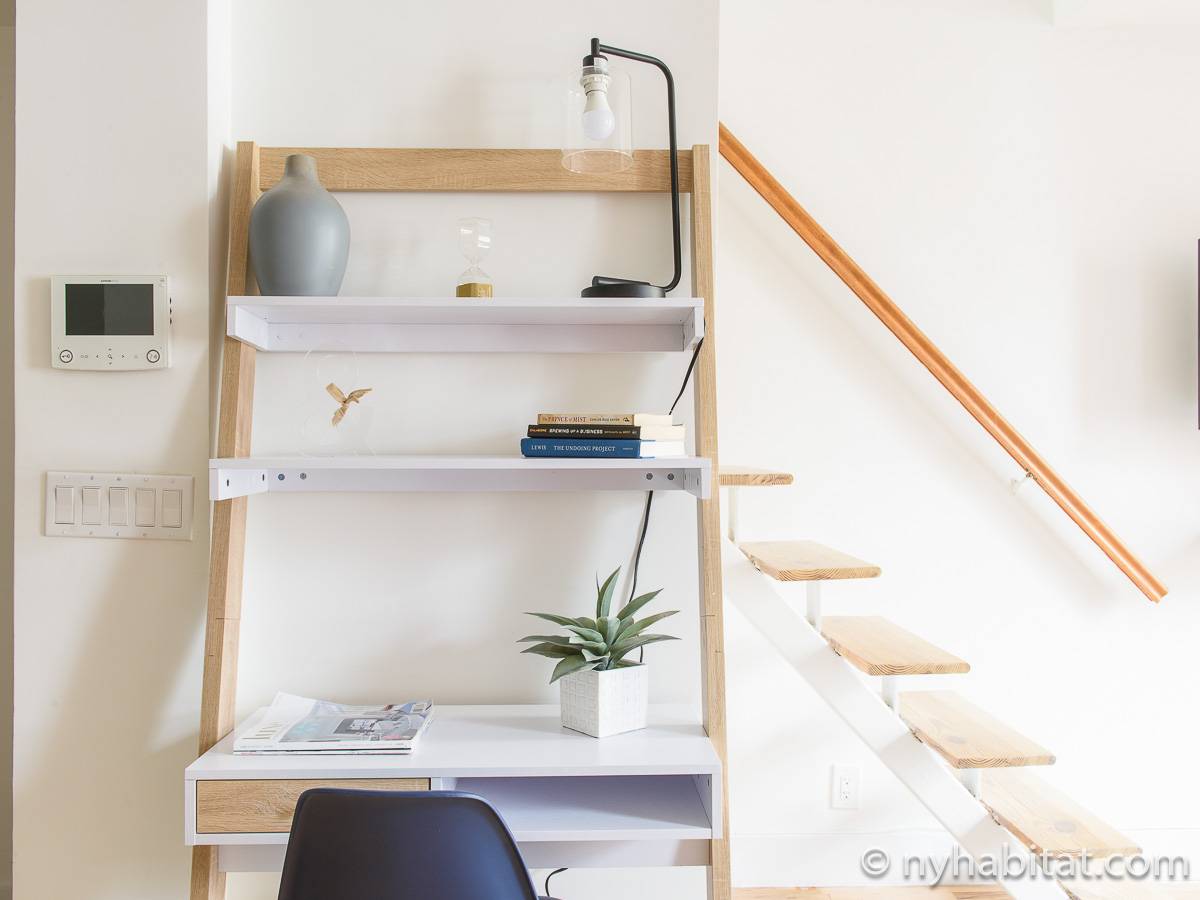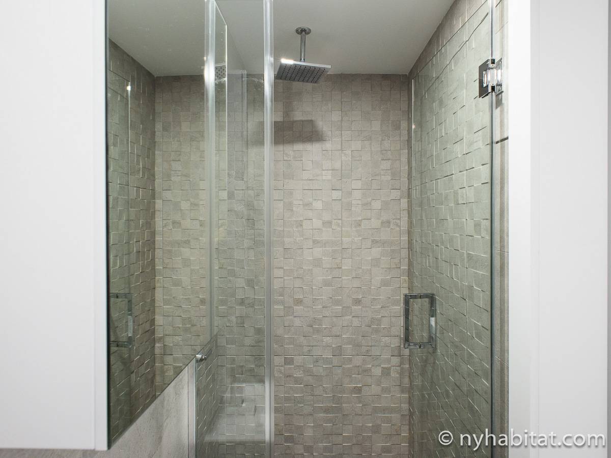 In Upper East Side, Manhattan, is a furnished 1-bedroom, 2-bathroom duplex apartment for rent. Located near the corner of East 84th Street and York Avenue, this penthouse apartment is in a no-elevator building. Amenities of this rental include a private terrace as well as an in-unit washing machine and dryer.