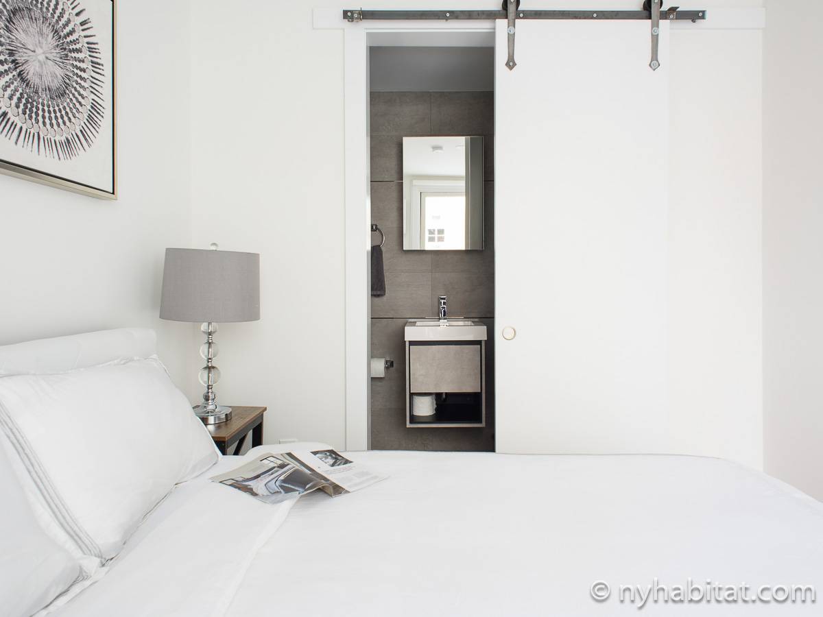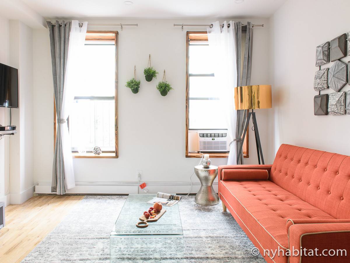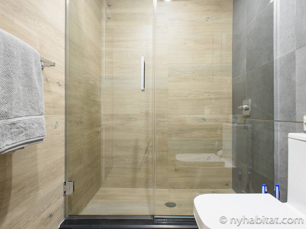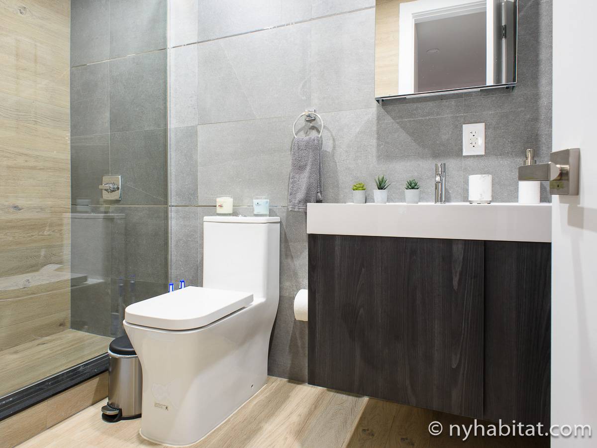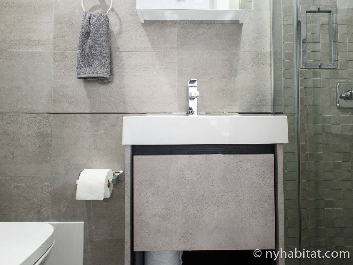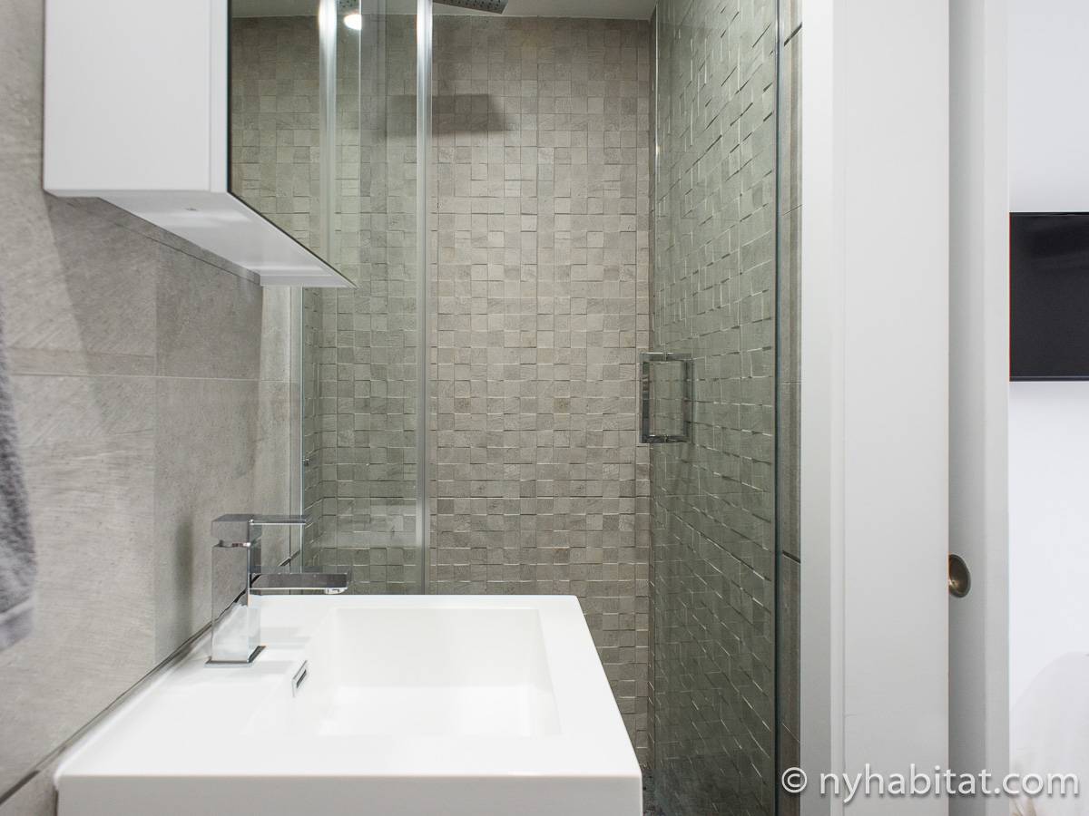In Upper East Side, Manhattan, is a furnished 1-bedroom, 2-bathroom duplex apartment for rent. Located near the corner of East 84th Street and York Avenue, this penthouse apartment is in a no-elevator building. Amenities of this rental include a private terrace as well as an in-unit washing machine and dryer.