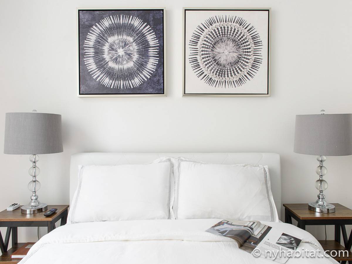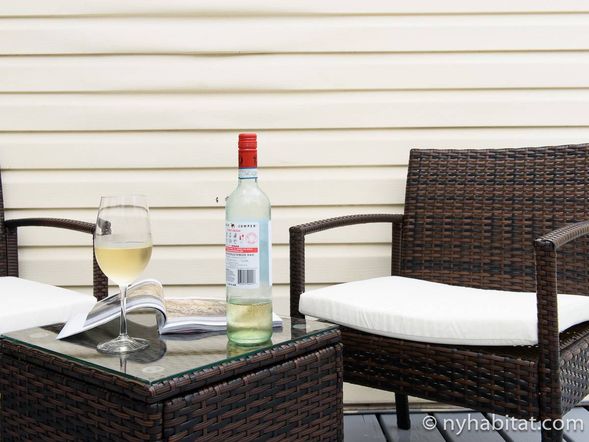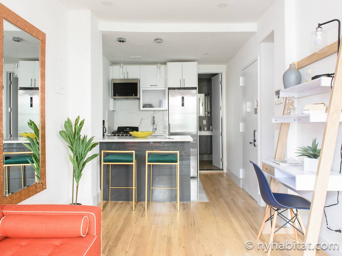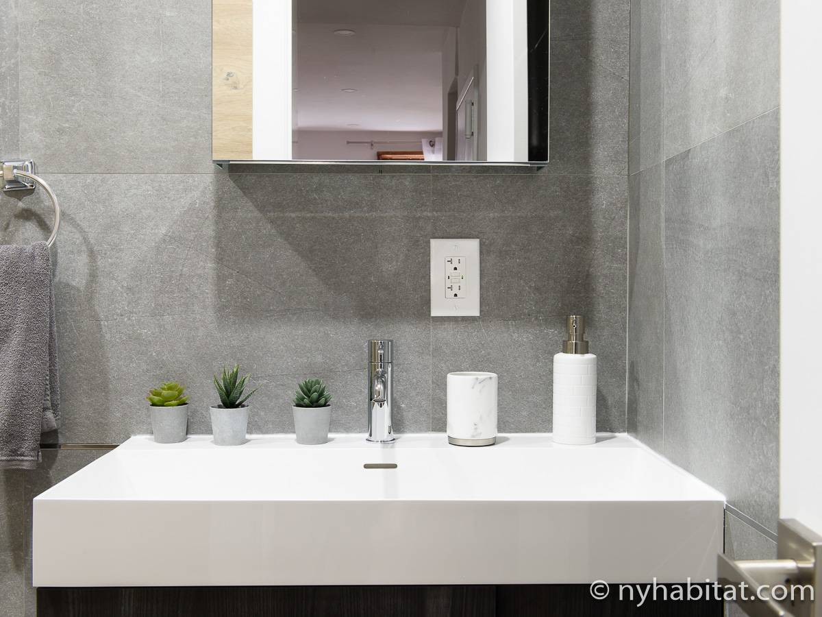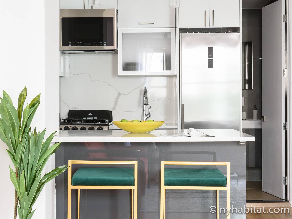 In Upper East Side, Manhattan, is a furnished 1-bedroom, 2-bathroom duplex apartment for rent. Located near the corner of East 84th Street and York Avenue, this penthouse apartment is in a no-elevator building. Amenities of this rental include a private terrace as well as an in-unit washing machine and dryer.