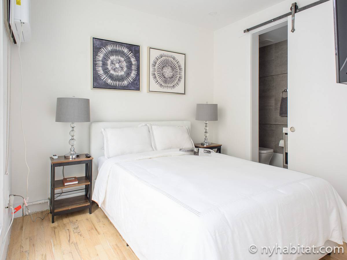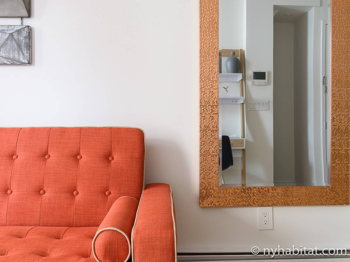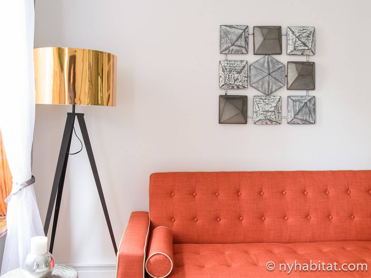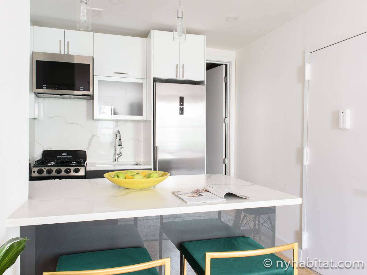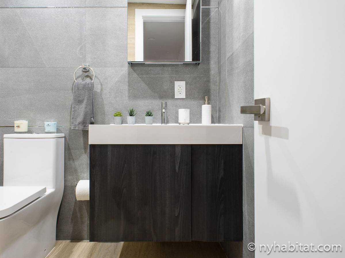 In Upper East Side, Manhattan, is a furnished 1-bedroom, 2-bathroom duplex apartment for rent. Located near the corner of East 84th Street and York Avenue, this penthouse apartment is in a no-elevator building. Amenities of this rental include a private terrace as well as an in-unit washing machine and dryer.