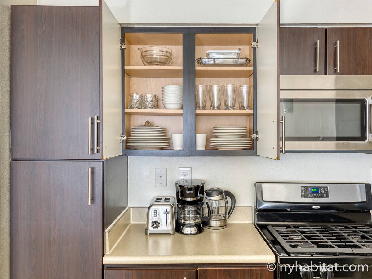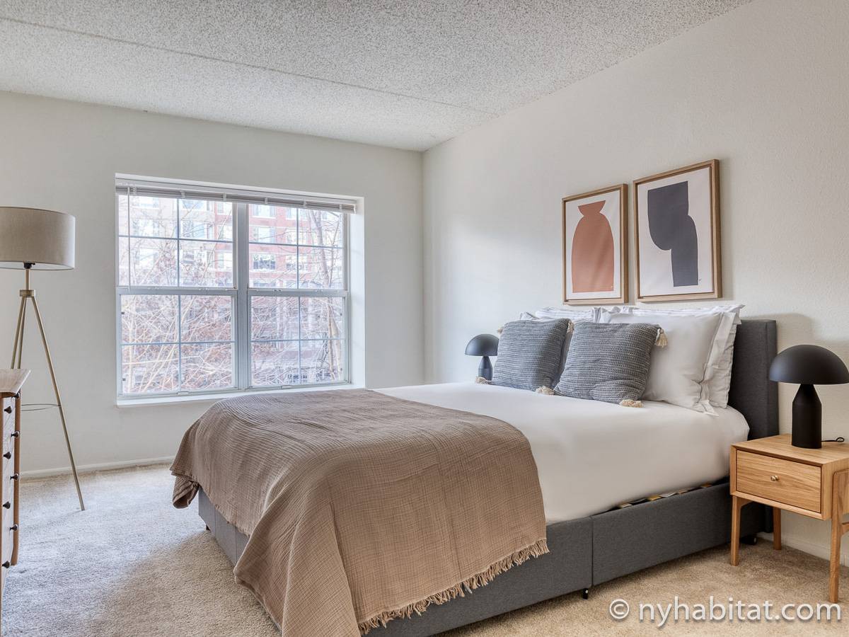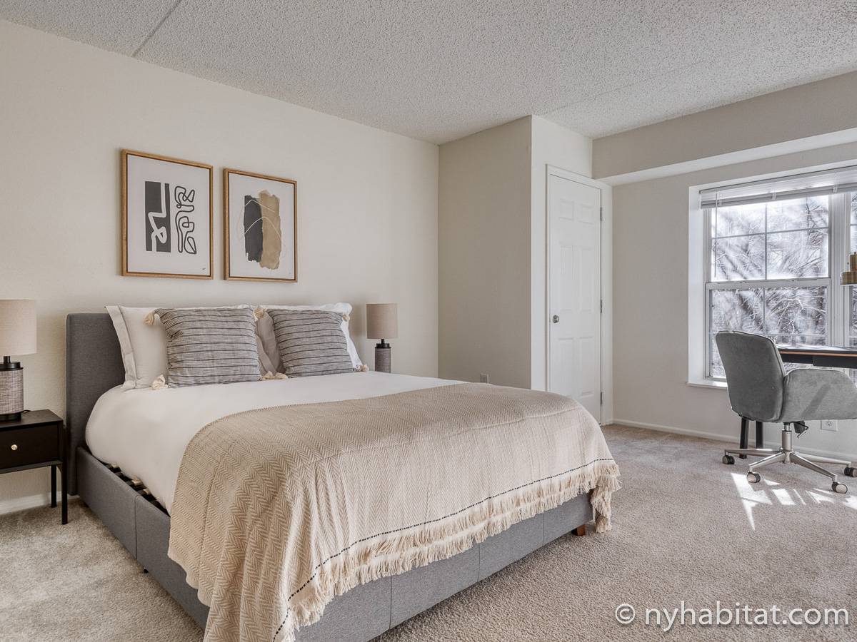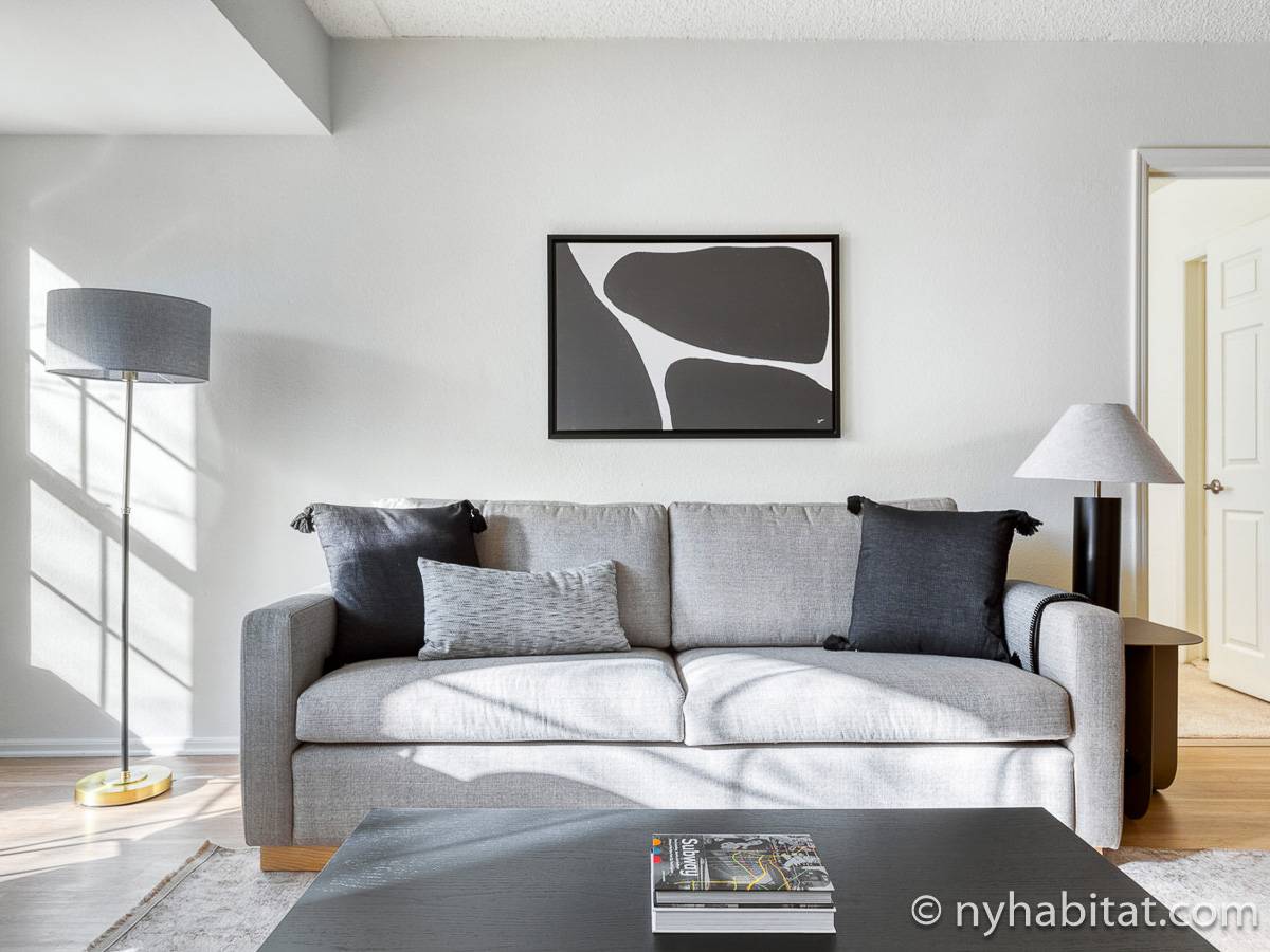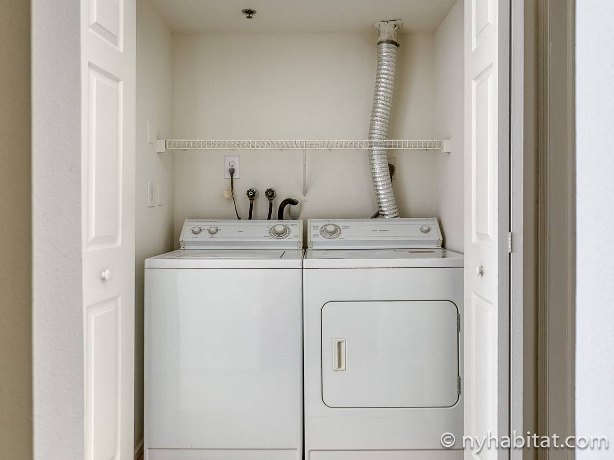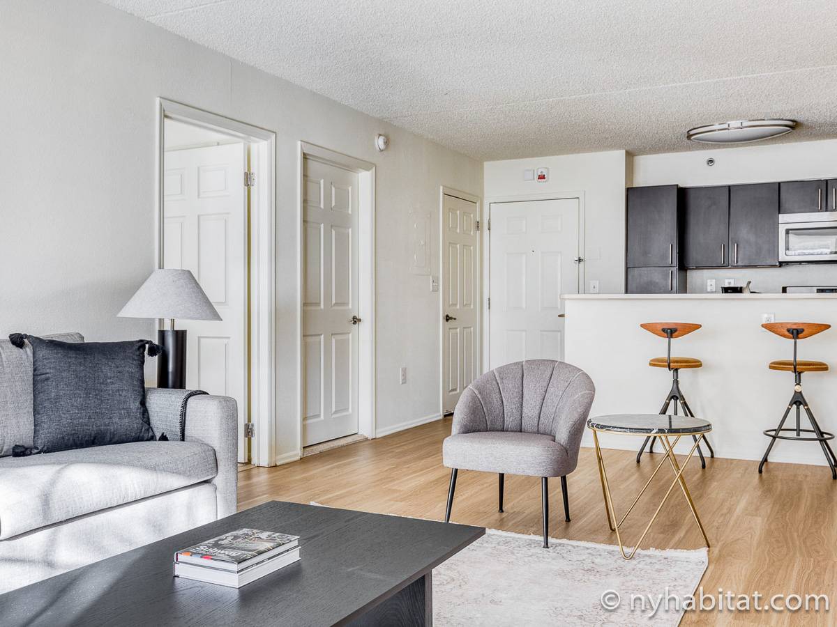 This fully furnished two-bedroom, two-bathroom apartment is located in Jersey City, New Jersey on the corner of Washington Boulevard and 2nd Street. The unit is 1142 square feet (around 106 m2) and is on the fourth floor (equivalent to the third floor in Europe) of a high-rise building. The serviced apartment has an elevator, gym, pool, and security system.