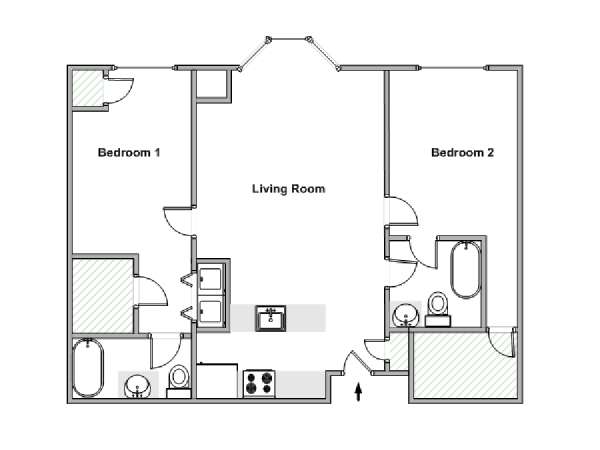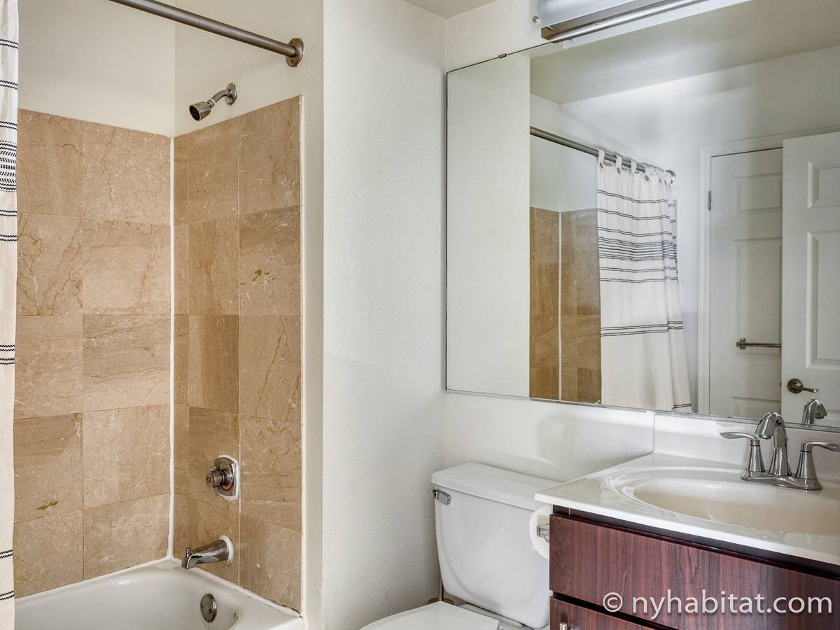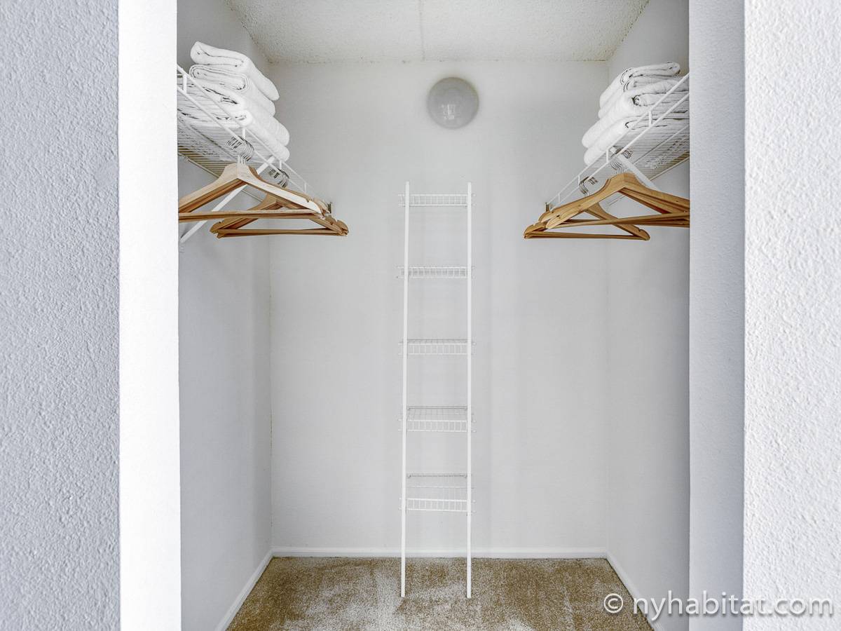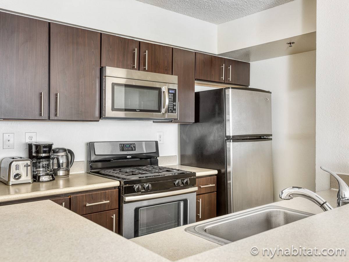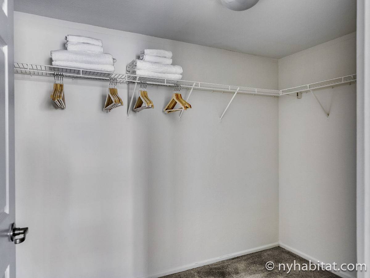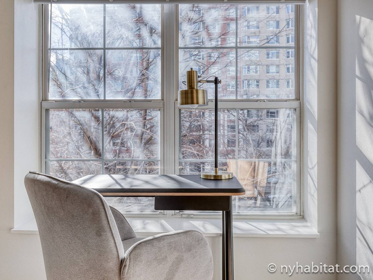 This fully furnished two-bedroom, two-bathroom apartment is located in Jersey City, New Jersey on the corner of Washington Boulevard and 2nd Street. The unit is 1142 square feet (around 106 m2) and is on the fourth floor (equivalent to the third floor in Europe) of a high-rise building. The serviced apartment has an elevator, gym, pool, and security system.