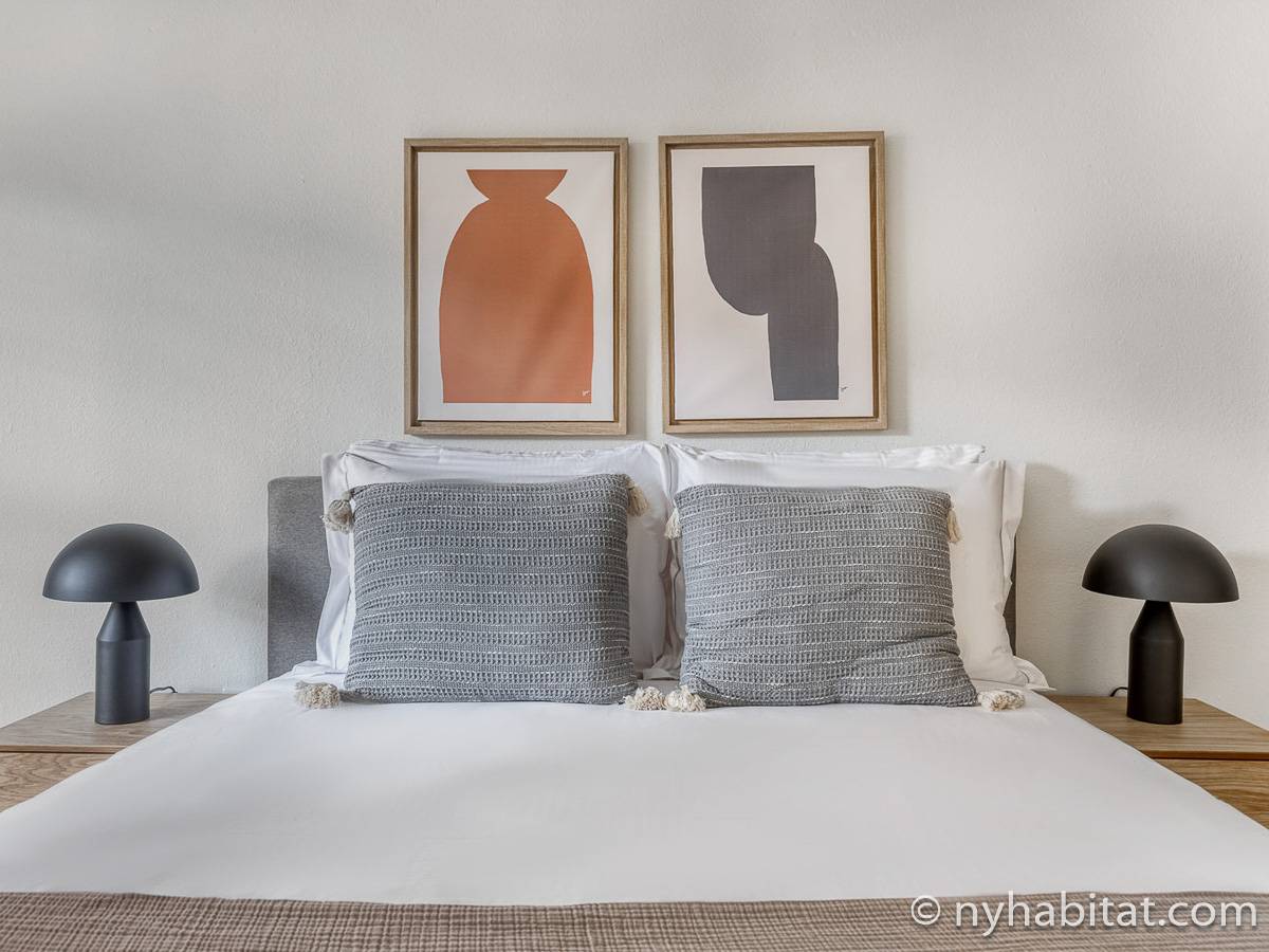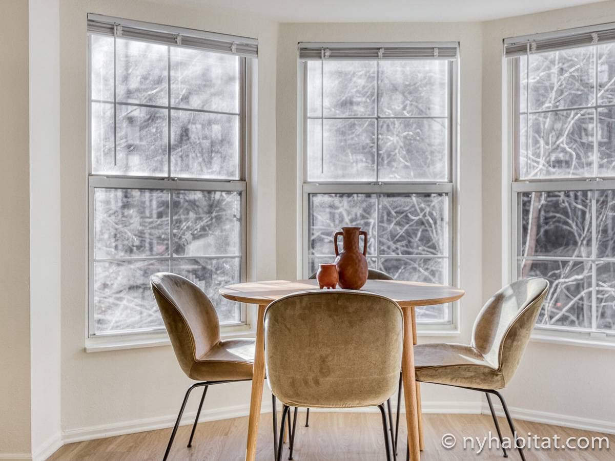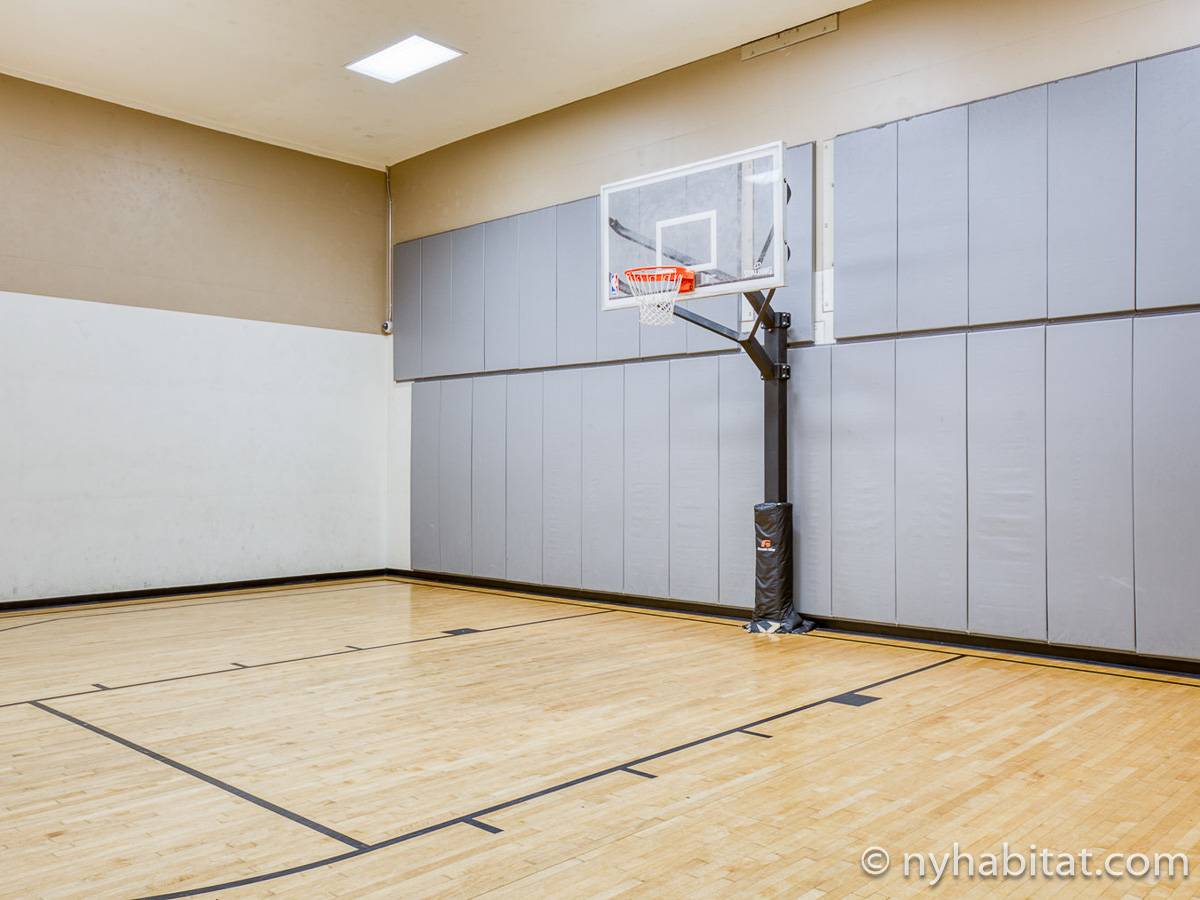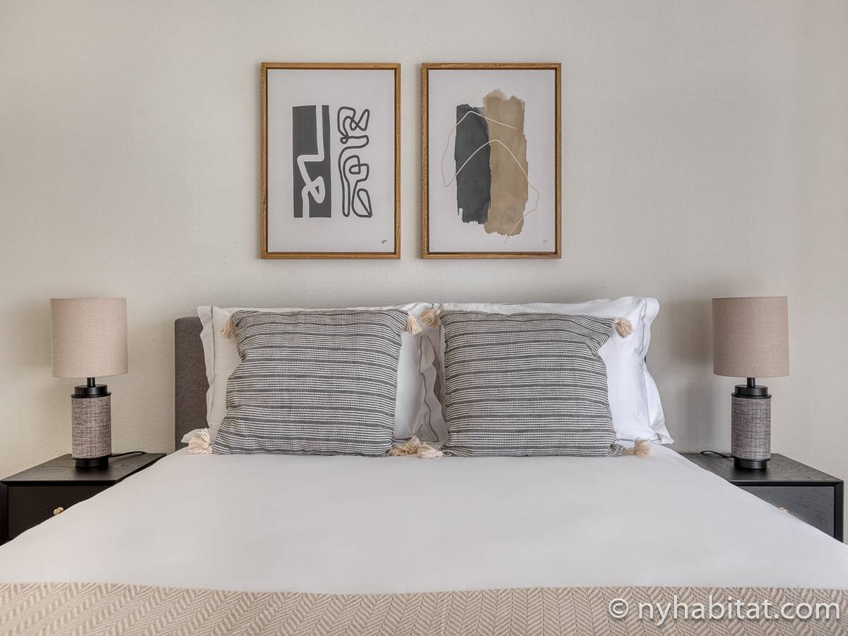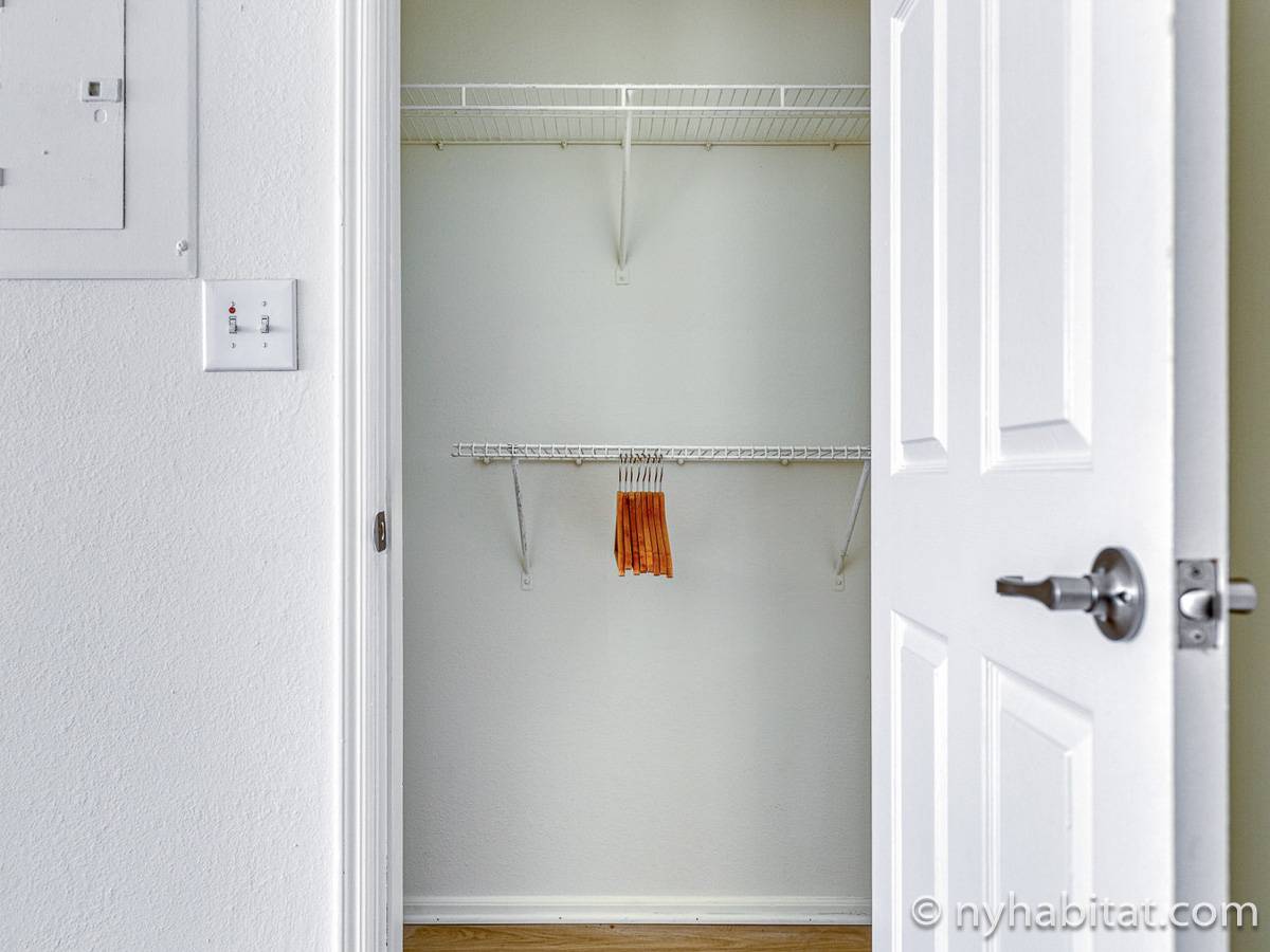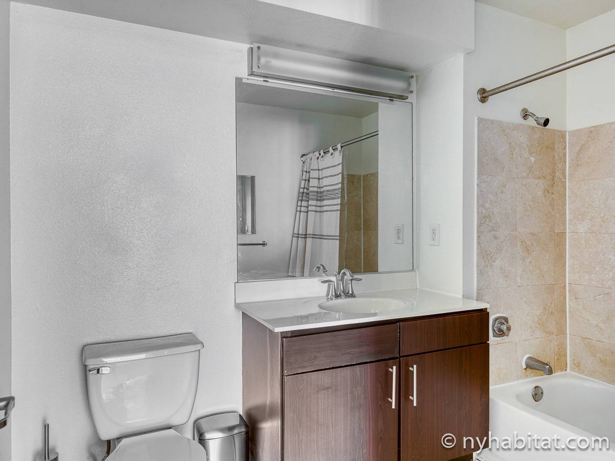 This fully furnished two-bedroom, two-bathroom apartment is located in Jersey City, New Jersey on the corner of Washington Boulevard and 2nd Street. The unit is 1142 square feet (around 106 m2) and is on the fourth floor (equivalent to the third floor in Europe) of a high-rise building. The serviced apartment has an elevator, gym, pool, and security system.
