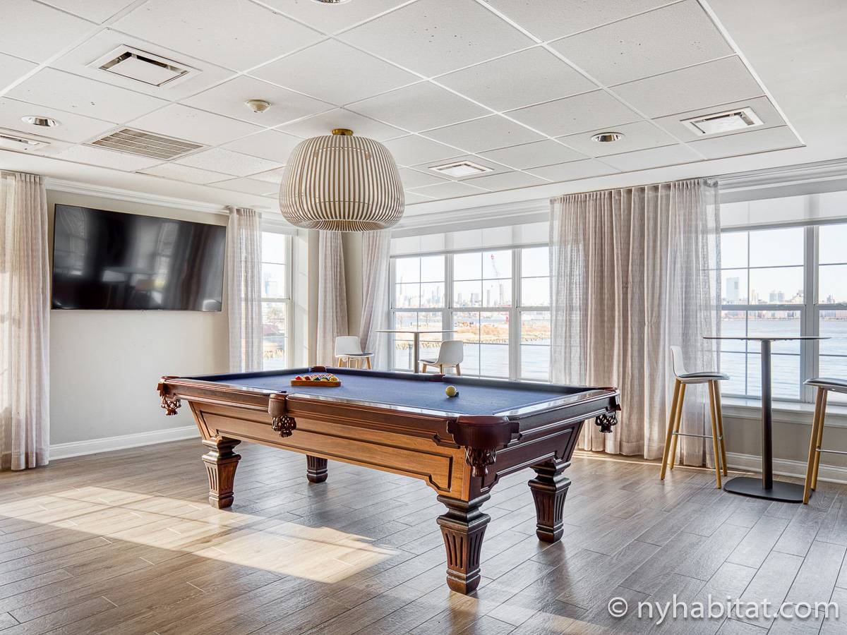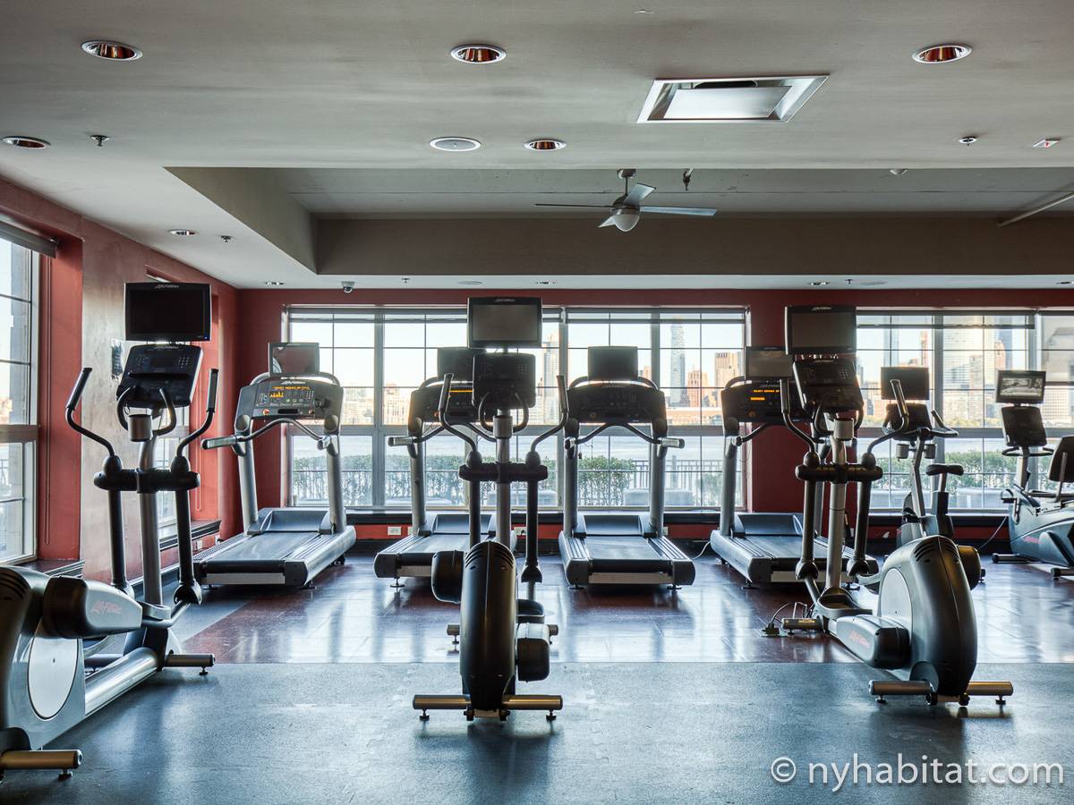 This apartment is located on the Hudson River in Jersey City. Here you may enjoy local restaurants or may go shopping at Newport Centre under a quarter mile away (around 400 meters).